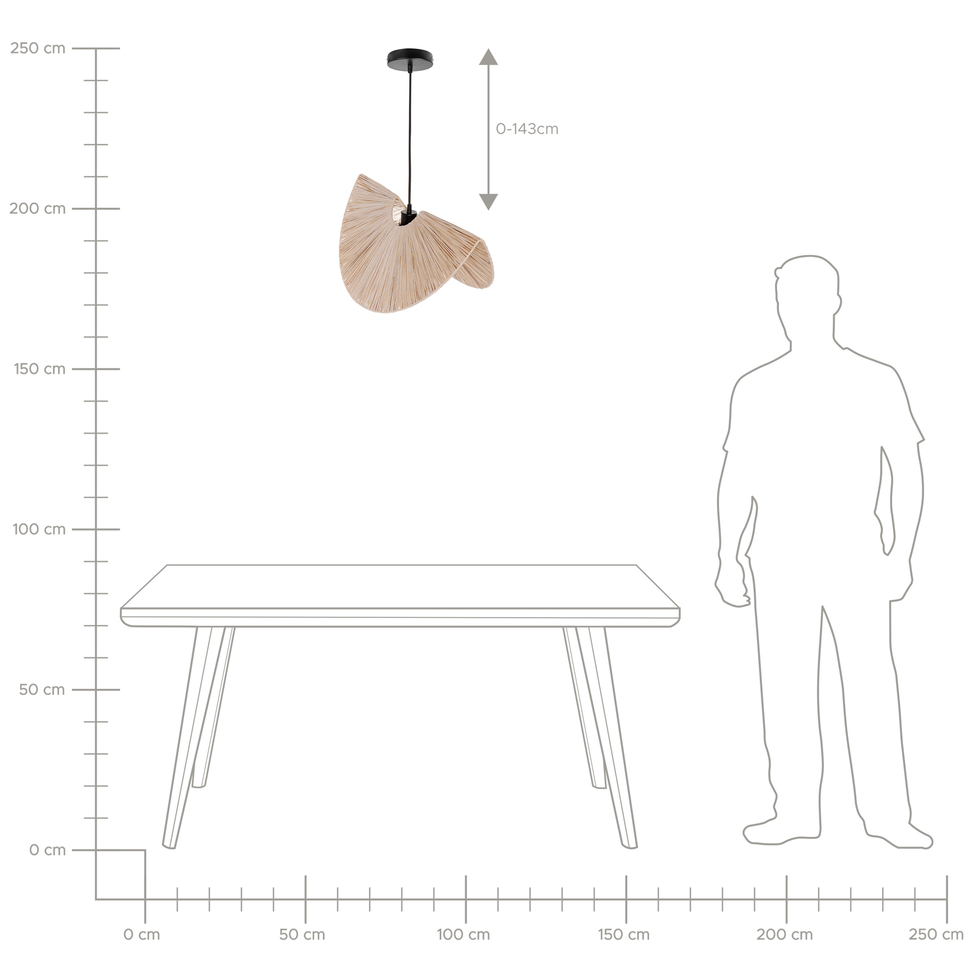 Diese mit Sorgfalt und Präzision handgefertigte Hängelampe wird Ihre Raumgestaltung auf ein neues Niveau heben. Ihr Lampenschirm besteht aus einem hellen Papiergeflecht und schwarzen Metalldetails, daher ist er sehr langlebig und benötigt keine tägliche Pflege, um viele Jahre lang zu halten. Durch den natürlichen Farbton passt die Raumleuchte perfekt zu Boho und rustikal inspirierten Räumen. Dank ihres offenen, halbrunden Schirms erzeugt sie ein starkes Licht, das problemlos einen grossen Essbereich oder Wohnraum beleuchten kann. Material: Papier. Zusätzliches Material: Eisen. Gewicht: 1.2 Montage: Installation benötigt Das Angebot beinhaltet: 1 x Hängeleuchte, Nicht im Lieferumfang enthalten: Leuchtmittel Höhe: 168 zusätzliche Information: Diese Leuchte ist geeignet für Leuchtmittel der Energieklassen A bis G auf einer Skala von A (sehr effizient) bis G (weniger effizient). Geeignet für: LED Leuchtmittel, Eco-Halogen Leuchtmittel, Energiesparleuchtmittel., Die Stromkabel dürfen nur von einem qualifizierten Elektriker angepasst werden., Die Lampe besitzt keinen eigenen Ein/Ausschalter und benötigt daher einen separaten Schalter an der Wand, Hinweis! Beschädigungsgefahr! Bitte verwenden Sie keine Messer oder andere spitze oder scharfe Gegenstände, um die Verpackung zu öffnen, da das Produkt sonst beschädigt werden könnte., Da jedes Produkt handgefertigt wird, kann es zu kleineren Abweichungen in der Farbe und der äusseren Struktur kommen. Diese Abweichungen stellen keinen Qualitätsmangel dar, sondern sind eine warentypische Eigenschaft. Breite: 60 Tiefe: 32 Art: Hängelampe Stil: Boho Allgemeine Farbe: Naturfarben Hauptmaterial: Papier Fassung: Max. 60 W