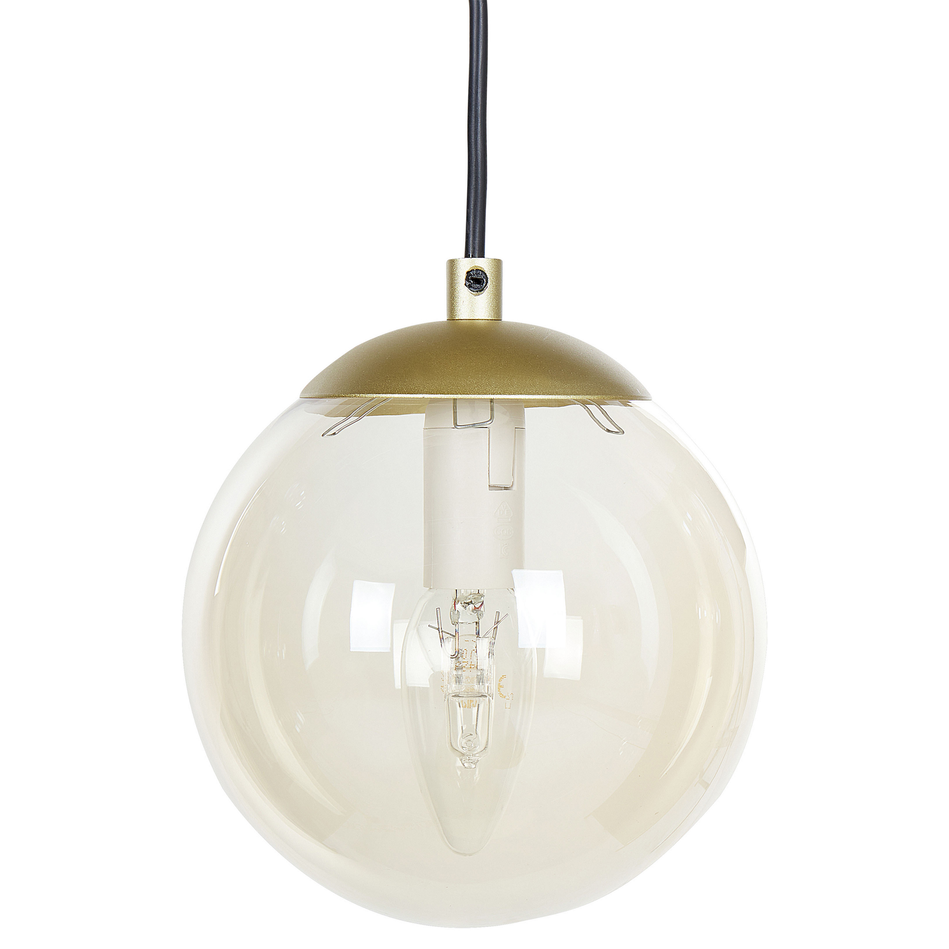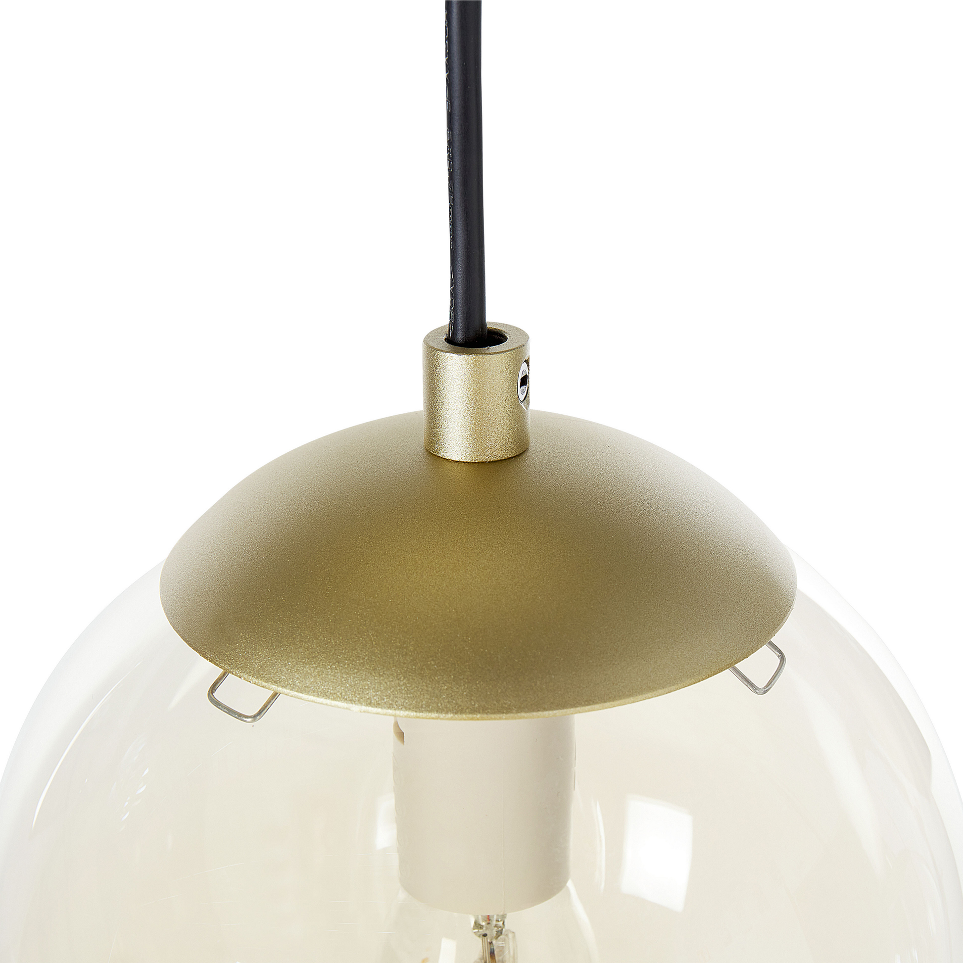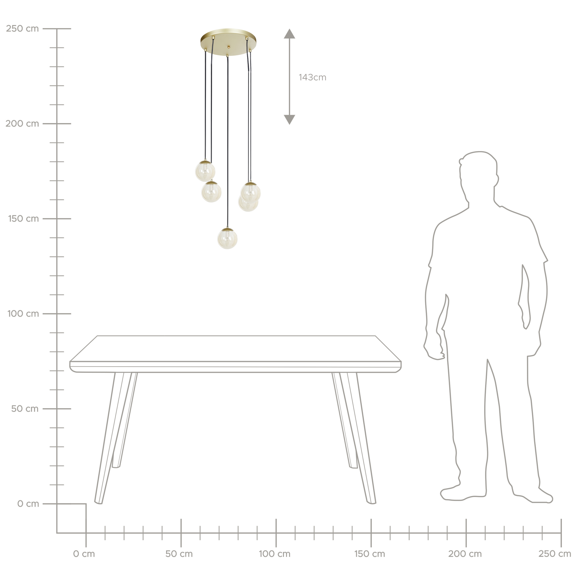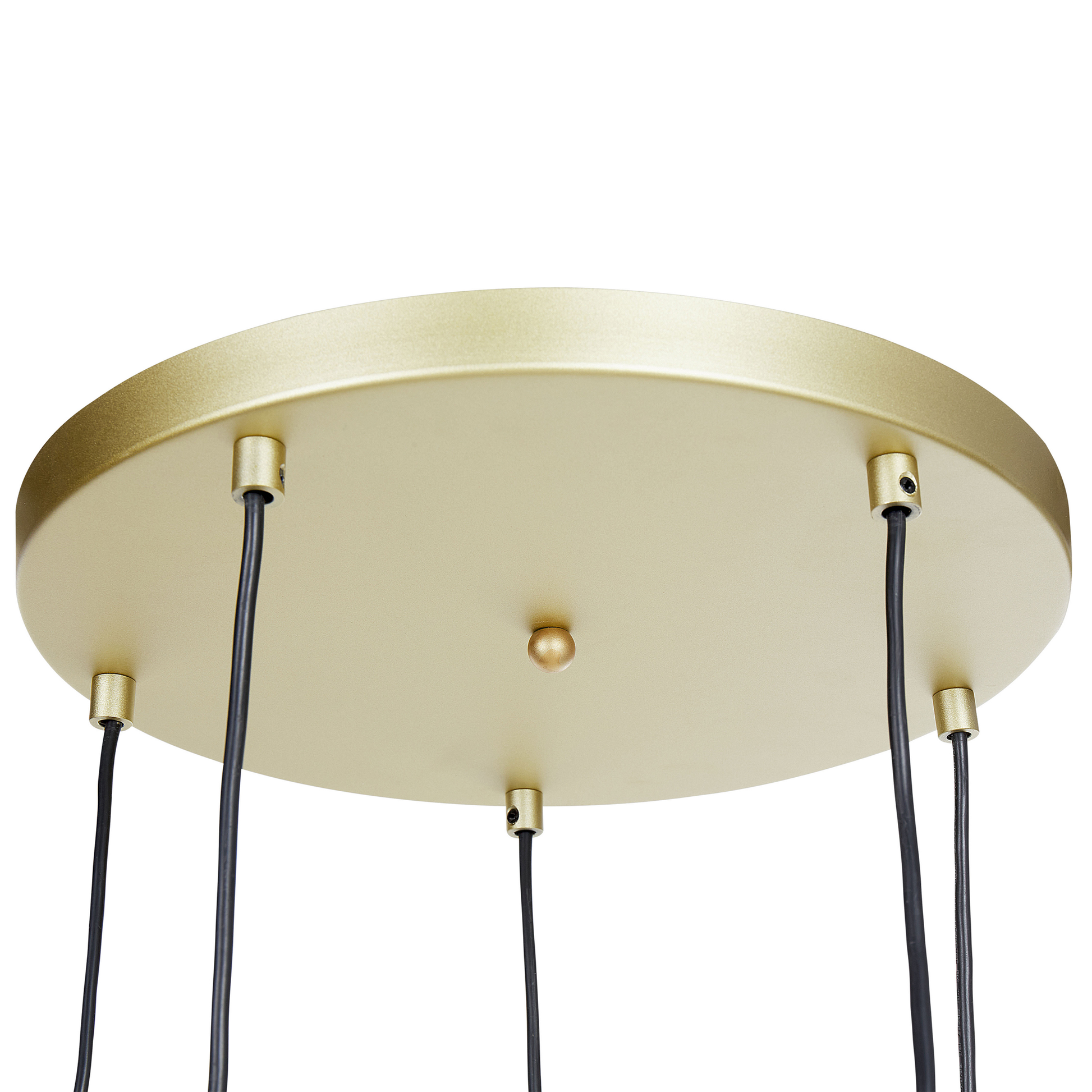 Definieren Sie Ihr Ambiente neu mit dieser 5-flammigen Hängeleuchte. Mit ihren goldenen Metalldetails und den runden Schirmen aus halbtransparenten Rauchglas in einem edlen Brenstein-Farbton strahlt sie eine moderne Raffinesse und einen glamourösen Look aus. Die mühelos schicke und pflegeleichte Leuchte strahlt ein sanftes, bezauberndes Licht aus, das Ihren Raum mit Beständigkeit und fesselndem Charme aufwertet. Material: Glas. Zusätzliches Material: Stahl. Gewicht: 2 Montage: Erfordert Installation und Montage Das Angebot beinhaltet: 1 x Hängeleuchte, Nicht im Lieferumfang enthalten: Leuchtmittel Höhe: 143 zusätzliche Information: Diese Leuchte ist geeignet für Leuchtmittel der Energieklassen A bis G auf einer Skala von A (sehr effizient) bis G (weniger effizient). Geeignet für: LED Leuchtmittel, Eco-Halogen Leuchtmittel, Energiesparleuchtmittel., Die Lampe besitzt keinen eigenen Ein/Ausschalter und benötigt daher einen separaten Schalter an der Wand, Die Stromkabel dürfen nur von einem qualifizierten Elektriker angepasst werden. Breite: 35 Tiefe: 35 Art: Hängelampe Stil: Modern Allgemeine Farbe: Gold Hauptmaterial: Glas Fassung: Max. 25 W IP Protection Code: IP 20
