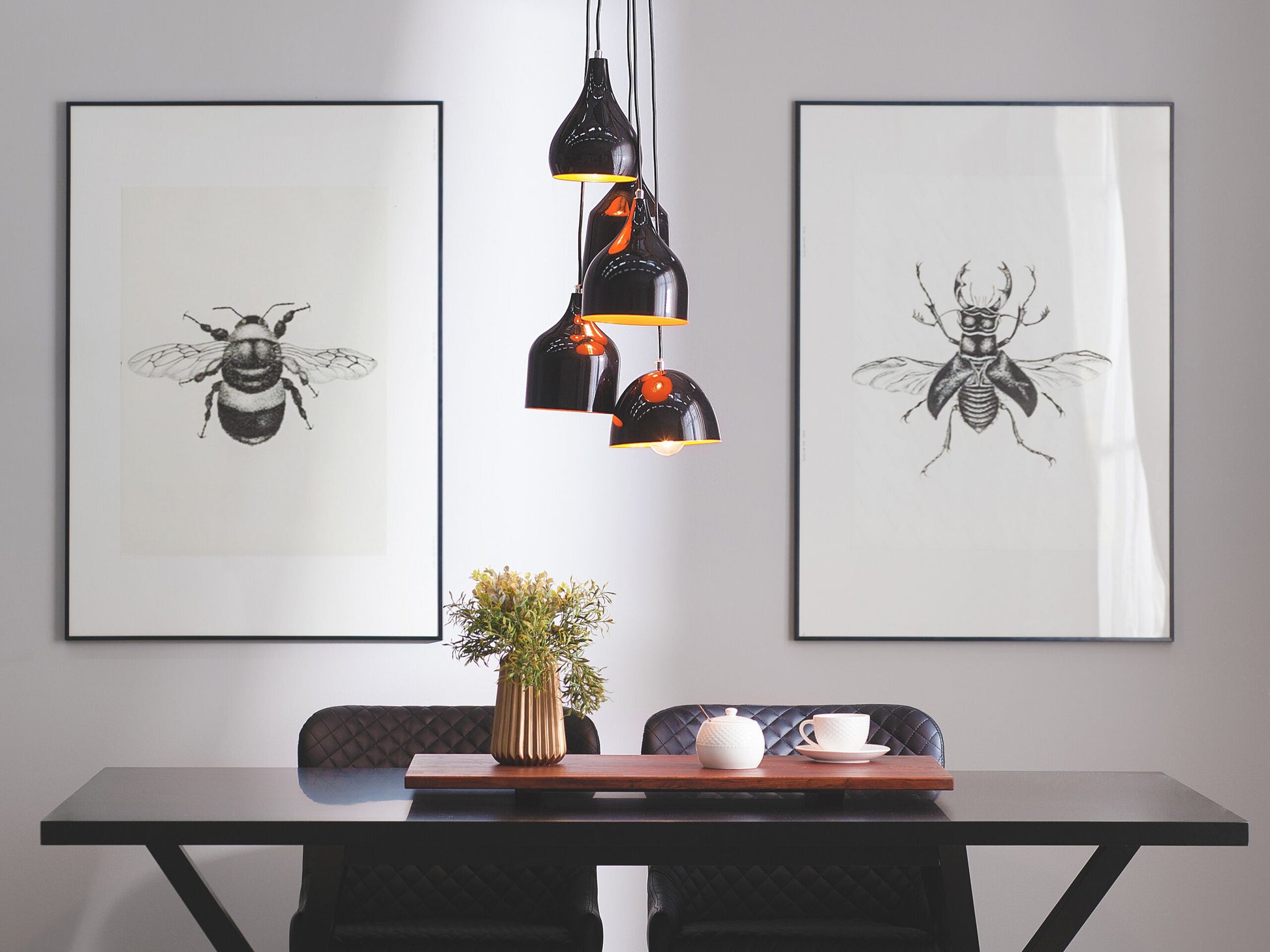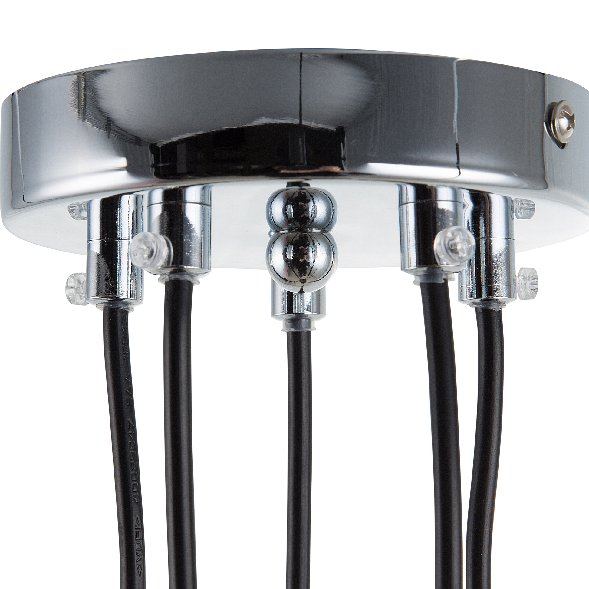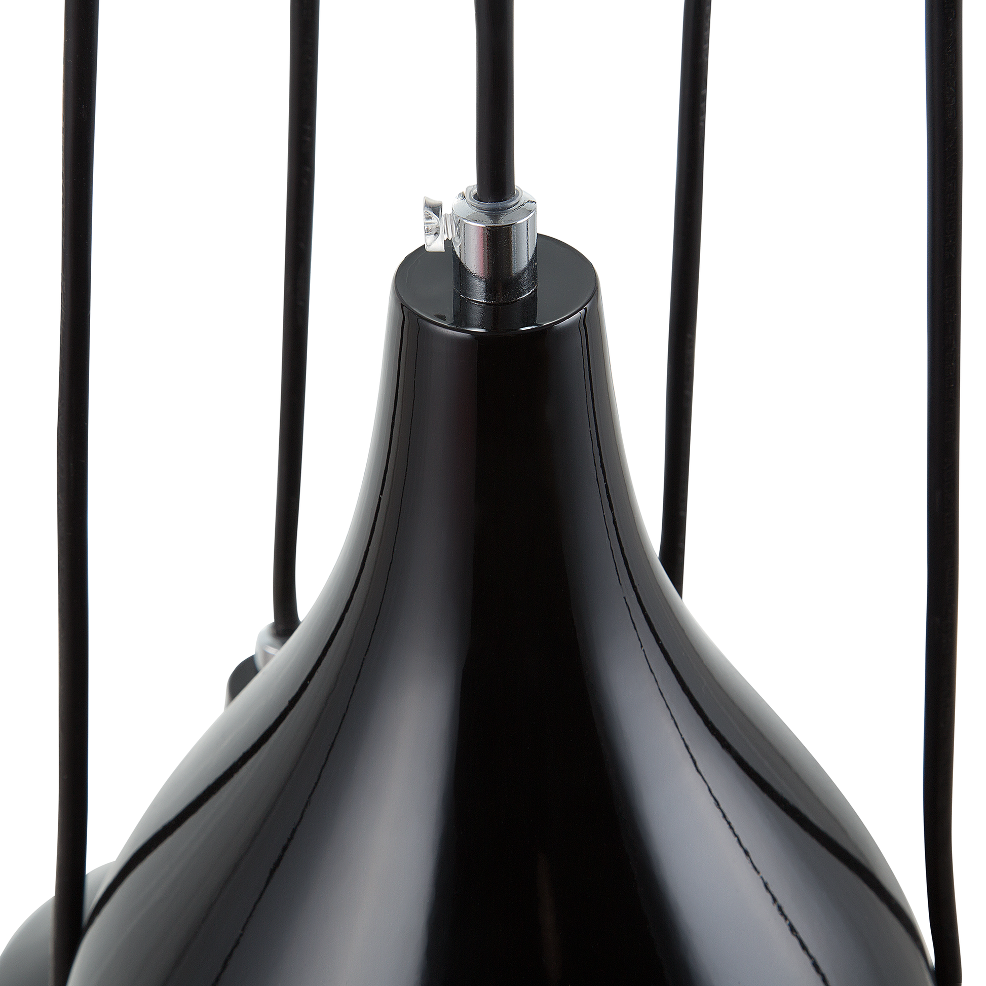 Beschreibung: Diese ausgefallene Hängelampe besteht aus 5 stylischen Lampenschirmen aus Metall, von aussen in Schwarz und innen in freundlichem Orange, auf unterschiedlichen Höhen und in verschiedenen Formen. Dank dieser Farb- und Formkombination wird die Lampe zum Hingucker in Ihrer Wohnung und fungiert nicht nur als praktische Leuchte mit strahlendem Licht, sondern als dekoratives Accessoir im Raum. Alle Lampenschirme hängen an separaten, schwarzen PVC Kabeln und sind an einem passenden, runden Baldachin befestigt Material: Eisen. Zusätzliches Material: PVC. Gewicht: 2.5 Montage: Installation benötigt Das Angebot beinhaltet: 1 x Hängeleuchte, Nicht im Lieferumfang enthalten: Leuchtmittel Höhe: 111 zusätzliche Information: Diese Leuchte ist geeignet für Leuchtmittel der Energieklassen A bis G auf einer Skala von A (sehr effizient) bis G (weniger effizient). Geeignet für: LED Leuchtmittel, Eco-Halogen Leuchtmittel, Energiesparleuchtmittel., Die Stromkabel dürfen nur von einem qualifizierten Elektriker angepasst werden. Breite: 18 Tiefe: 18 Art: Hängelampe Stil: Modern Allgemeine Farbe: Schwarz Hauptmaterial: Eisen Fassung: Max. 40 W IP Protection Code: IP 20