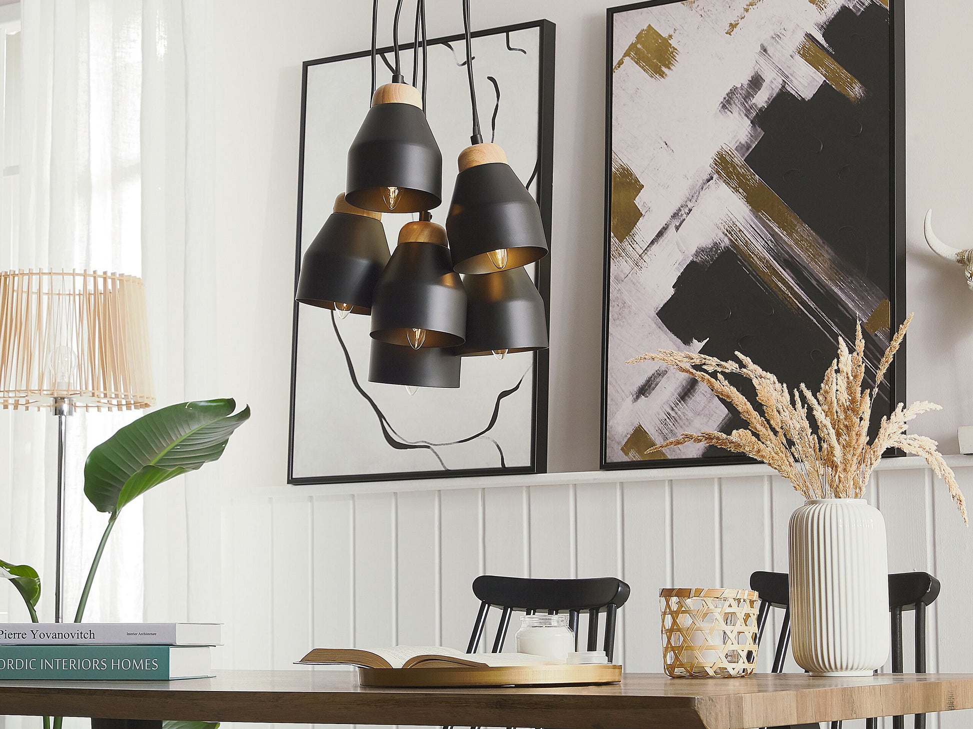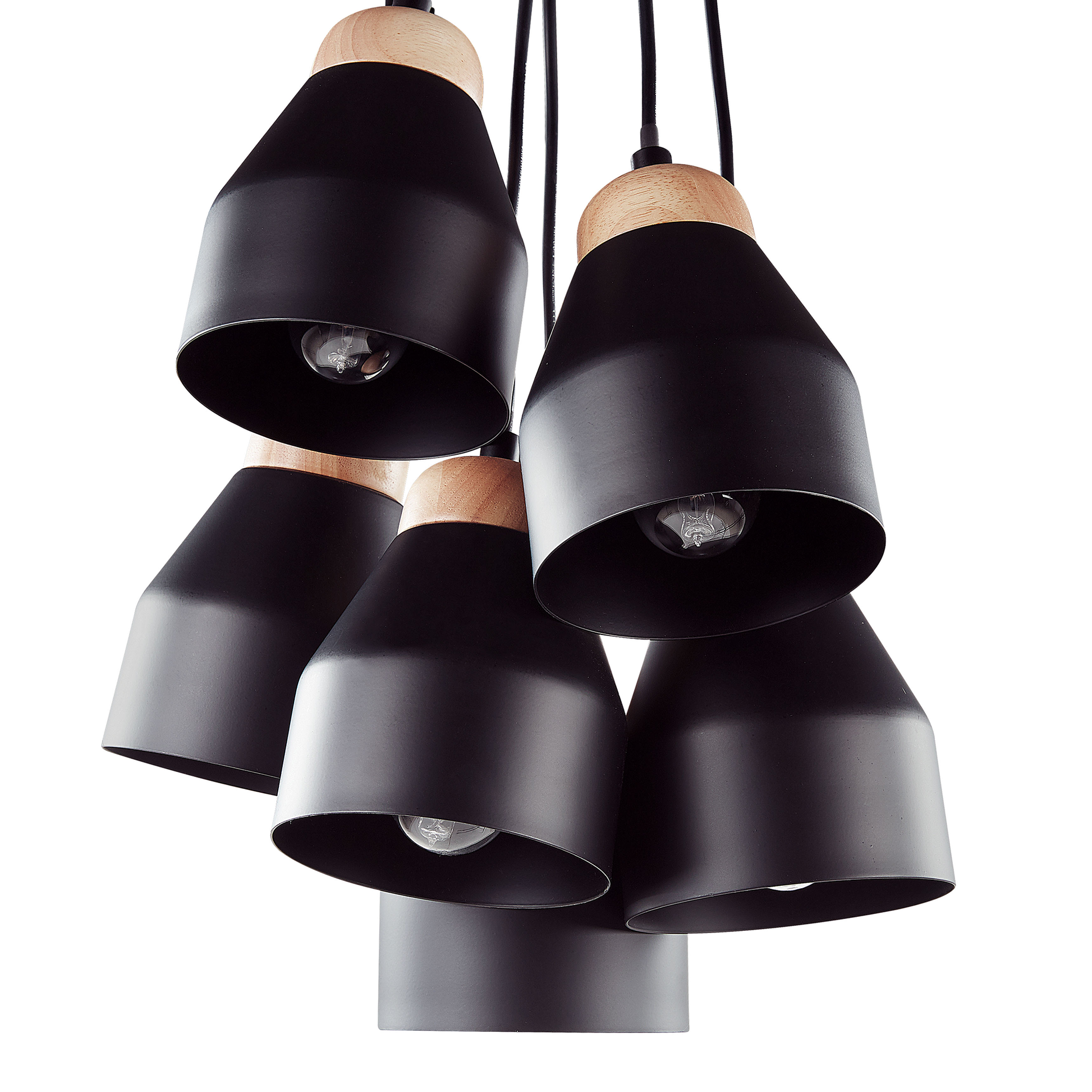 Die stylische Kombination von schwarzfarbenem Metall und hellem Holz macht diese Hängeleuchte zum Dekoelement schlechthin. Dank der sechs formschönen Schirme gibt die Lampe genug Licht und die passenden schwarzen Kabel sind leicht zu regulieren - so können Sie ihre Höhe immer ganz individuell und nach Ihren Wünschen anpassen. Material: Metall. Zusätzliches Material: PVC, Eichenholz. Gewicht: 3 Montage: Installation benötigt Holzart: Quercus variabilis Holzursprung: Vietnam Das Angebot beinhaltet: 1 x Hängeleuchte, Nicht im Lieferumfang enthalten: Leuchtmittel Höhe: 68 zusätzliche Information: Diese Leuchte ist geeignet für Leuchtmittel der Energieklassen A bis G auf einer Skala von A (sehr effizient) bis G (weniger effizient). Geeignet für: LED Leuchtmittel, Eco-Halogen Leuchtmittel, Energiesparleuchtmittel., Die Stromkabel dürfen nur von einem qualifizierten Elektriker angepasst werden. Breite: 12 Tiefe: 12 Art: Hängelampe Stil: Modern Allgemeine Farbe: Schwarz Hauptmaterial: Metall Fassung: Max. 40 W IP Protection Code: IP 20