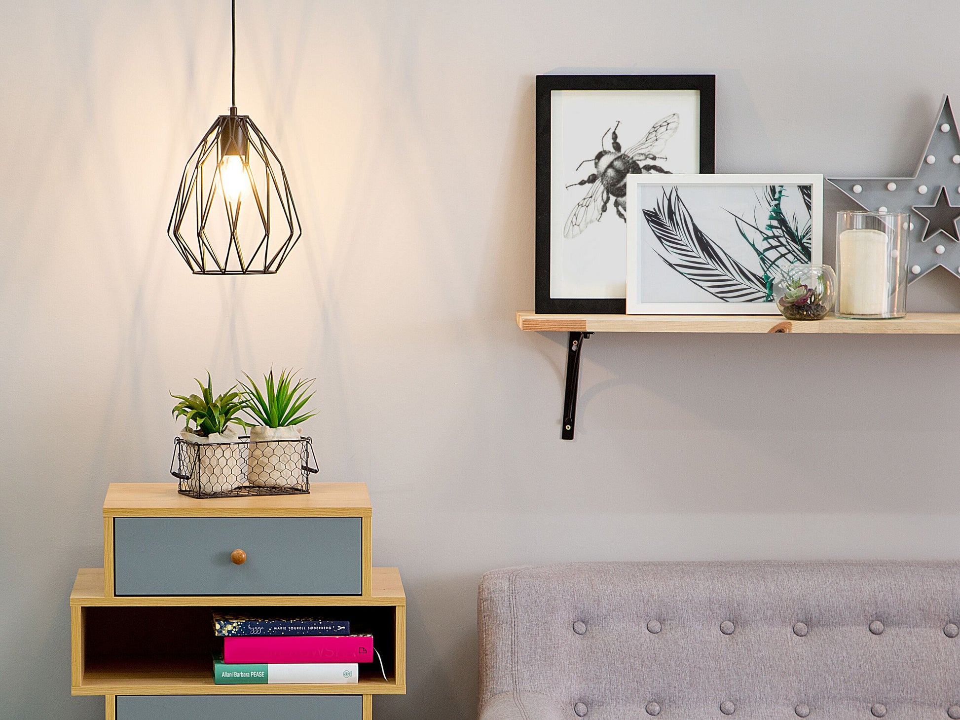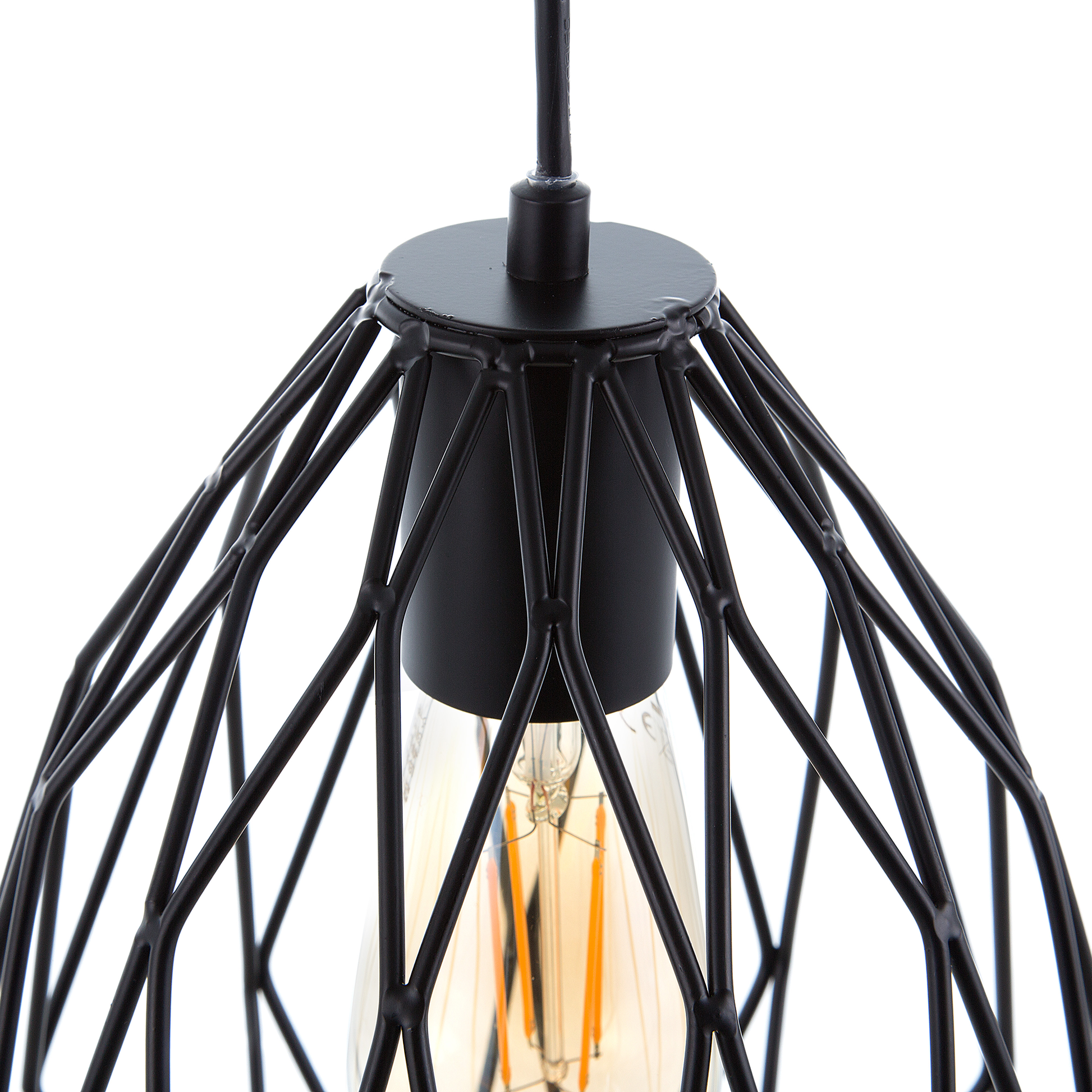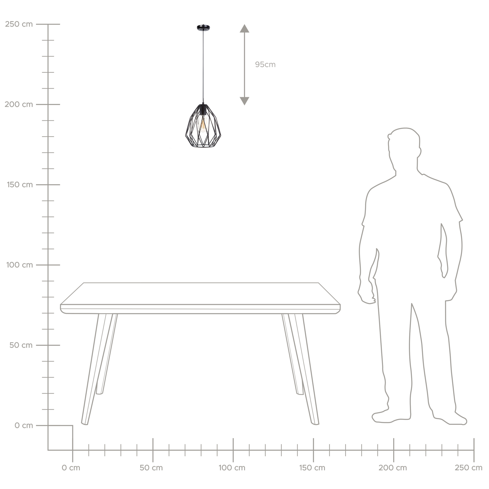 Der Lampenschirm der birnenförmigen Pendelleuchte besteht aus schwarzfarbenen Eisenstreben. Das Design erinnert an den luxuriösen Stil der 20er Jahre. Die offene Struktur der Eisenstreben sorgt für ein spannendes Licht- und Schattenspiel. Material: Eisen. Gewicht: 1 Montage: Installation benötigt Das Angebot beinhaltet: 1 x Hängeleuchte, Nicht im Lieferumfang enthalten: Leuchtmittel Höhe: 124 zusätzliche Information: Diese Leuchte ist geeignet für Leuchtmittel der Energieklassen A bis G auf einer Skala von A (sehr effizient) bis G (weniger effizient). Geeignet für: LED Leuchtmittel, Eco-Halogen Leuchtmittel, Energiesparleuchtmittel., Die Stromkabel dürfen nur von einem qualifizierten Elektriker angepasst werden. Breite: 22 Tiefe: 22 Art: Hängelampe Stil: Modern Allgemeine Farbe: Schwarz Hauptmaterial: Eisen Fassung: Max. 40 W IP Protection Code: IP 20