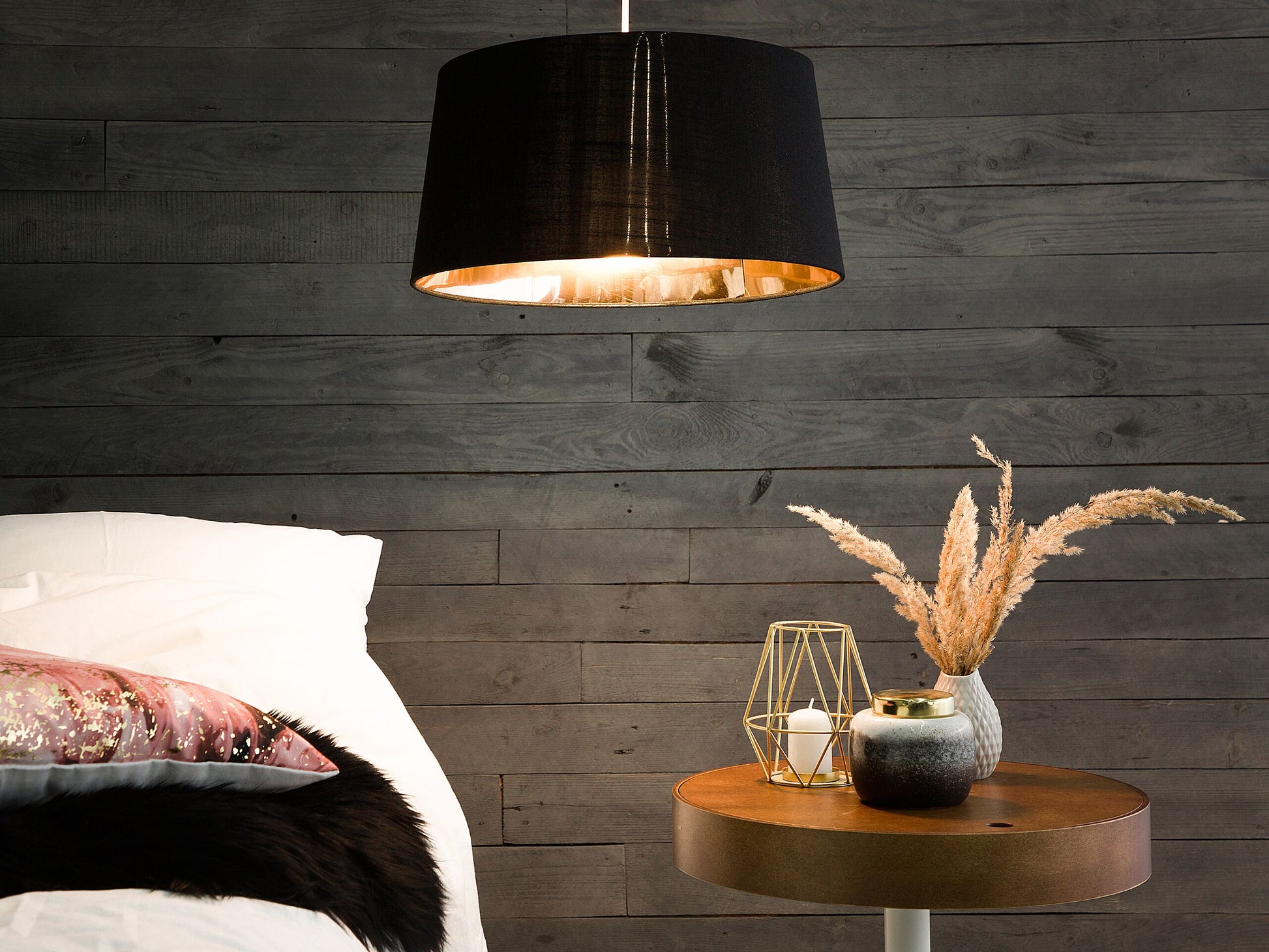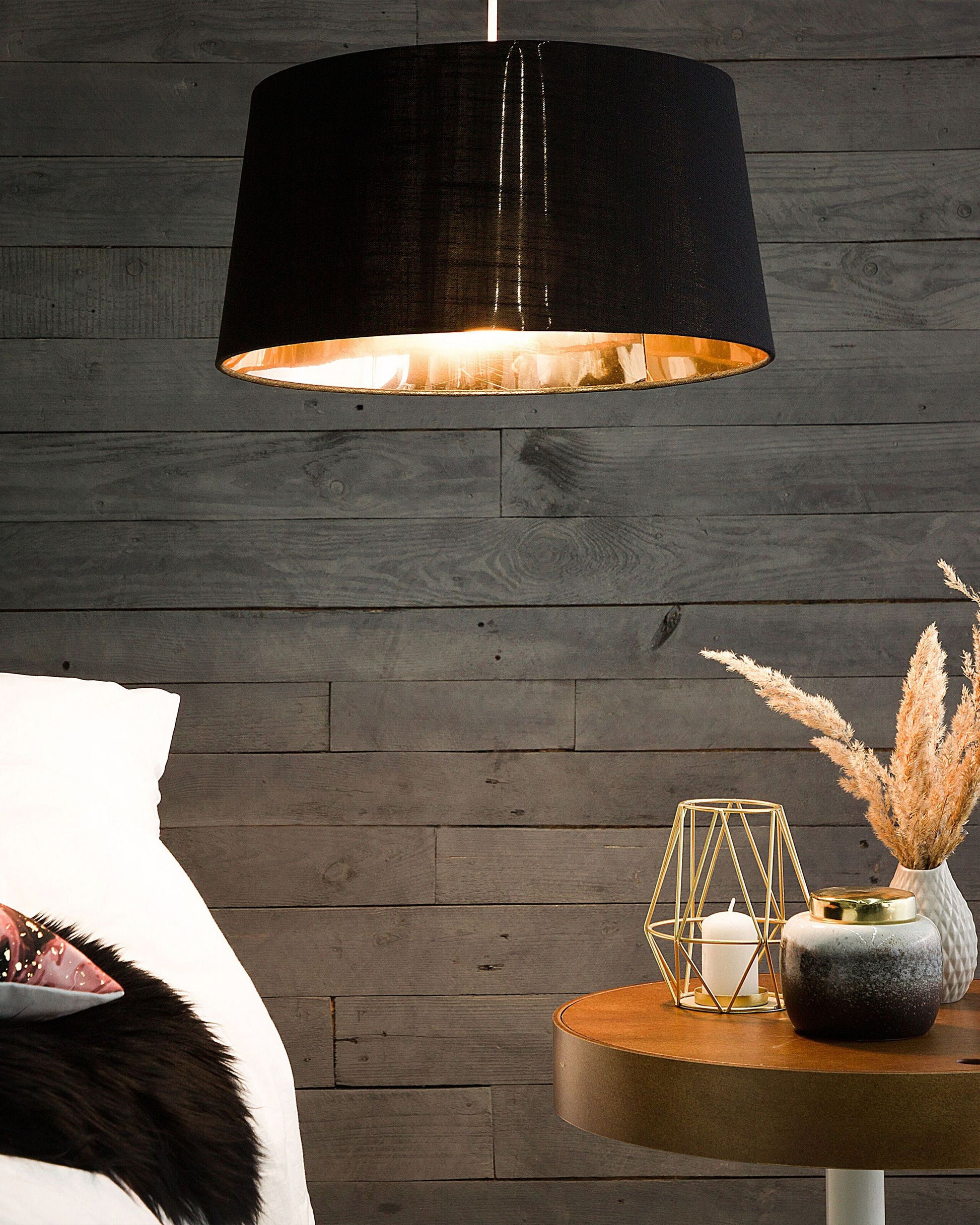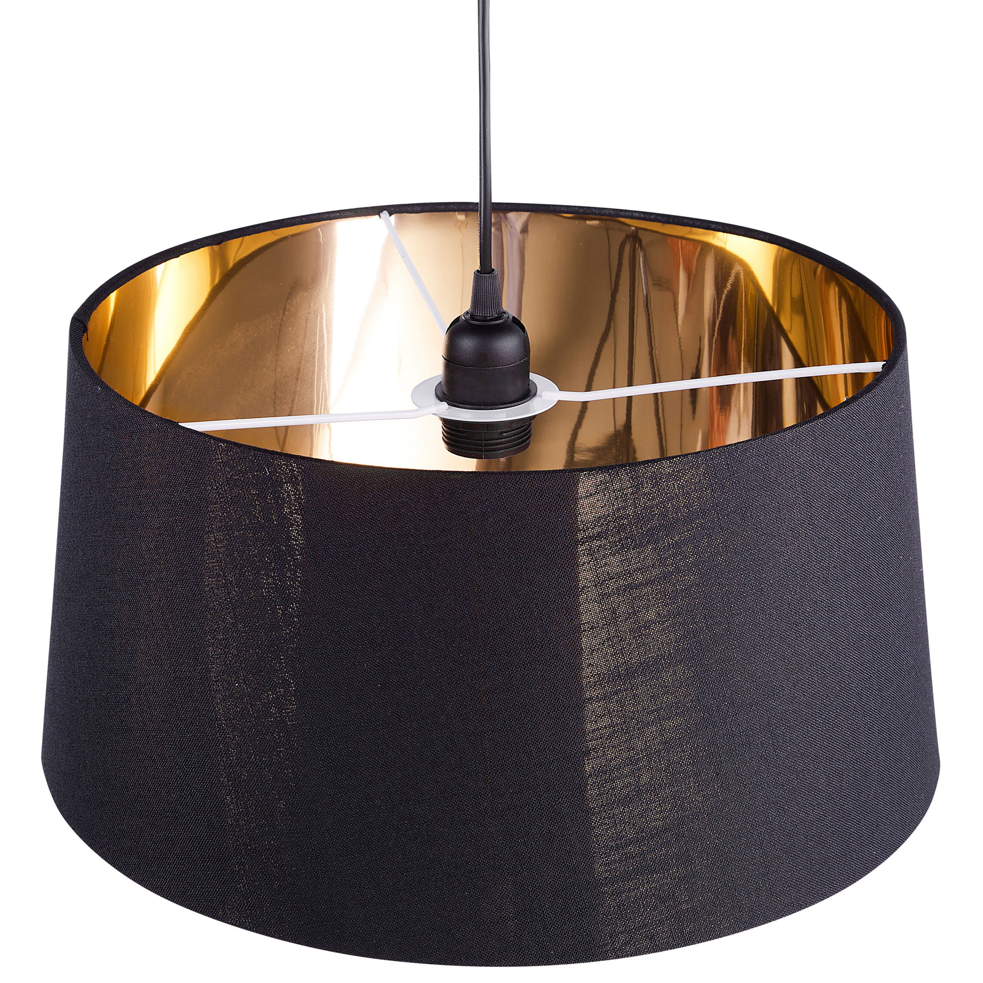 Diese universelle Pendelleuchte verleiht jeder Räumlichkeit eine klassische Note. Das glänzende Innere des Lampenschirms reflektiert die Lichtstrahlen und schafft somit eine glamouröse und funkelnde Atmosphäre. Ein schönes und zugleich funktionelles Accessoir für Ihr Heim. Material: Poly-Baumwolle. Zusätzliches Material: Kunststoff. Material Zusammensetzung: 80% Polyester, 20% Baumwolle Gewicht: 1 Montage: Installation benötigt Das Angebot beinhaltet: 1 x Hängeleuchte, Nicht im Lieferumfang enthalten: Leuchtmittel Höhe: 146 zusätzliche Information: Diese Leuchte ist geeignet für Leuchtmittel der Energieklassen A bis G auf einer Skala von A (sehr effizient) bis G (weniger effizient). Geeignet für: LED Leuchtmittel, Eco-Halogen Leuchtmittel, Energiesparleuchtmittel., Die Stromkabel dürfen nur von einem qualifizierten Elektriker angepasst werden. Breite: 40 Tiefe: 40 Art: Hängelampe Stil: Modern Allgemeine Farbe: Schwarz Hauptmaterial: Poly-Baumwolle Fassung: Max. 40 W IP Protection Code: IP 20