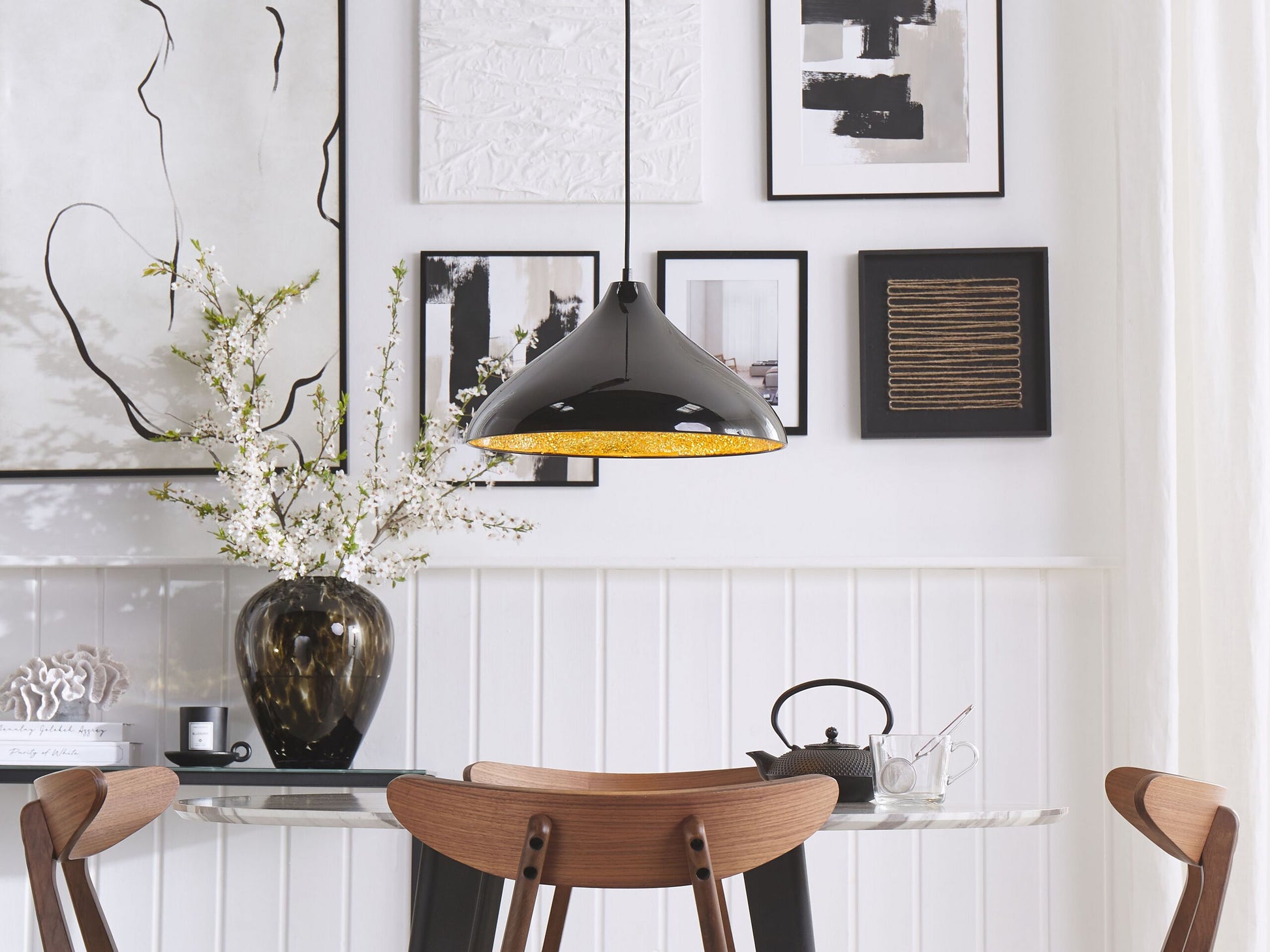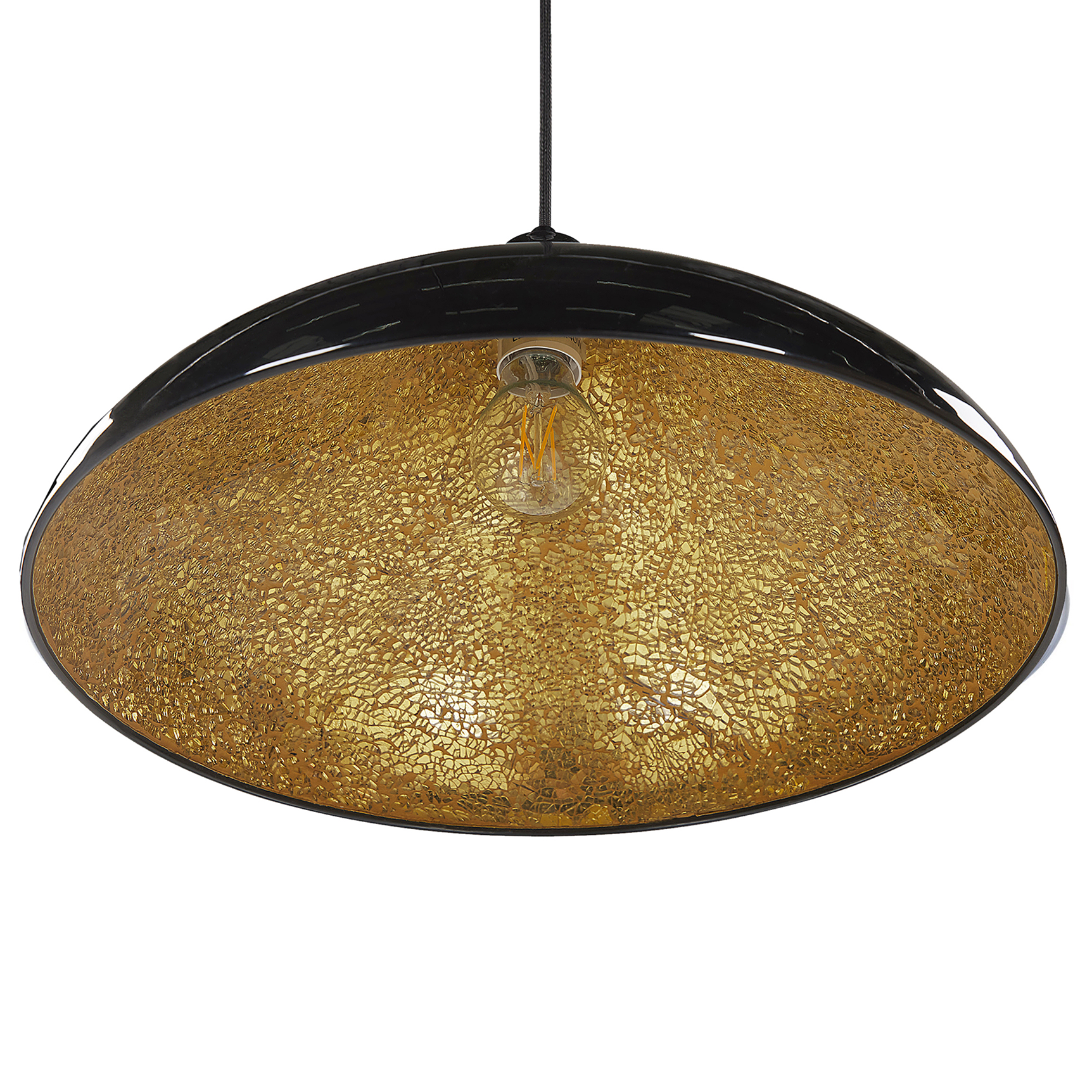 Die schlichte, runde Form der trendy Hängelampe wird perfekt ergänzt durch die ausgefallene Innenseite der Lampe in glitzernder Bruchglasoptik. Ein überraschendes Detail, welches diese exklusive Lampe zu einem absoluten Blickfänger macht. Trendy, modern, stilvoll und ausgefallen - diese fantastische Lampe bietet viel mehr als nur schönes Licht. Material: Metall. Zusätzliches Material: Glas, PVC. Gewicht: 4 Montage: Installation benötigt Das Angebot beinhaltet: 1 x Hängeleuchte, Nicht im Lieferumfang enthalten: Leuchtmittel Höhe: 125 zusätzliche Information: Diese Leuchte ist geeignet für Leuchtmittel der Energieklassen A bis G auf einer Skala von A (sehr effizient) bis G (weniger effizient). Geeignet für: LED Leuchtmittel, Eco-Halogen Leuchtmittel, Energiesparleuchtmittel., Die Stromkabel dürfen nur von einem qualifizierten Elektriker angepasst werden. Breite: 40 Tiefe: 40 Art: Hängeleuchte Stil: Modern Allgemeine Farbe: Schwarz Hauptmaterial: Metall Fassung: Max. 40 W IP Protection Code: IP 20