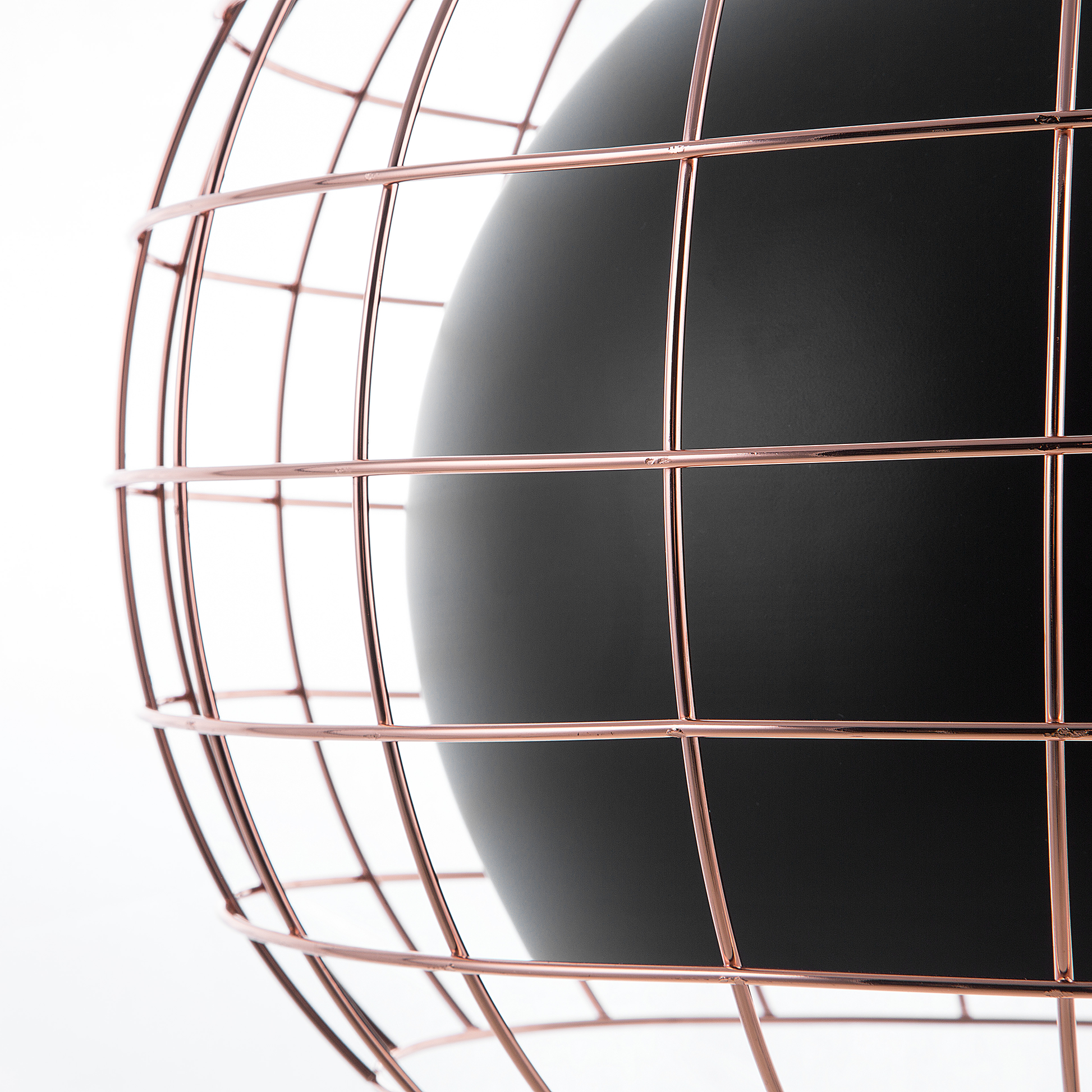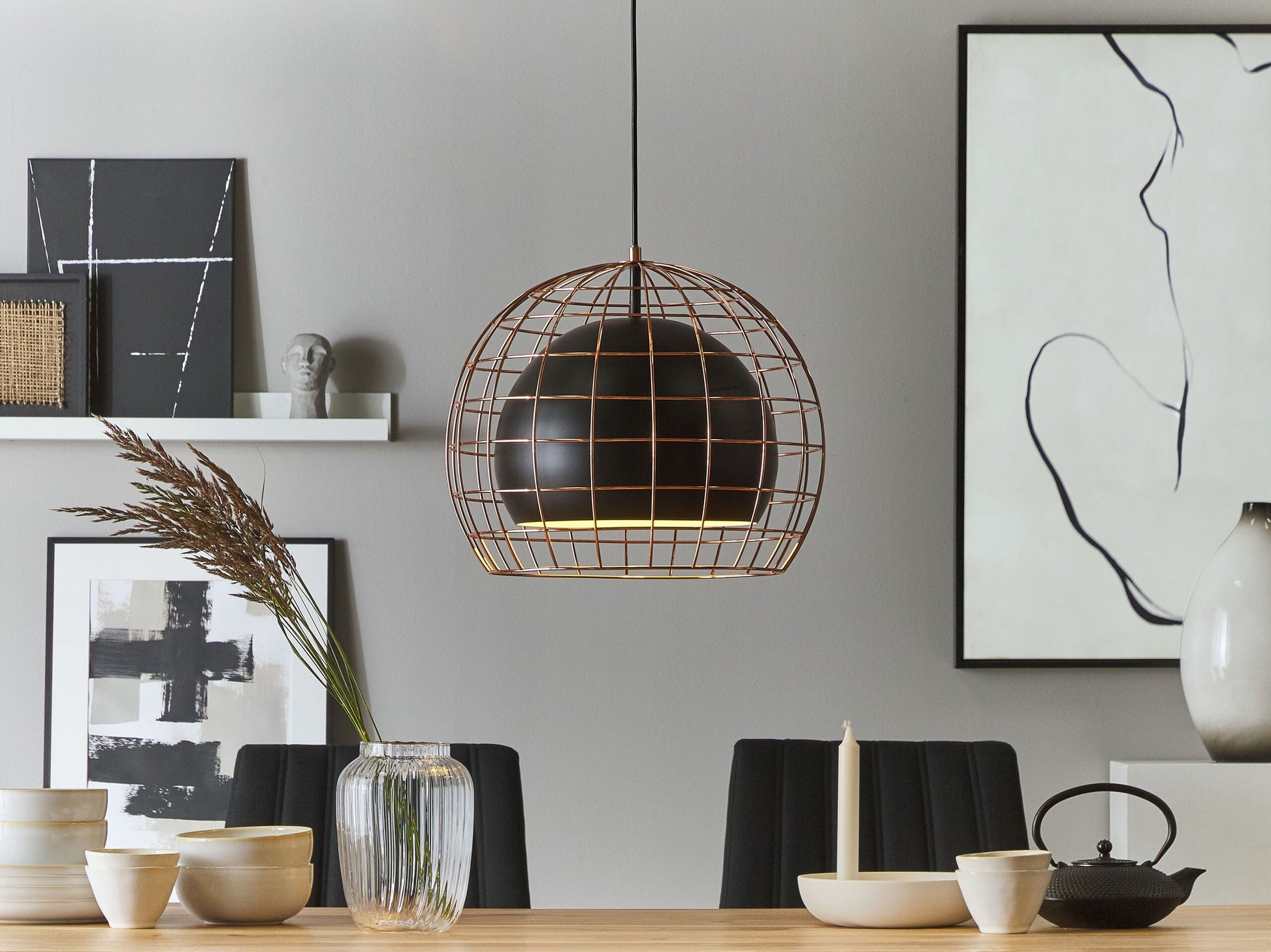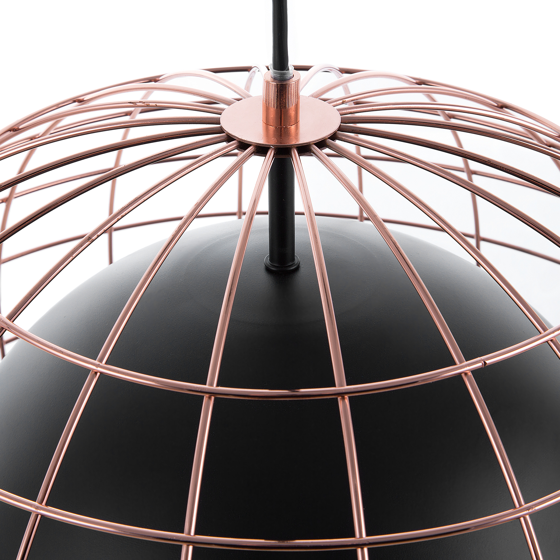 Diese ausgefallene Hängelampe scheint zwei unterschiedliche Lampenschirme zu einer besonders raffinierten Lampe zu vereinen. Der innere, runde Lampenschirm mit seiner glänzenden, schwarzen Oberfläche wird von einem Gitter aus kupferfarbenem Metall umgeben. Die offene Struktur erlaubt den Blick auf den inneren Lampenschirm und sorgt so für einen spannenden Effekt und industriellen Charme. Der clevere Farb- und Materialmix lässt die Lampe zu einem aussergewöhnlichen Designobjekt in jedem Interieur werden. Material: Eisen. Zusätzliches Material: PVC. Gewicht: 3 Montage: Installation benötigt Das Angebot beinhaltet: 1 x Hängeleuchte, Nicht im Lieferumfang enthalten: Leuchtmittel Höhe: 128 zusätzliche Information: Diese Leuchte ist geeignet für Leuchtmittel der Energieklassen A bis G auf einer Skala von A (sehr effizient) bis G (weniger effizient). Geeignet für: LED Leuchtmittel, Eco-Halogen Leuchtmittel, Energiesparleuchtmittel., Die Stromkabel dürfen nur von einem qualifizierten Elektriker angepasst werden. Breite: 38 Tiefe: 38 Art: Hängelampe Stil: Modern Allgemeine Farbe: Schwarz Hauptmaterial: Eisen Fassung: Max. 40 W IP Protection Code: IP 20