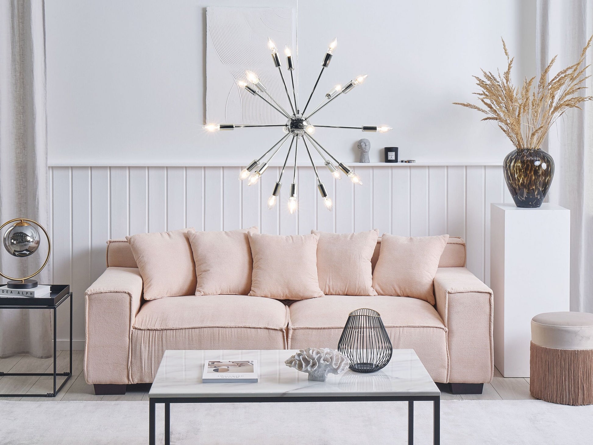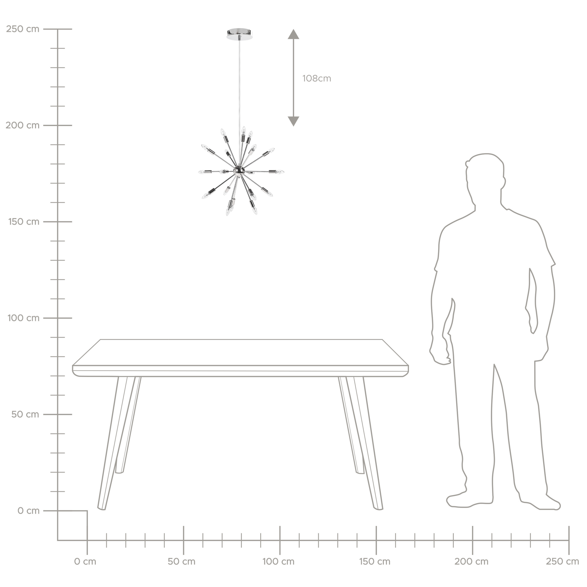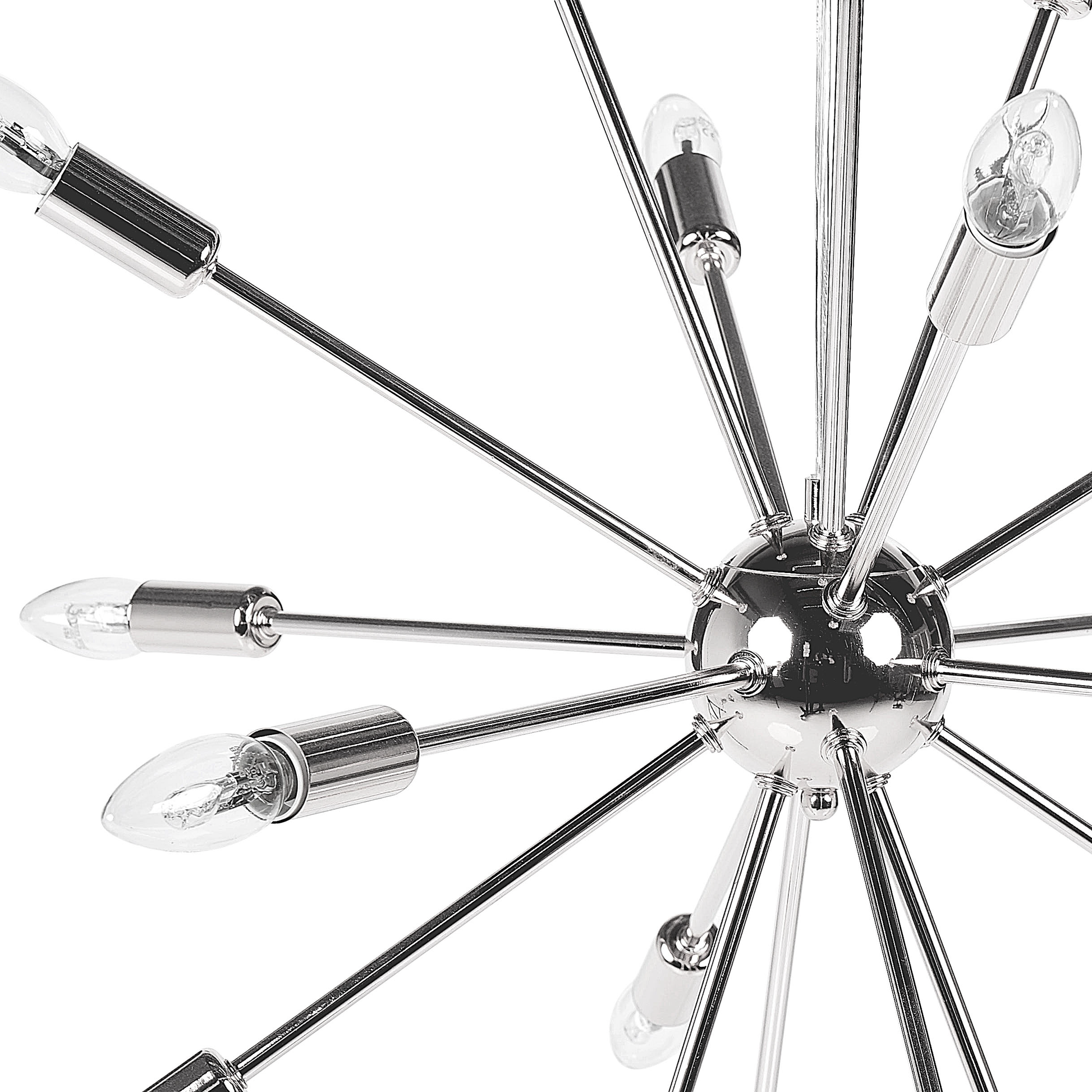 Ein toller Lichtakzent am Esstisch. Das extravagante, prachtvolle Aussehen der dekorativen Lichtergruppe aus Eisen macht sie zu einem wahren Blickfang. Zudem, ist sie nicht nur ein wunderschönes Wohnaccessoire, sondern sorgt mit ihrem Licht auch für eine angenehme, warme Stimmung im Raum, die wirklich einmalig ist. Material: Eisen. Zusätzliches Material: PVC. Gewicht: 2 Montage: Erfordert Installation und Montage Das Angebot beinhaltet: 1 x Hängeleuchte, Nicht im Lieferumfang enthalten: Leuchtmittel Höhe: 149 zusätzliche Information: Diese Leuchte ist geeignet für Leuchtmittel der Energieklassen A bis G auf einer Skala von A (sehr effizient) bis G (weniger effizient). Geeignet für: LED Leuchtmittel, Eco-Halogen Leuchtmittel, Energiesparleuchtmittel., Die Stromkabel dürfen nur von einem qualifizierten Elektriker angepasst werden. Breite: 59 Tiefe: 59 Art: Hängelampe Stil: Modern Allgemeine Farbe: Silber Hauptmaterial: Eisen Fassung: Max. 40 W IP Protection Code: IP 20