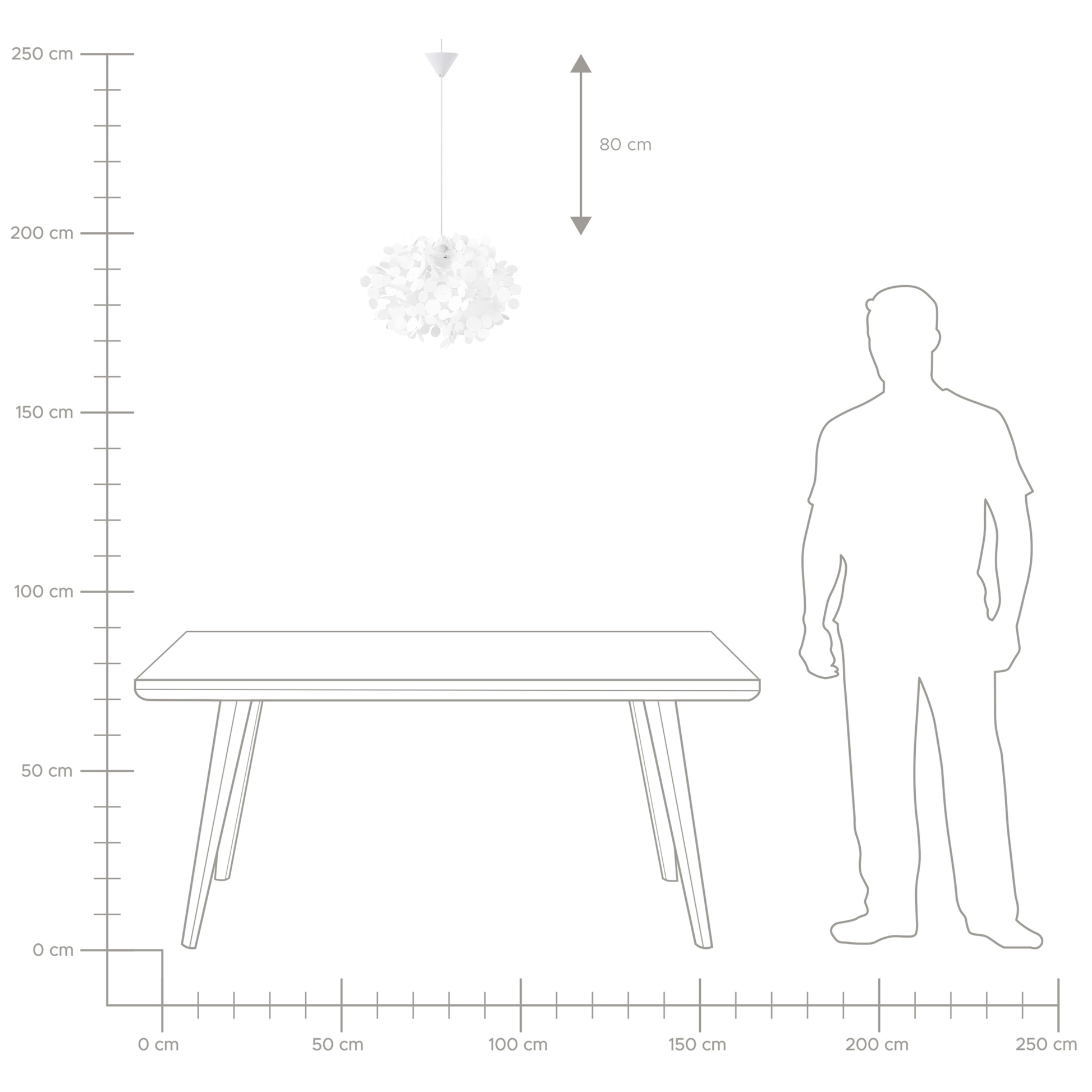 Dank ihrer ausgefallenen und extravaganten Formgebung lässt sich diese Hängeleuchte wunderbar mit jedem Einrichtungsstil kombinieren. Die vielen Kunststoffelemente wirken wie Blumenblüten, sind in schlichtem Weiss gehalten und werden raffiniert zusammengesteckt. Somit erhält der Lampenschirm eine verspielte Ausstrahlung und schafft traumhaft schöne Licht- und Schatteneffekte. Material: Kunststoff. Gewicht: 1 Montage: Nicht montiert Das Angebot beinhaltet: 1 x Hängeleuchte, Nicht im Lieferumfang enthalten: Leuchtmittel Höhe: 120 zusätzliche Information: Diese Leuchte ist geeignet für Leuchtmittel der Energieklassen A bis G auf einer Skala von A (sehr effizient) bis G (weniger effizient). Geeignet für: LED Leuchtmittel, Eco-Halogen Leuchtmittel, Energiesparleuchtmittel., Die Stromkabel dürfen nur von einem qualifizierten Elektriker angepasst werden. Breite: 40 Tiefe: 40 Art: Hängelampe Stil: Modern Allgemeine Farbe: Weiss Schatten: Cremeweiss Hauptmaterial: Kunststoff Fassung: Max. 40 W IP Protection Code: IP 20