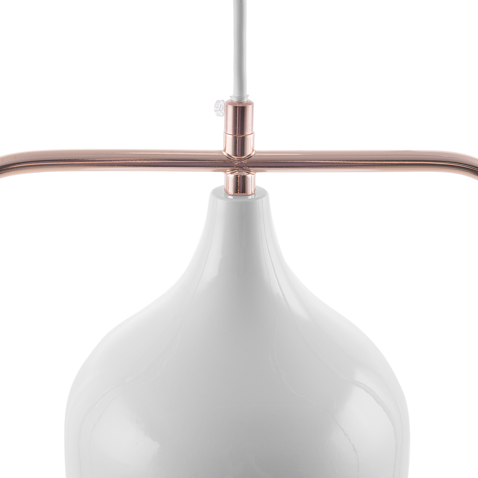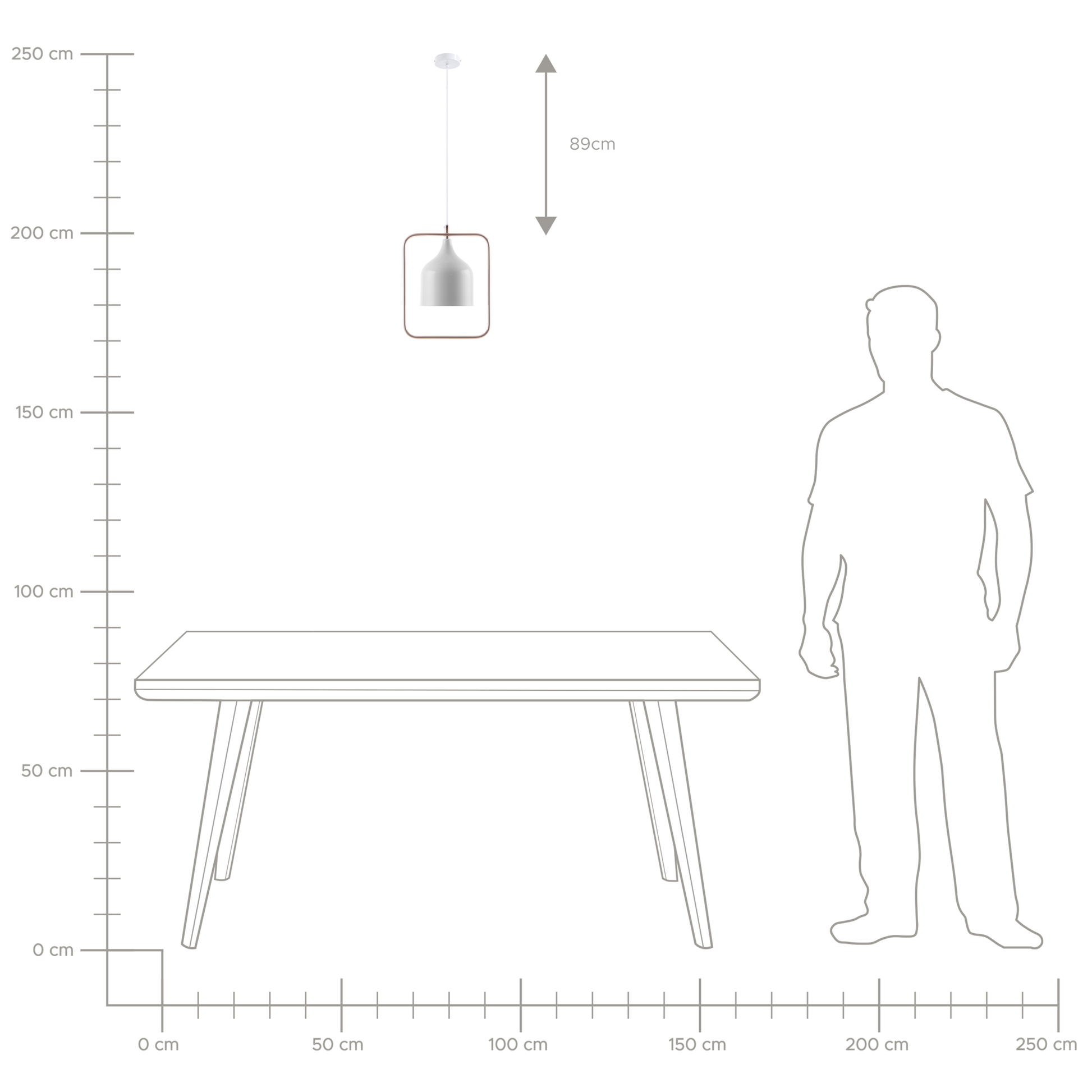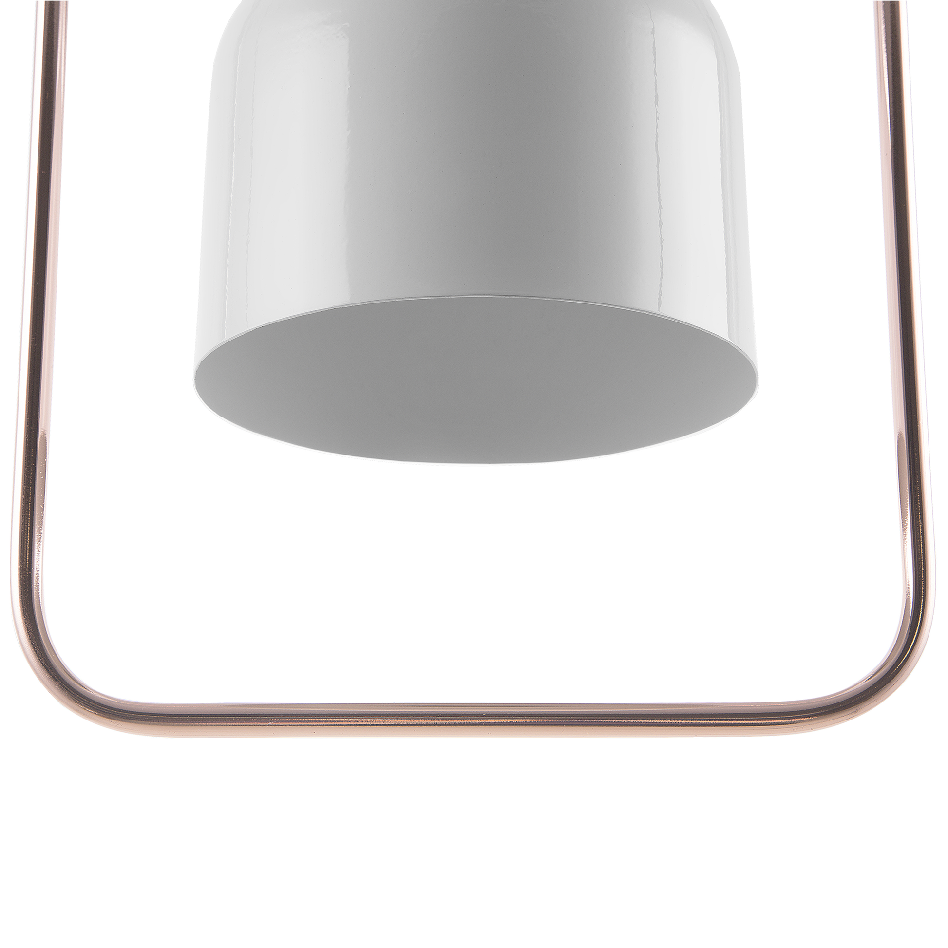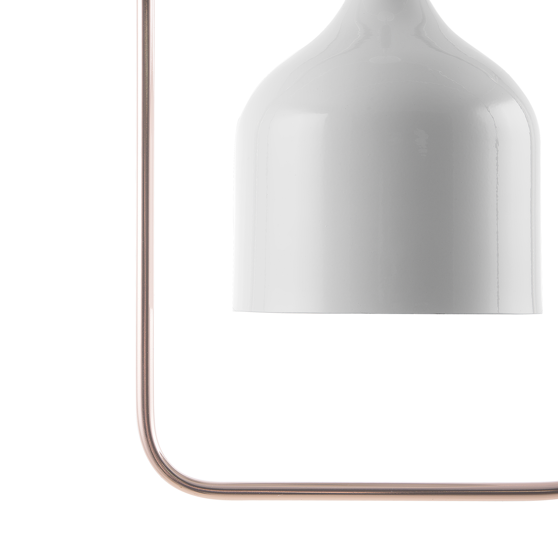 Eine rechteckige Umrandung aus kupferfarbenem Metall mit abgerundeten Kanten umrahmt den runden, gebogenen Lampenschirm aus weissem Metall wie ein Bilderrahmen. So wird die ausgefallene Hängelampe mit ihrem industriellen Charme und dem spannenden Farbkontrast aus Weiss und Kupfer zu einem aussergewöhnlichen Kunstwerk. Die Lampe lässt sich in allen Wohn- und Arbeitsbereichen nutzen und passt besonders gut zu modernen, industriellen und eigensinnigen Einrichtungsstilen. Material: Eisen. Zusätzliches Material: PVC. Gewicht: 0.8 Montage: Installation benötigt Das Angebot beinhaltet: 1 x Hängeleuchte, Nicht im Lieferumfang enthalten: Leuchtmittel Höhe: 121 zusätzliche Information: Diese Leuchte ist geeignet für Leuchtmittel der Energieklassen A bis G auf einer Skala von A (sehr effizient) bis G (weniger effizient). Geeignet für: LED Leuchtmittel, Eco-Halogen Leuchtmittel, Energiesparleuchtmittel., Die Stromkabel dürfen nur von einem qualifizierten Elektriker angepasst werden. Breite: 24 Tiefe: 15 Art: Hängelampe Stil: Modern Allgemeine Farbe: Weiss Hauptmaterial: Eisen Fassung: Max. 40 W IP Protection Code: IP 20