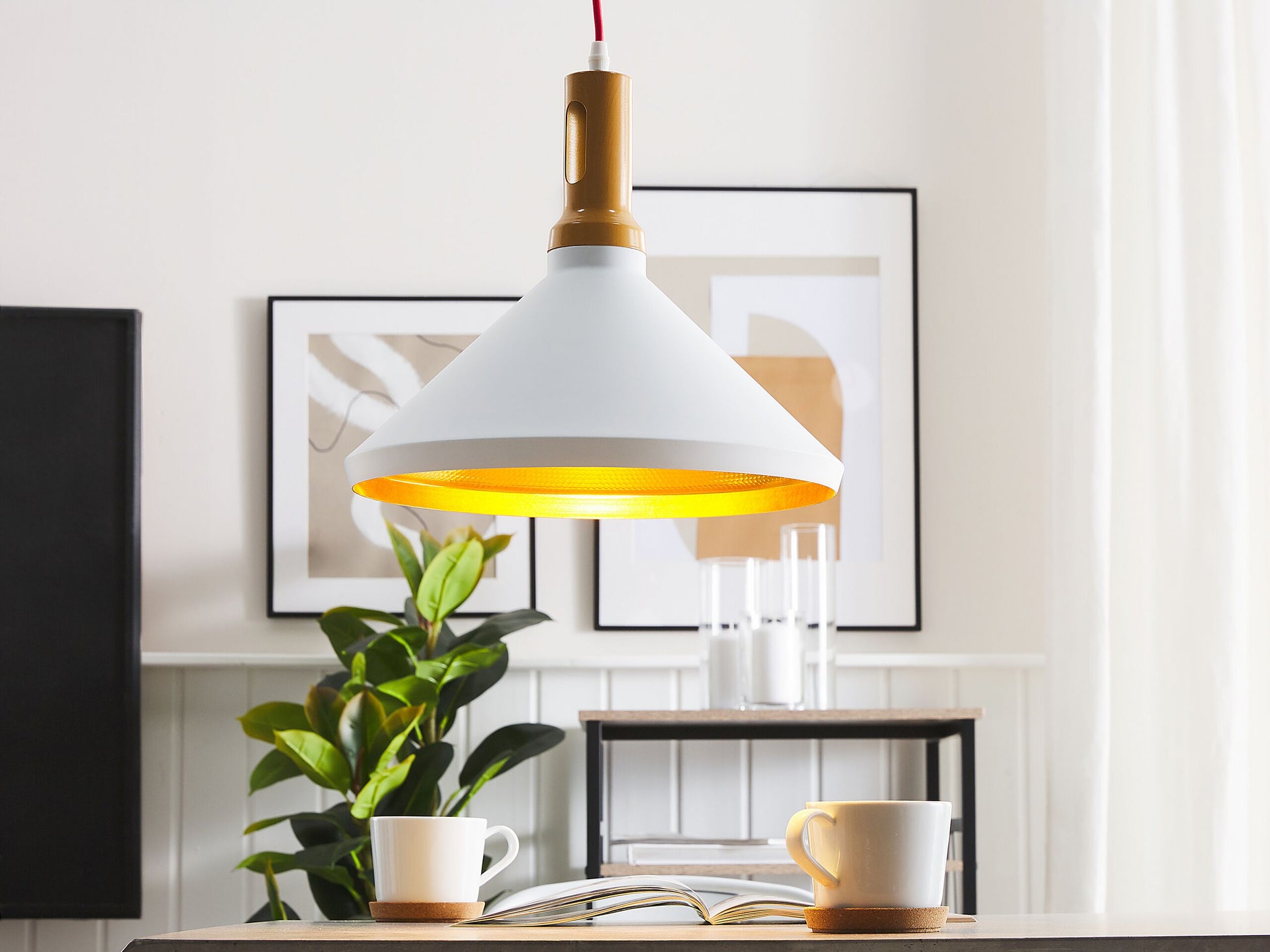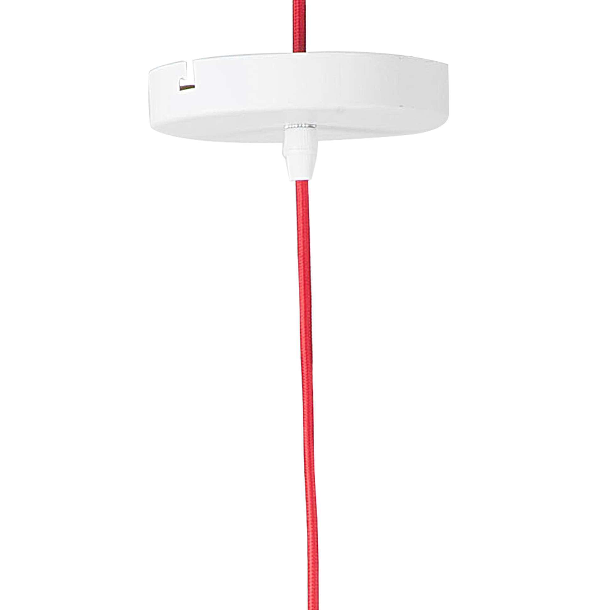 Diese ausgefallene Hängeleuchte ist dank ihrer Farb- und Materialzusammenstellung eine vielseitige Ergänzung für alle modernen, industriellen und individualistischen Wohn- und Arbeitsbereiche. Der runde, breite Lampenschirm aus Aluminium mit einer Aussenseite in mattem Weiss wirkt besonders edel. Die Spitze des Lampenschirms ist aus hellem Kunstoff in Holz-Optik gefertigt und verleiht der modernen Leuchte ein pfiffiges Detail. Einen weiteren, schönen Kontrast bietet die golden glänzende Innenseite, die für einen wunderschön reflektierten, warmen Lichtschein sorgt. Die Lampe ist mit einem roten Kabel versehen. Material: Aluminium. Zusätzliches Material: Kunststoff, PVC. Gewicht: 1 Montage: Installation benötigt Das Angebot beinhaltet: 1 x Hängeleuchte, Nicht im Lieferumfang enthalten: Leuchtmittel Höhe: 179 zusätzliche Information: Diese Leuchte ist geeignet für Leuchtmittel der Energieklassen A bis G auf einer Skala von A (sehr effizient) bis G (weniger effizient). Geeignet für: LED Leuchtmittel, Eco-Halogen Leuchtmittel, Energiesparleuchtmittel., Die Stromkabel dürfen nur von einem qualifizierten Elektriker angepasst werden. Breite: 33 Tiefe: 33 Art: Hängelampe Stil: Modern Allgemeine Farbe: Weiss Hauptmaterial: Aluminium Fassung: Max. 60 W IP Protection Code: IP 20