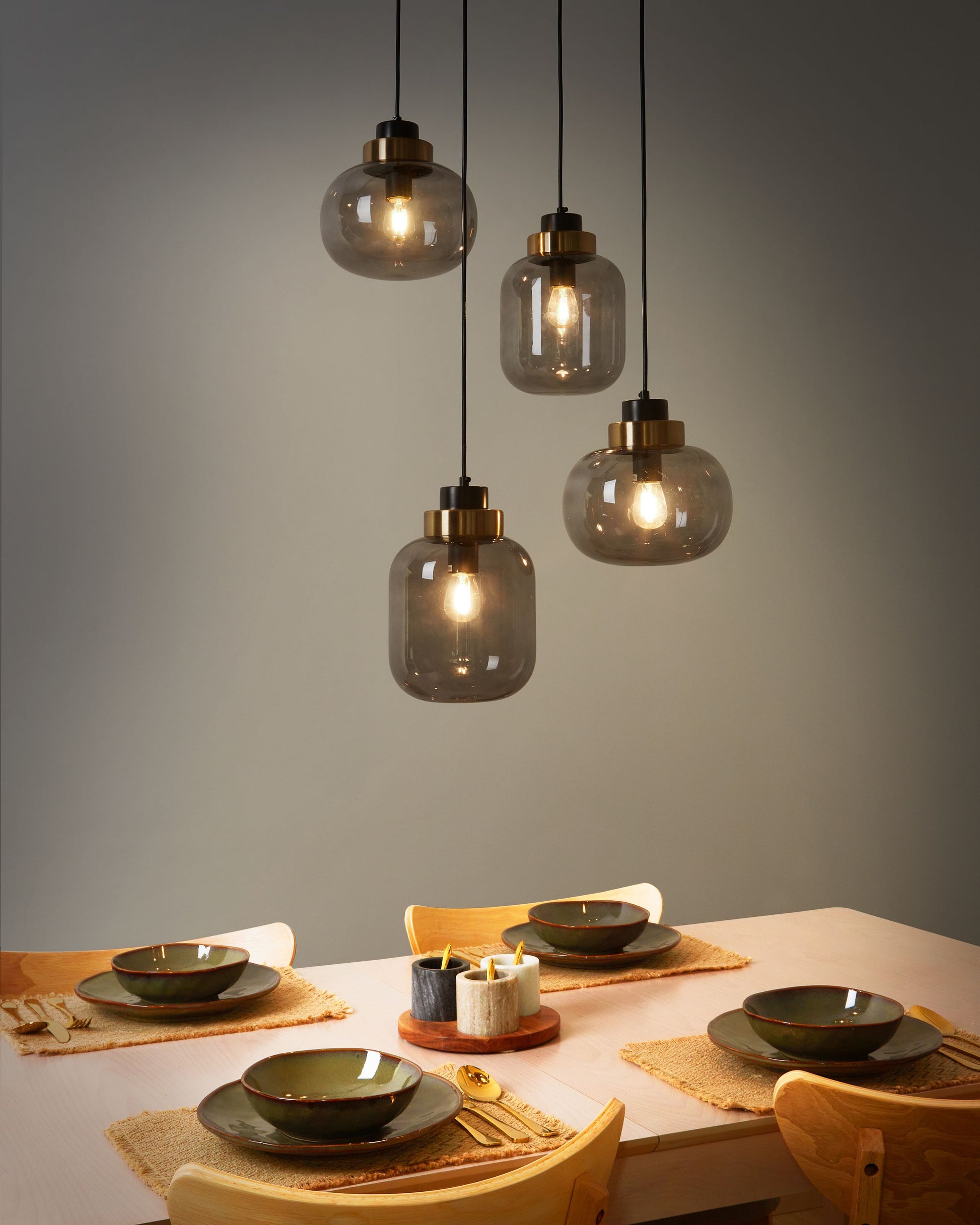 Verleihe deinem Esszimmer einen Hauch von zeitloser Eleganz mit dieser atemberaubenden vierflammigen Pendelleuchte. Ihr anmutiges Design besteht aus vier hängenden hellgrauen Glasschirmen, die ein faszinierendes Spiel aus Licht und Schatten erzeugen. Die Cluster-Anordnung wirkt modern und klassisch, während die elegante Silhouette jedem Raum einen Hauch von Glamour verleiht. Die Leuchte eignet sich hervorragend für die Beleuchtung von Esstischen und ist ein echter Blickfang. Material: Glas. Zusätzliches Material: Eisen. Gewicht: 4 Montage: Teilweise montiert Das Angebot beinhaltet: 1 x Hängeleuchte Höhe: 105 zusätzliche Information: Die Stromkabel dürfen nur von einem qualifizierten Elektriker angepasst werden. Breite: 39 Tiefe: 39 Art: Hängelampe Stil: Modern Allgemeine Farbe: Grau Schatten: Hellgrau Hauptmaterial: Glas Fassung: Max. 60 W