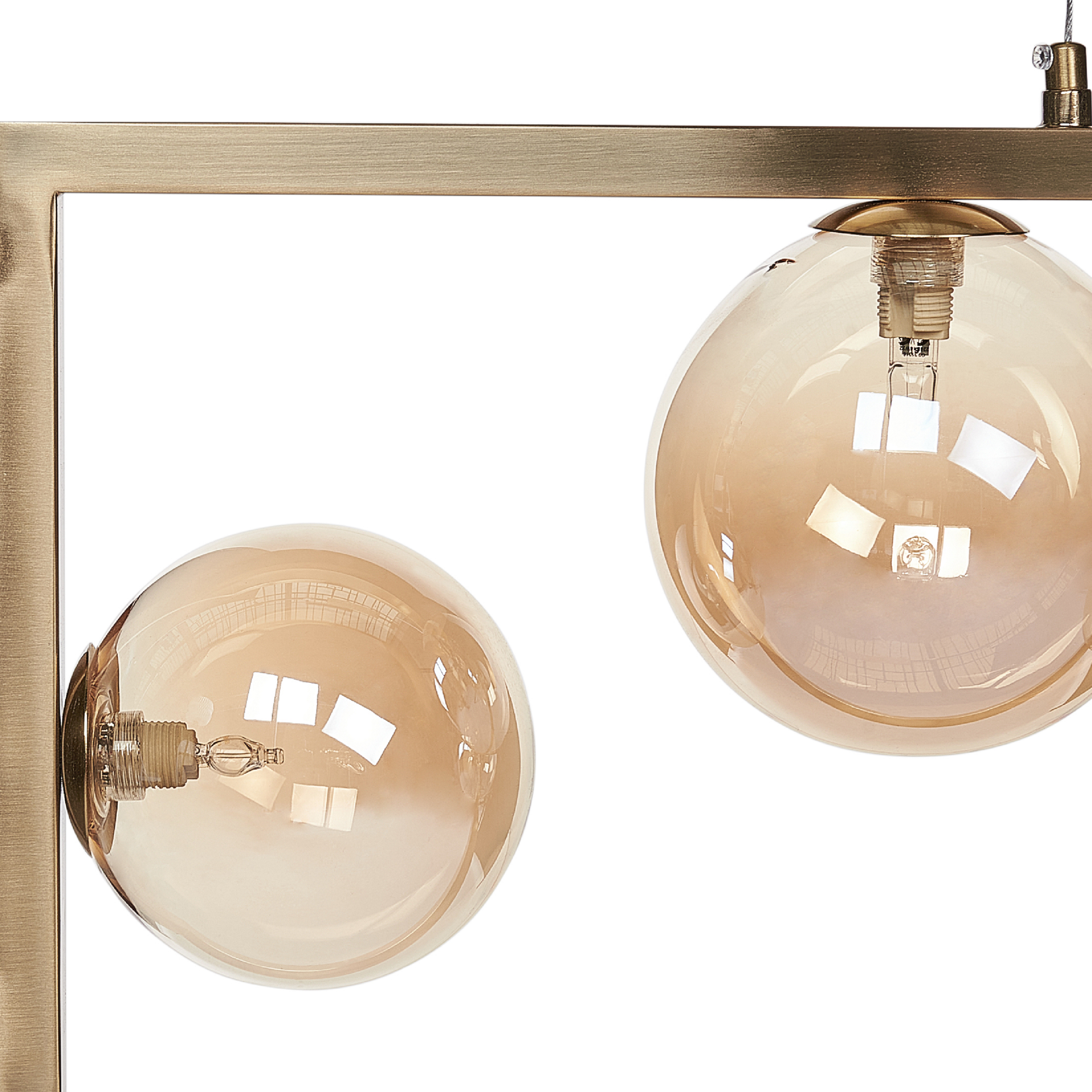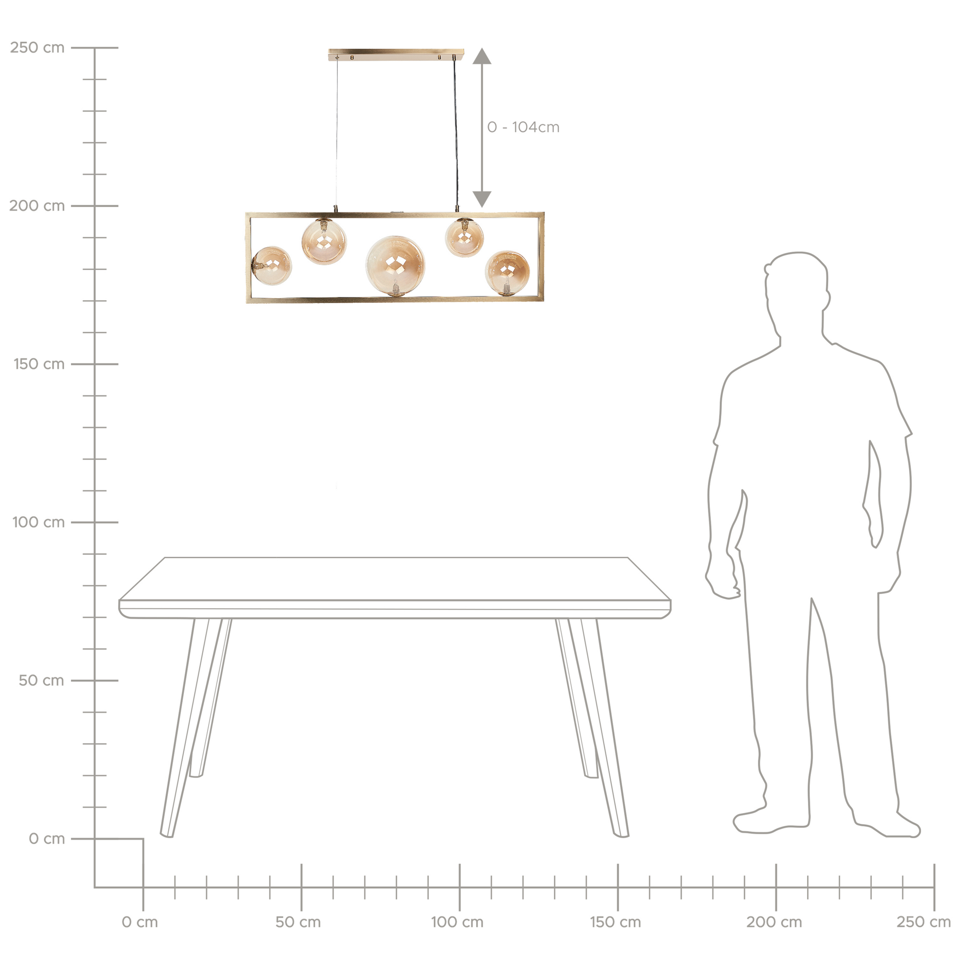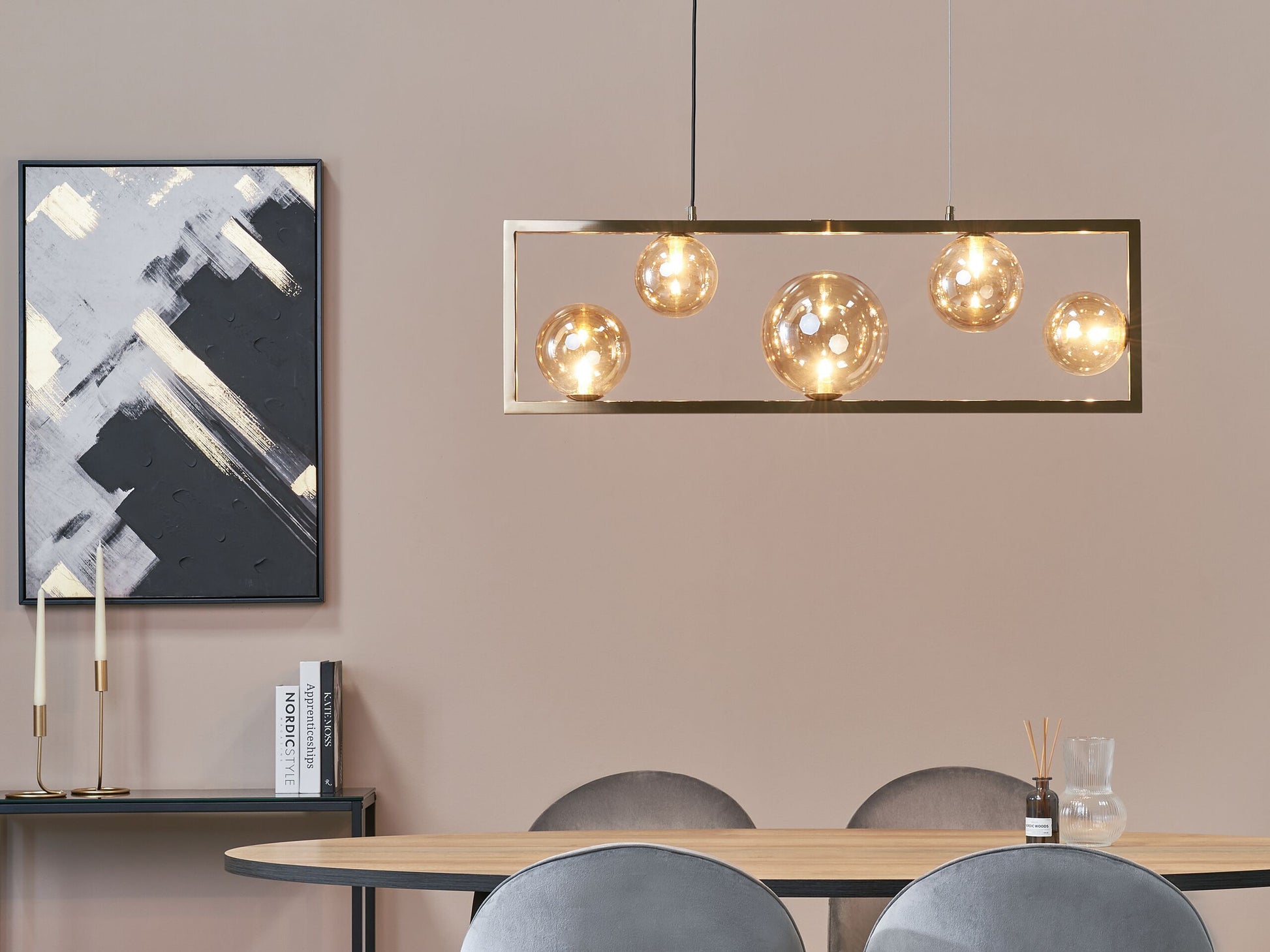 Beschreibung: Erleben Sie den Charme einer eleganten Pendelleuchte, bei der Raffinesse auf Handwerkskunst trifft. Der filigran gearbeitete, edel glänzende Metallrahmen aus Messing beherbergt elegant fünf zarte Glaskugelschirme. Diese raffinierte Zusammenstellung verleiht ihre Wohnkultur eine elegante Note. Material: Eisen. Zusätzliches Material: Glas, Kunststoff. Gewicht: 4 Montage: Nicht montiert Das Angebot beinhaltet: 1 x Hängeleuchte, Nicht im Lieferumfang enthalten: Leuchtmittel Höhe: 133 zusätzliche Information: Diese Leuchte ist geeignet für Leuchtmittel der Energieklassen A bis G auf einer Skala von A (sehr effizient) bis G (weniger effizient). Geeignet für: LED Leuchtmittel, Eco-Halogen Leuchtmittel, Energiesparleuchtmittel., Die Stromkabel dürfen nur von einem qualifizierten Elektriker angepasst werden., Da jedes Produkt handgefertigt wird, kann es zu kleineren Abweichungen in der Farbe und der äusseren Struktur kommen. Diese Abweichungen stellen keinen Qualitätsmangel dar, sondern sind eine warentypische Eigenschaft. Breite: 100 Tiefe: 20 Art: Hängelampe Stil: Modern Allgemeine Farbe: Messing Hauptmaterial: Eisen Fassung: 9 W IP Protection Code: IP 20