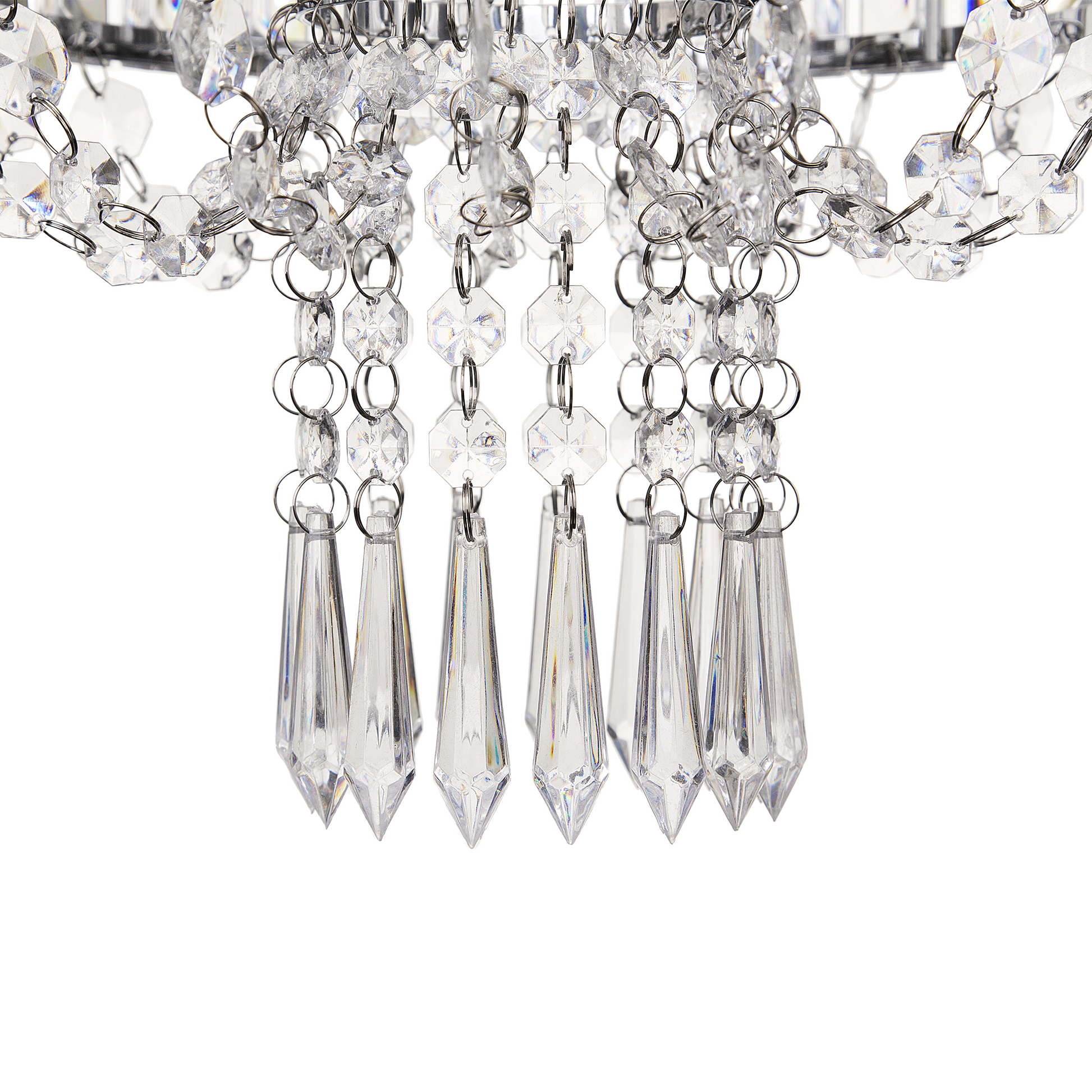 Voluminöses Design mit besonders edlen Lichtreflexen. Mit seinen stilvollen, herabhängenden Acrylglas-Kristallelementen gibt dieser Kronleuchter Ihrer Wohnung einen Hauch Glamour und Luxus. Hohe Decken erlauben ihm seine Wirkung voll zu entfalten und die Blicke Ihrer Gäste mit seinem einzigartigen Charme zu fesseln. Material: Eisen. Zusätzliches Material: PVC, Acrylglas. Gewicht: 1 Montage: Erfordert Installation und Montage Das Angebot beinhaltet: 1 x Hängeleuchte, Nicht im Lieferumfang enthalten: Leuchtmittel Höhe: 87 zusätzliche Information: Diese Leuchte ist geeignet für Leuchtmittel der Energieklassen A bis G auf einer Skala von A (sehr effizient) bis G (weniger effizient). Geeignet für: LED Leuchtmittel, Eco-Halogen Leuchtmittel, Energiesparleuchtmittel., Die Stromkabel dürfen nur von einem qualifizierten Elektriker angepasst werden. Breite: 25 Tiefe: 25 Art: Kronleuchter Stil: Glamourös Allgemeine Farbe: Transparent Hauptmaterial: Eisen Fassung: Max. 40 W IP Protection Code: IP 20