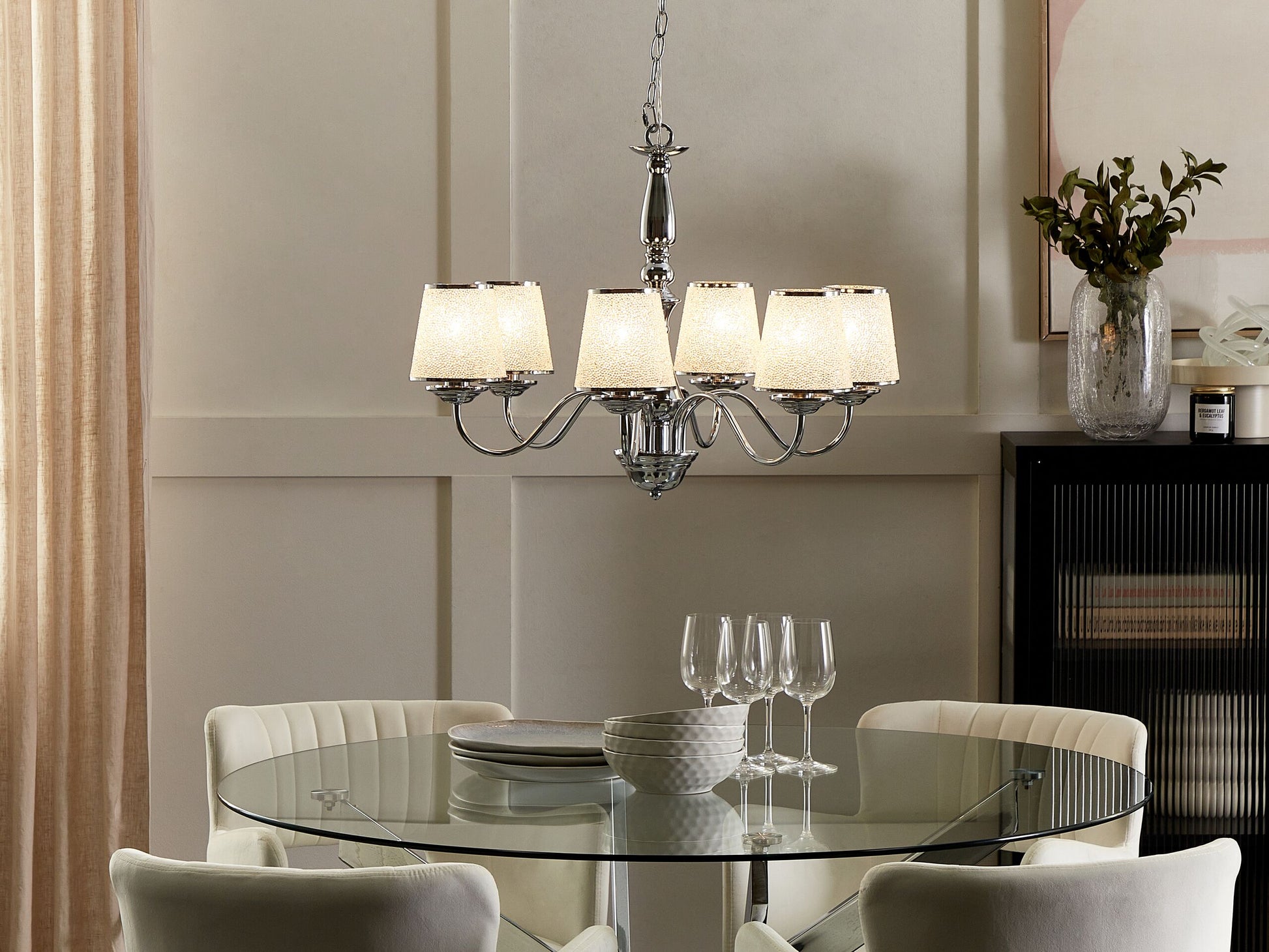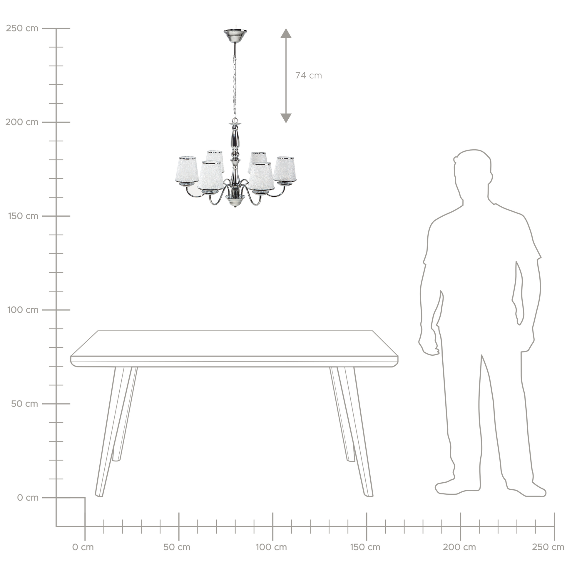 Beschreibung: Angenehmer und weicher Lichtschein und stilvolle Beleuchtung. Auf den sechs geschwungenen Armen des eleganten Kronleuchters sind runde Lampenschirme aus weissem Acryl befestigt. Das verchromte Metall bildet einen wunderschönen Kontrast zu den zierlichen Lampenschirmen und verleiht dem Leuchter ein luxuriöses Erscheinungsbild. Die klassisch anmutende Kettenaufhängung verstärkt das Vintage Flair dieser traumhaft schönen Lampe. Material: Eisen. Zusätzliches Material: Acryl. Gewicht: 3 Montage: Erfordert Installation und Montage Das Angebot beinhaltet: 1 x Hängeleuchte, Nicht im Lieferumfang enthalten: Leuchtmittel Höhe: 127 zusätzliche Information: Diese Leuchte ist geeignet für Leuchtmittel der Energieklassen A bis G auf einer Skala von A (sehr effizient) bis G (weniger effizient). Geeignet für: LED Leuchtmittel, Eco-Halogen Leuchtmittel, Energiesparleuchtmittel., Die Stromkabel dürfen nur von einem qualifizierten Elektriker angepasst werden. Breite: 65 Tiefe: 65 Art: Kronleuchter Stil: Glamourös Allgemeine Farbe: Silber Hauptmaterial: Eisen Fassung: Max. 40 W IP Protection Code: IP 20