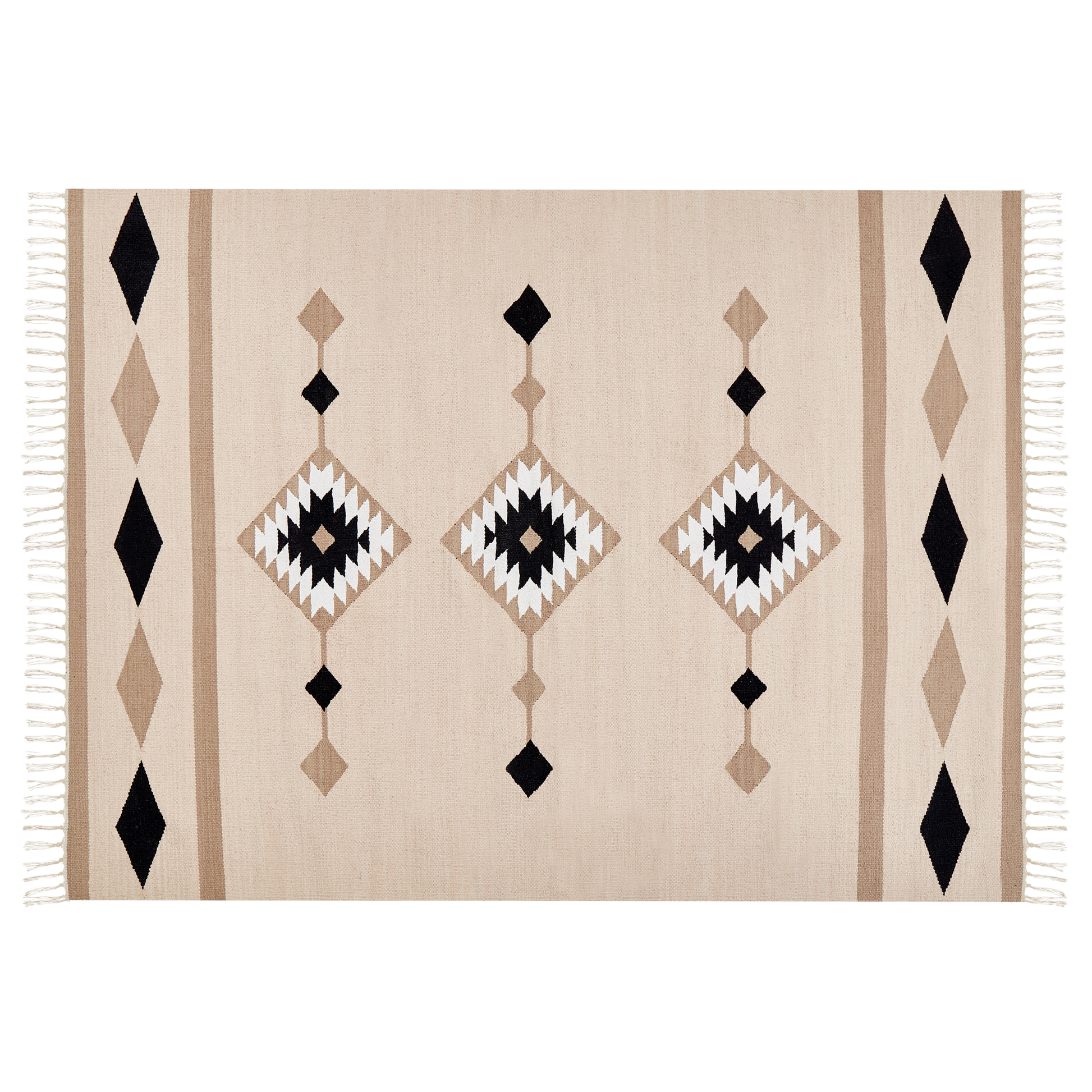Lassen Sie sich von unserem schönen Kelim bezaubern, der in jedes Wohn- oder Schlafzimmer im traditionellen Stil passt. Er wurde in sorgfältiger Handarbeit aus hochwertiger Baumwolle gewebt, daher ist er sowohl sehr weich als auch langlebig und pflegeleicht. Sein auffälliges Muster strahlt zeitlose Eleganz aus und die beigen Fransen an den Seiten des Teppichs sorgen für einen eleganten Touch. Zudem ist das Motiv auch auf der Unterseite des Wohnzimmerteppichs abgebildet. Dank dieser Eigenschaft können Sie ihn auf beiden Seiten nutzen. Material: Baumwolle. Material Zusammensetzung: 100% Baumwolle Gewicht: 3 Montage: Benötigt keine Montage Das Angebot beinhaltet: 1 x Teppich zusätzliche Information: Da der Teppich handgewebt ist, können kleine Farb-, Muster-, bzw. Grössendifferenzen auftreten. Diese Unterschiede stellen jedoch keinen Produktfehler dar., Der Artikel benötigt einige Zeit, bis er seinen ursprünglichen Zustand erreicht hat – daher sollte er so schnell wie möglich ausgerollt werden und innerhalb von 72 Stunden seine vollständige Grösse wieder erreichen. Für einen optimalen Effekt sollte man die Teppichkanten mit schweren Gegenständen fixieren. Gestalten: Rechteckig Breite: 140 Länge: 200 Art: Teppich Stil: Boho Allgemeine Farbe: Bunt Muster: Geometrisches Muster Hauptmaterial: Baumwolle Dichte: 1000