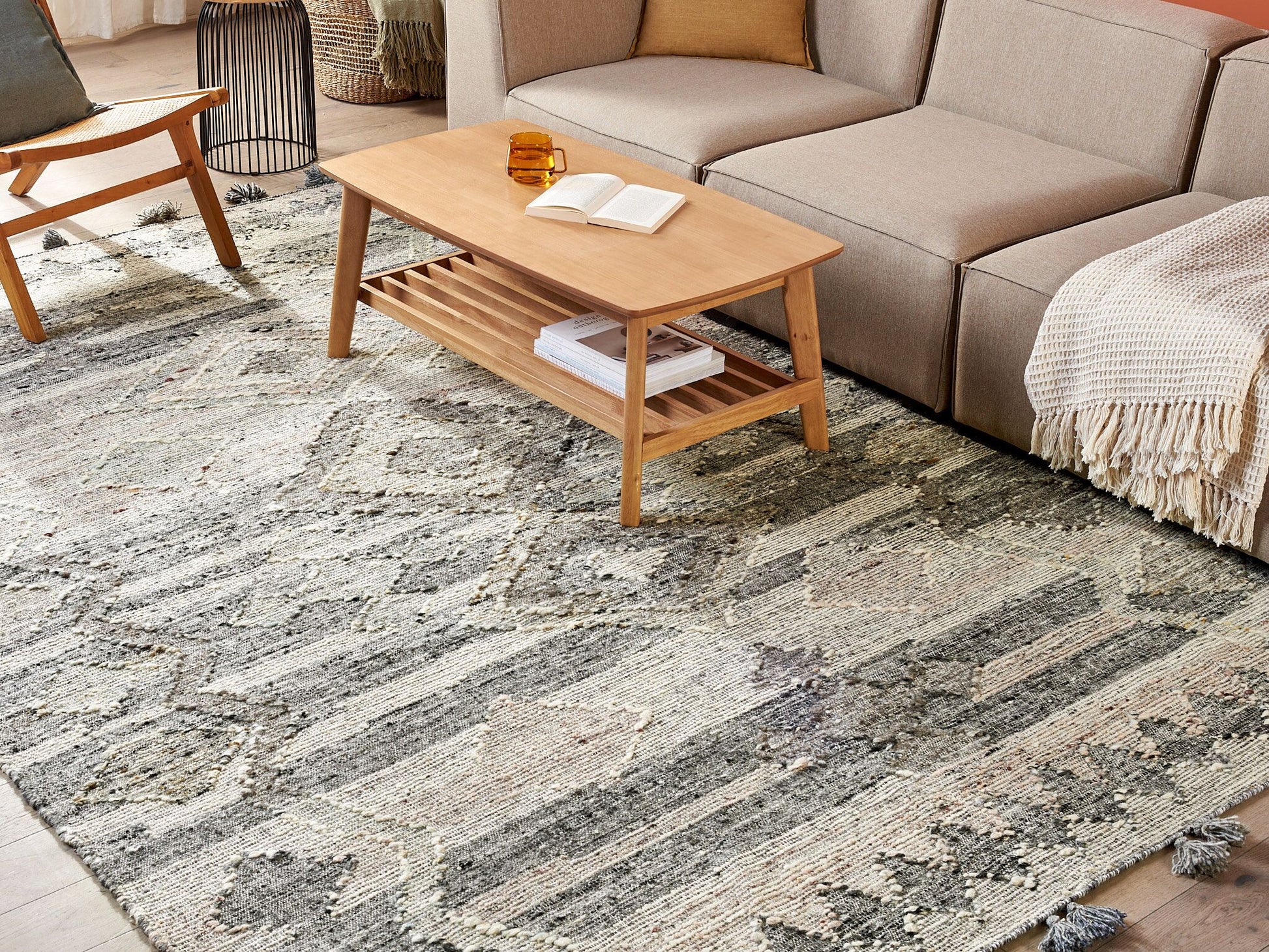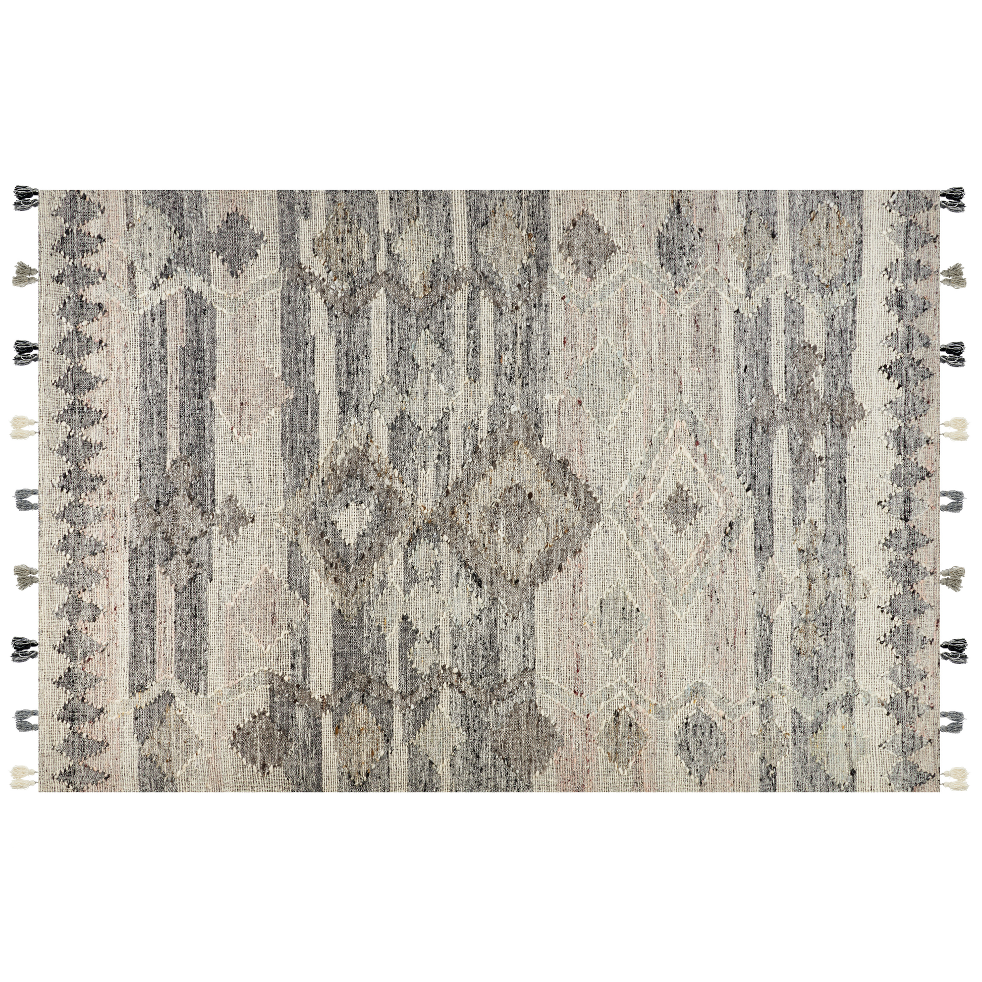 Dieser einzigartige Kelim wird in Ihrem Wohn- oder Schlafzimmer bestimmt auffallen. Er verfügt über dekorative, bunte Quasten an beiden Enden und ein geometrisches Muster. Dank dieses Designs lässt sich der Teppich mit vielen Wohnstilen kombinieren, am besten wirkt er jedoch in Vintage- und Boho-Einrichtungen. Er ist aus Wolle und Baumwolle handgefertigt – diese Materialien garantieren die Langlebigkeit des Modells sowie seine weiche und angenehme Haptik. Material: Wolle. Zusätzliches Material: Baumwolle. Material Zusammensetzung: 85% Wolle, 15% Baumwolle Gewicht: 10 Montage: Benötigt keine Montage Das Angebot beinhaltet: 1 x Teppich zusätzliche Information: Der Artikel benötigt einige Zeit, bis er seinen ursprünglichen Zustand erreicht hat – daher sollte er so schnell wie möglich ausgerollt werden und innerhalb von 72 Stunden seine vollständige Grösse wieder erreichen. Für einen optimalen Effekt sollte man die Teppichkanten mit schweren Gegenständen fixieren., Da jedes Produkt handgefertigt wird, kann es zu kleineren Abweichungen in der Farbe und der äusseren Struktur kommen. Diese Abweichungen stellen keinen Qualitätsmangel dar, sondern sind eine warentypische Eigenschaft. Gestalten: Rechteckig Breite: 200 Länge: 300 Art: Teppich Stil: Retro Allgemeine Farbe: Grau Muster: Geometrisches Muster Hauptmaterial: Wolle Dichte: 1500