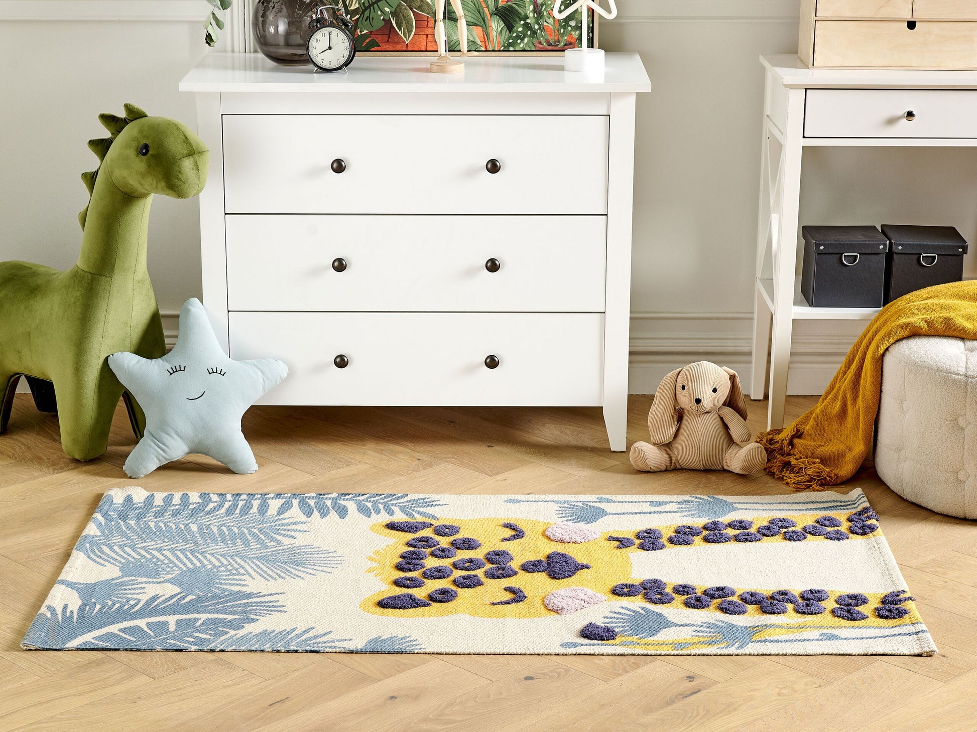 Mach dich auf zu einer wilden, stilvollen und bequemen Safari mit unserem handgewebten Baumwollteppich, der exklusiv für Kinder entworfen wurde. Der sorgfältig gefertigte Teppich hat eine rutschfeste Unterseite, die eine sichere und stabile Oberfläche für endlose Abenteuer bietet. Auf einem beruhigenden beigen Hintergrund steht ein niedlicher Leopard im Mittelpunkt, umgeben von üppigen exotischen Pflanzen, die die kleinen Entdecker in ferne Länder entführen. Lass deiner Fantasie freien Lauf und schaffe eine Dschungeloase, in der Träume auf diesem aussergewöhnlichen Teppich wahr werden und die Tierwelt in dein Zimmer bringt. Material: Baumwolle. Zusätzliches Material: Polyester. Material Zusammensetzung: 95% Baumwolle, 5% Polyester Gewicht: 2 Montage: Benötigt keine Montage Das Angebot beinhaltet: 1 x Teppich zusätzliche Information: Jeder Artikel ist ein handgefertigtes Unikat; Farbschattierung und Muster können daher vom Foto abweichen. Gestalten: Rechteckig Breite: 80 Länge: 150 Art: Kinderteppich Stil: Modern Allgemeine Farbe: Bunt Muster: Tiermuster Hauptmaterial: Baumwolle Dichte: 1150