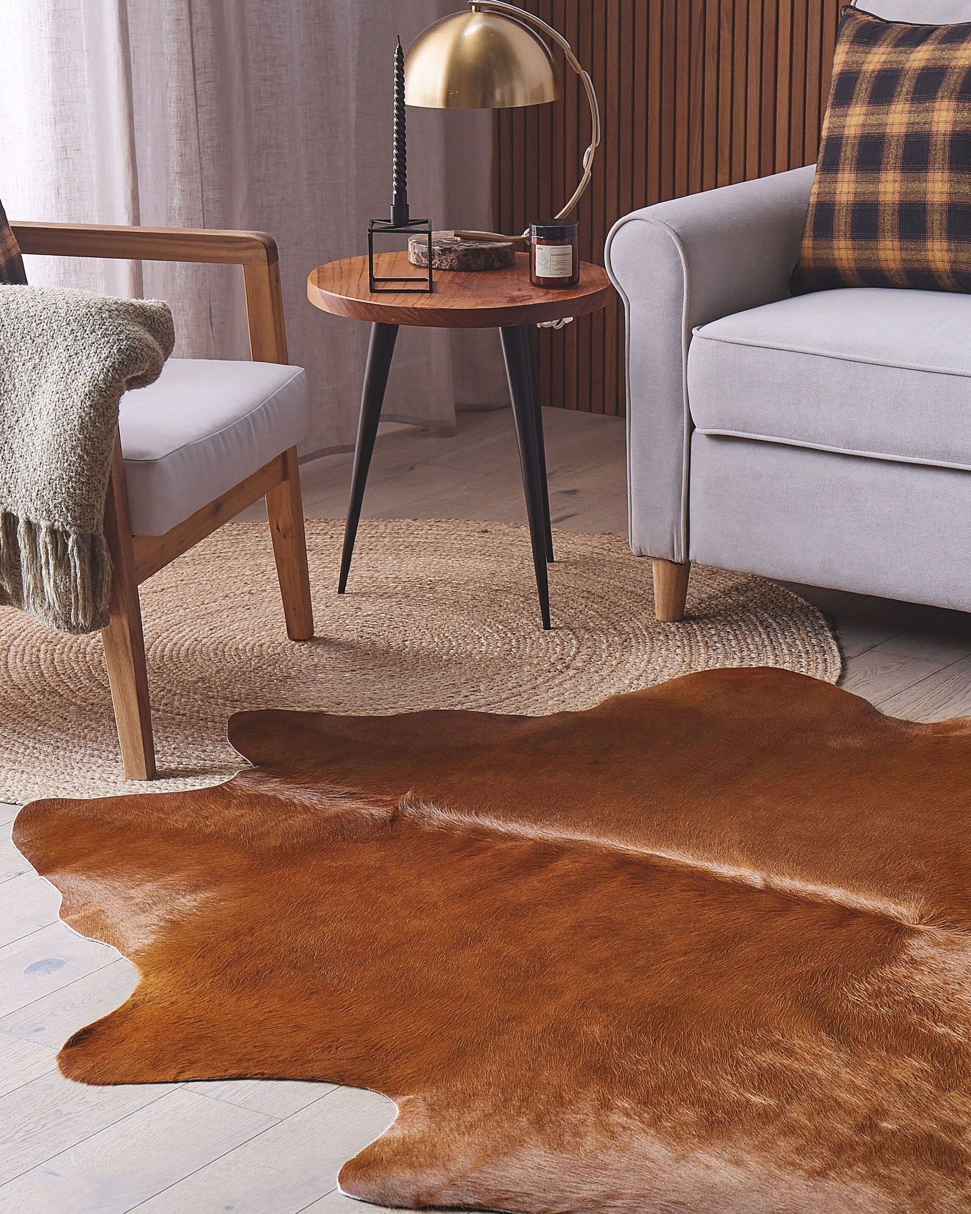 Verleihen Sie Ihrem Zuhause mit diesem hochwertigen Kuhfellteppich einen gehobenen Look. Das dicke brasilianische Kuhfell ist ein besonders langlebiges und multifunktionales Dekorationsstück, das sich in jeden Raum einfügen lässt. Sein warmer, natürlicher Farbton verleiht jedem Zimmer eine gemütliche und einladende Atmosphäre. Mit dem einzigartigen Muster setzt der Teppich einen ergänzenden Akzent in ländlichen oder rustikalen Wohnstilen, wird aber auch hervorragend zu anderen Einrichtungsstilen passen. Nutzen Sie den Teppich, um Ihrem Sofa oder Bett eine gemütliche Note zu verleihen, einem kalten Boden eine weiche Schicht hinzuzufügen oder ihn an die Wand zu hängen und so einen auffälligen Eyecatcher zu schaffen.  Material: Echtleder, Kuhfell. Material Zusammensetzung: 100% Echtleder Gewicht: 4 Montage: Benötigt keine Montage Das Angebot beinhaltet: 1 x Teppich zusätzliche Information: Der Artikel könnte Haare verlieren. Dies ist ein normaler Vorgang und stellt keinen Qualitätsmangel des Produkts dar., Da  Kuhfell ein Naturprodukt ist, können Muster- bzw. Grössendifferenzen auftreten. Farb- und Strukturunterschiede, Narben, Falten und sonstige Naturmerkmale sind Echtheitsbeweise und keine zur Reklamation berechtigende Fehler., Der Artikel benötigt einige Zeit, bis er seinen ursprünglichen Zustand erreicht hat – daher sollte er so schnell wie möglich ausgerollt werden und innerhalb von 72 Stunden seine vollständige Grösse wieder erreichen. Für einen optimalen Effekt sollte man die Teppichkanten mit schweren Gegenständen fixieren., Um die Qualität und Langlebigkeit des Materials zu erhalten, sollten Sie den Teppich nicht in stark beanspruchten Bereichen platzieren. Gestalten: Unregelmässig Art: Teppich Stil: Klassisch Allgemeine Farbe: Braun Schatten: Goldbraun Hauptmaterial: Echtleder, Kuhfell