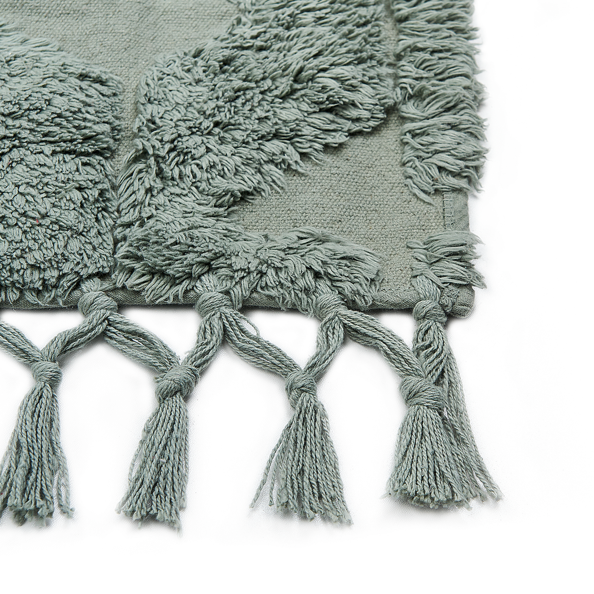 Lassen Sie sich von der gemütlichen Ausstrahlung dieses Kuschelteppichs verzaubern. Dank der Verwendung von hochwertigen Baumwollfasern und der soliden Verarbeitung wird dieser Vorleger jahrelang Ihr Auge erfreuen. Dabei besticht das Modell auch mit seiner angenehmen Farbwahl, die sich in allen Wohnräumen beweisen wird. Er punktet auch mit seiner handgetufteten Herstellung, die ihm seine Einzigartigkeit garantiert. Platzieren Sie dieses Stück in der Mitte des Raumes und kombinieren Sie es mit behaglichen und natürlichen Möbeln, um einen minimalistischen Boho-Look zu erzielen. Material: Baumwolle. Material Zusammensetzung: 100% Baumwolle Gewicht: 4.6 Montage: Benötigt keine Montage Das Angebot beinhaltet: 1 x Teppich zusätzliche Information: Der Artikel könnte Haare verlieren. Dies ist ein normaler Vorgang und stellt keinen Qualitätsmangel des Produkts dar., Der Artikel benötigt einige Zeit, bis er seinen ursprünglichen Zustand erreicht hat – daher sollte er so schnell wie möglich ausgerollt werden und innerhalb von 72 Stunden seine vollständige Grösse wieder erreichen. Für einen optimalen Effekt sollte man die Teppichkanten mit schweren Gegenständen fixieren., Herstellungstechnik: Beim Handtuftverfahren wird das Garn mit einer speziellen Nadel in das Trägermaterial des Teppichs eingestochen. Dabei wird das Garn nicht so fest in das Trägermaterial eingearbeitet wie bei anderen Methoden (z.B. Webteppiche). Daher können sich manchmal einzelne Fäden lösen. Gestalten: Rechteckig Breite: 160 Länge: 230 Art: Teppich Stil: Boho Allgemeine Farbe: Grün Muster: Geometrisches Muster Hauptmaterial: Baumwolle Dichte: 1250