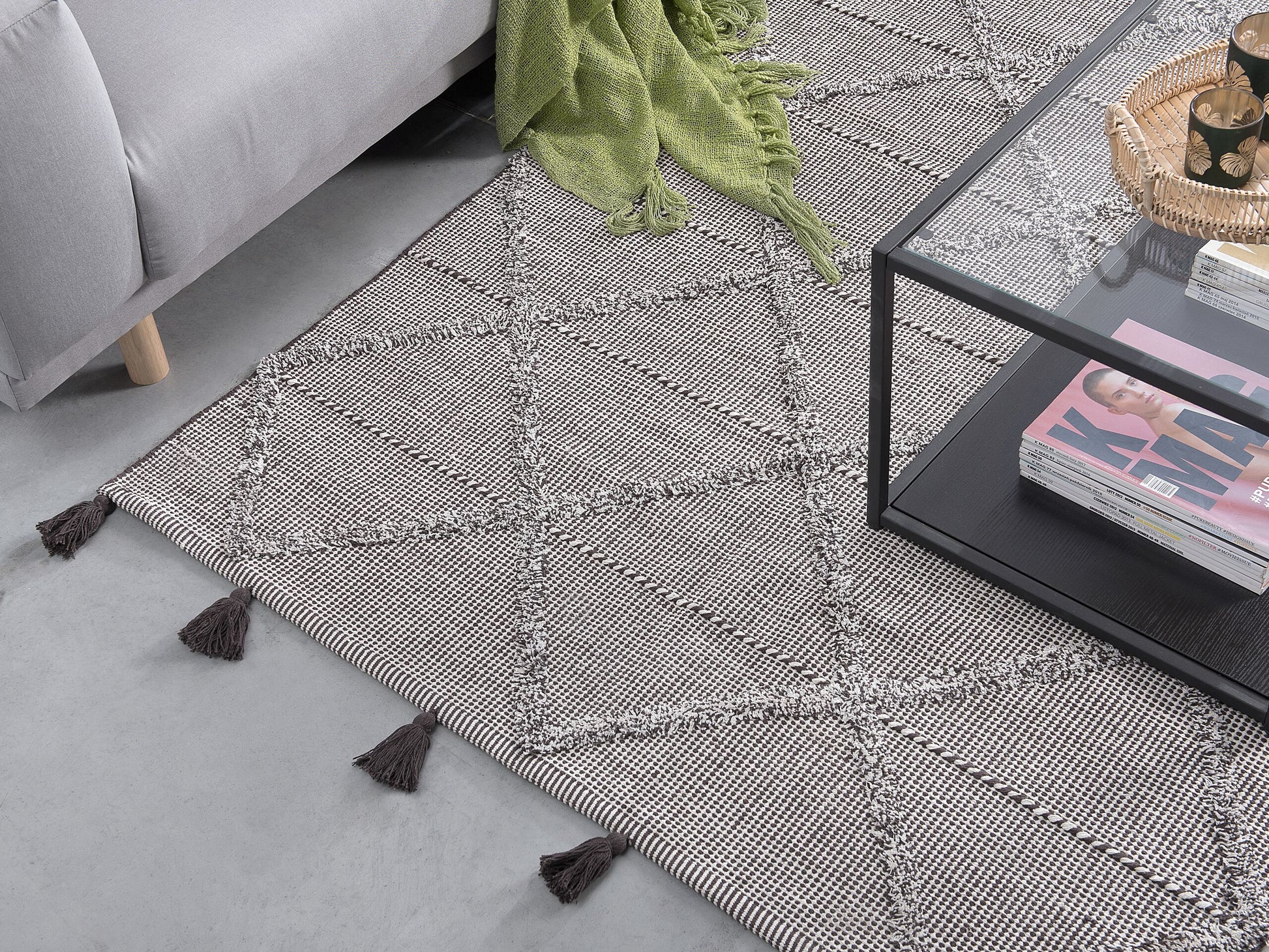 Dieser Teppich punktet nicht nur mit seinen hochwertigen Materialien und der modernen, dunklen Farbe - vor allem die angenehme Struktur im Karomuster verleiht ihm das gewisse Etwas. Die flauschigen Fransen an beiden Seiten des Teppichs geben einen zusätzlichen, dekorativen Effekt.    Material: Baumwolle. Material Zusammensetzung: 100% Baumwolle Gewicht: 3 Montage: Benötigt keine Montage Das Angebot beinhaltet: 1 x Teppich zusätzliche Information: Der Artikel könnte Haare verlieren. Dies ist ein normaler Vorgang und stellt keinen Qualitätsmangel des Produkts dar., Da der Teppich handgewebt ist, können kleine Farb-, Muster-, bzw. Grössendifferenzen auftreten. Diese Unterschiede stellen jedoch keinen Produktfehler dar., Der Artikel benötigt einige Zeit, bis er seinen ursprünglichen Zustand erreicht hat – daher sollte er so schnell wie möglich ausgerollt werden und innerhalb von 72 Stunden seine vollständige Grösse wieder erreichen. Für einen optimalen Effekt sollte man die Teppichkanten mit schweren Gegenständen fixieren. Gestalten: Rechteckig Breite: 140 Länge: 200 Art: Teppich Stil: Modern Allgemeine Farbe: Braun Muster: Geometrisches Muster Hauptmaterial: Baumwolle