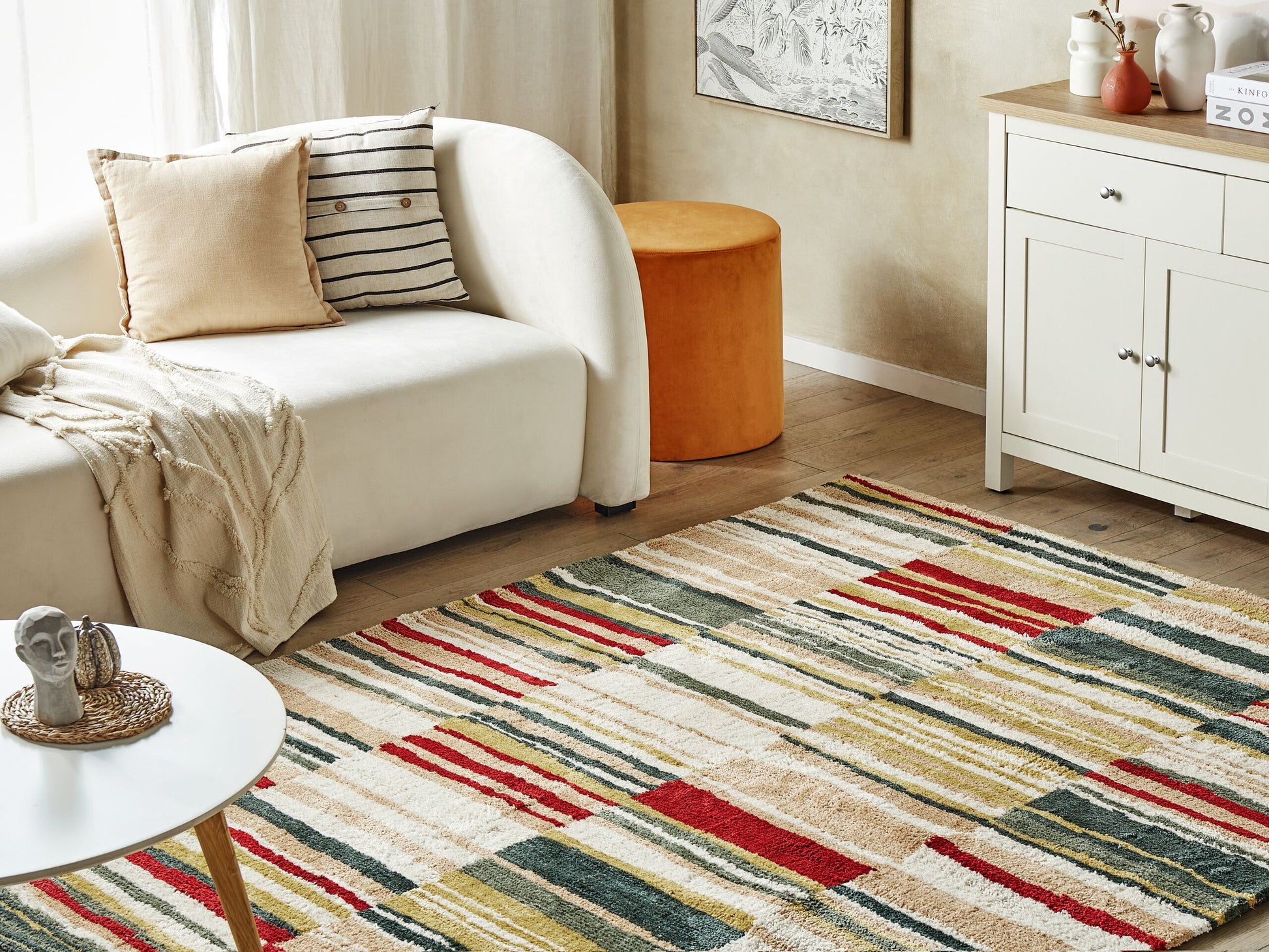 Warme Farben in einem ausdrucksstarken Streifenmuster sorgen für eine besonders gemütliche Ausstrahlung bei diesem rechteckigen Kurzflorteppich aus Polyester. Der herrlich weiche Kuschelteppich ist geeignet für Nutzung bei Fussbodenheizung und lässt sich mit allen Wohnstilen kombinieren.  Material: Polyester. Material Zusammensetzung: 100% Polyester Gewicht: 8 Montage: Benötigt keine Montage Das Angebot beinhaltet: 1 x Teppich zusätzliche Information: Der Artikel könnte Haare verlieren. Dies ist ein normaler Vorgang und stellt keinen Qualitätsmangel des Produkts dar., Der Artikel benötigt einige Zeit, bis er seinen ursprünglichen Zustand erreicht hat – daher sollte er so schnell wie möglich ausgerollt werden und innerhalb von 72 Stunden seine vollständige Grösse wieder erreichen. Für einen optimalen Effekt sollte man die Teppichkanten mit schweren Gegenständen fixieren. Gestalten: Rechteckig Breite: 140 Länge: 200 Art: Teppich Stil: Boho Allgemeine Farbe: Bunt Muster: Geometrisches Muster Hauptmaterial: Polyester Dichte: 1500