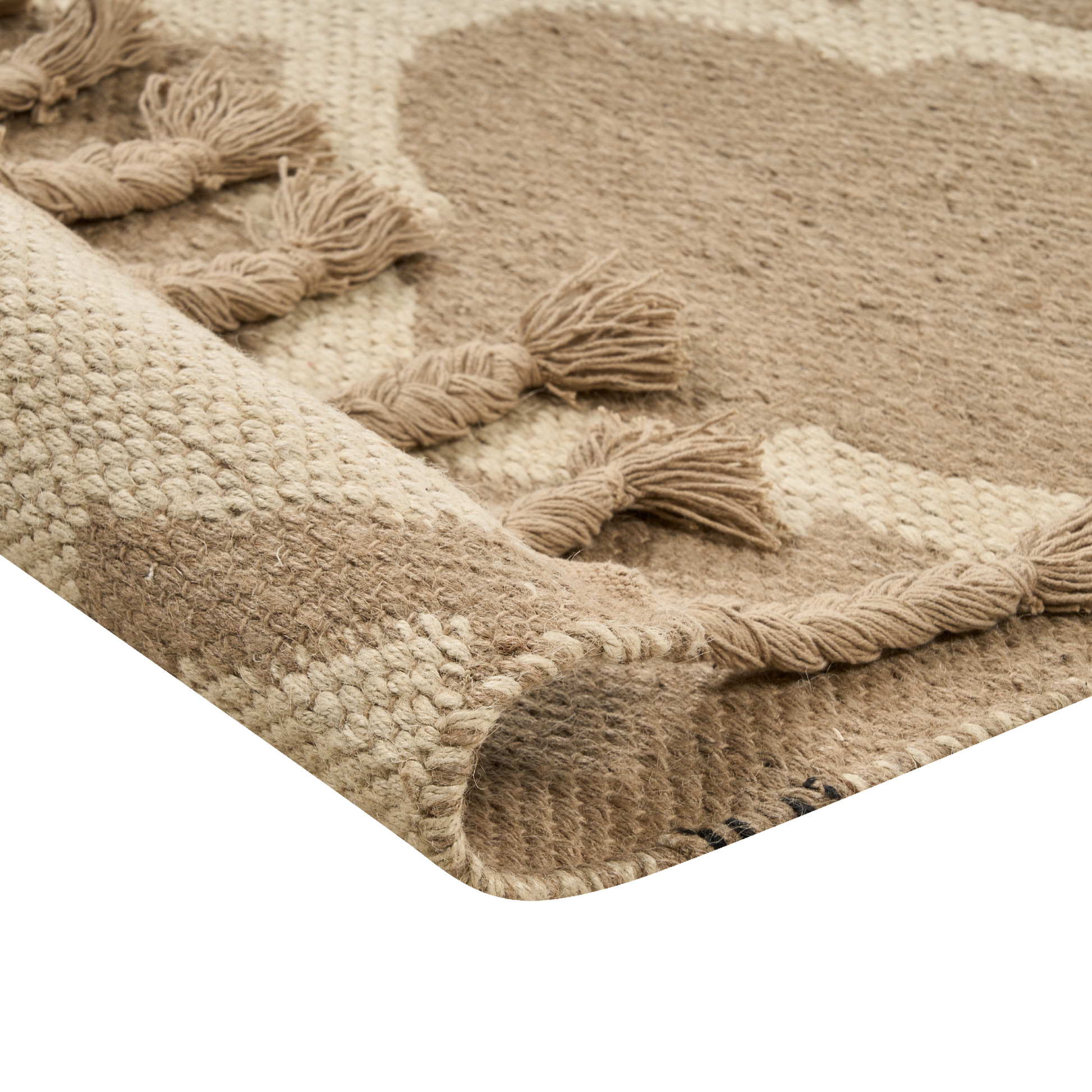 Beschreibung: Dieser Kurzflor-Teppich bringt nicht nur Wärme, sondern einen stilvollen Look in Ihr Zuhause und verzaubert Sie mit seinen strapazierfähigen und weichen Naturfasern. Er besteht aus natürlichen Jute- und Baumwollfasern und ist mit einem fesselnden geometrischen Muster verziert, das durch schlichte schwarze Details hervorgehoben wird. Dabei besticht jedes der Modelle mit seiner handgefertigten Schönheit und seinem hervorragenden Komfort. Zudem eignet sich der Naturfaser-Teppich für Fussbodenheizungen, sodass er sich problemlos in jede Ecke Ihrer Wohnung integrieren lässt. Material: Jute. Zusätzliches Material: Baumwolle. Material Zusammensetzung: 80% Jute, 20% Baumwolle Gewicht: 6 Montage: Benötigt keine Montage Das Angebot beinhaltet: 1 x Teppich zusätzliche Information: Da der Teppich handgewebt ist, können kleine Farb-, Muster-, bzw. Grössendifferenzen auftreten. Diese Unterschiede stellen jedoch keinen Produktfehler dar. Gestalten: Rechteckig Breite: 160 Länge: 230 Art: Teppich Stil: Boho Allgemeine Farbe: Beige Schatten: Hellbeige Muster: Geometrisches Muster Hauptmaterial: Jute Dichte: 1900