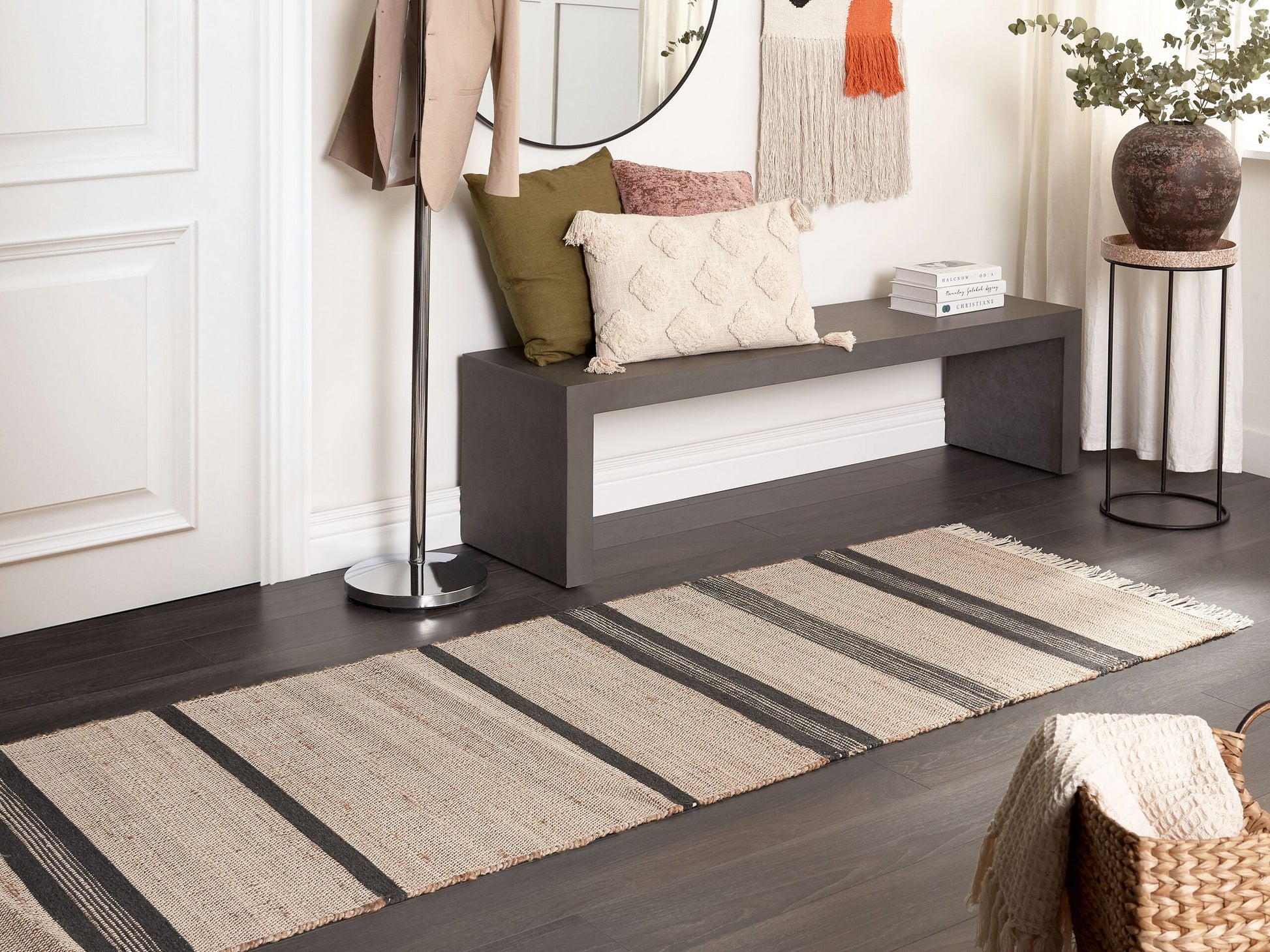 Entdecken Sie den Dhurrie-Teppich für sich und setzen Sie auf ein originelles, handgewebtes und wertvolles Produkt. Er ist in der indischen Dhurrie-Technik von Hand aus Jute in Kombination mit Chenille-Gewebe und Baumwolle gewebt worden. Diese Webtechnik garantiert Ihnen immer ein einzigartiges und schönes Stück. Dank seiner Materialien ist er sowohl nachhaltig als auch sehr widerstandsfähig und eignet sich daher besonders für stark frequentierte Bereiche. Wegen seiner Handlichkeit kann er auch für meditative Übungen und Yoga verwendet werden. Zudem ist der indische flachgewebe Teppich wendbar und kann daher beidseitig benutzt werden. Das dekorative Streifenmuster und die Quasten verleihen ihm einen charmanten Look und passen gut zu Parkettböden. Material: Jute. Zusätzliches Material: Baumwolle, Chenillegewebe. Material Zusammensetzung: 65% Jute, 20% Baumwolle, 15% Chenillegewebe Gewicht: 2.8 Montage: Benötigt keine Montage Das Angebot beinhaltet: 1 x Teppich zusätzliche Information: Da der Teppich handgewebt ist, können kleine Farb-, Muster-, bzw. Grössendifferenzen auftreten. Diese Unterschiede stellen jedoch keinen Produktfehler dar., Der Artikel benötigt einige Zeit, bis er seinen ursprünglichen Zustand erreicht hat – daher sollte er so schnell wie möglich ausgerollt werden und innerhalb von 72 Stunden seine vollständige Grösse wieder erreichen. Für einen optimalen Effekt sollte man die Teppichkanten mit schweren Gegenständen fixieren. Gestalten: Rechteckig Breite: 80 Länge: 300 Art: Teppich Stil: Boho Allgemeine Farbe: Beige Schatten: Helles Beige Muster: Streifen Hauptmaterial: Jute Dichte: 1400