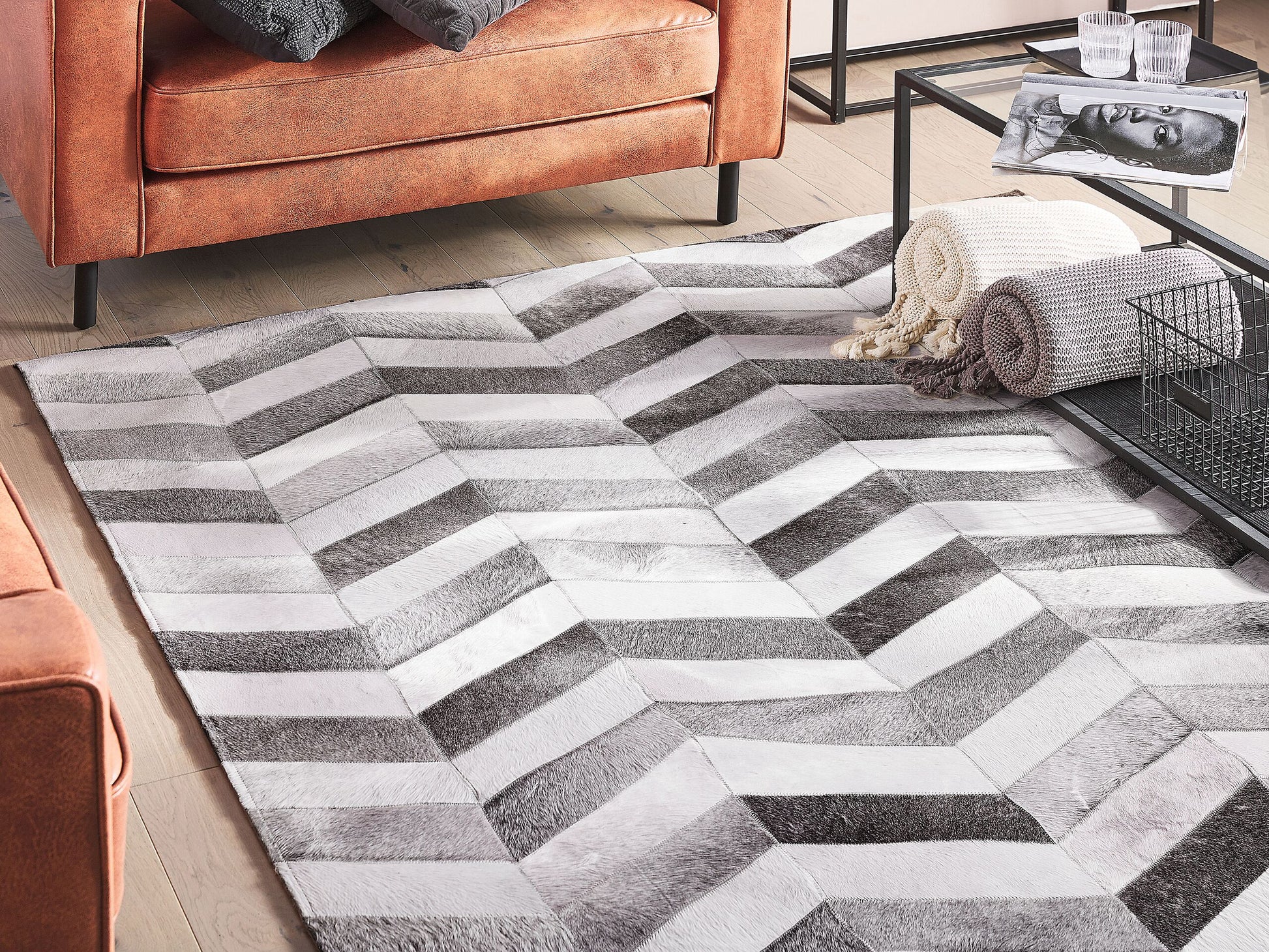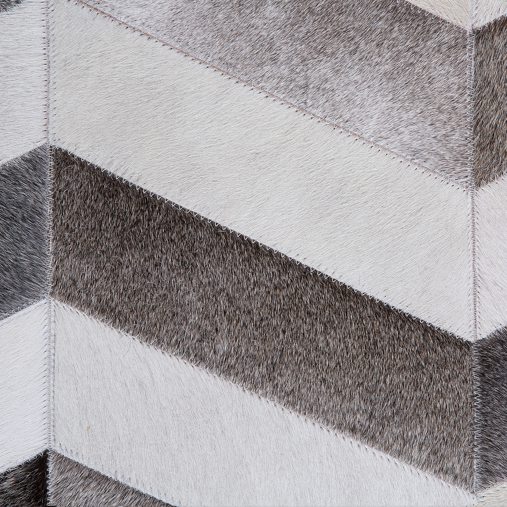 Der rechteckige, handgefertigte Felleppich besteht aus länglichen Lederstücken in verschiedenen Grautönen, die zu einem gezackten Muster zusammengesetzt wurden. Der moderne Teppich mit seinem dynamischen Muster passt zu jedem Wohnstil und sorgt für elegantes Ambiente. Der Lederteppich verfügt über eine schonende Unterseite aus Filz.  Material: Kuhfell. Material Zusammensetzung: 100% Echtleder Gewicht: 5 Montage: Benötigt keine Montage Das Angebot beinhaltet: 1 x Teppich zusätzliche Information: Der Artikel könnte Haare verlieren. Dies ist ein normaler Vorgang und stellt keinen Qualitätsmangel des Produkts dar., Da der Teppich handgewebt ist, können kleine Farb-, Muster-, bzw. Grössendifferenzen auftreten. Diese Unterschiede stellen jedoch keinen Produktfehler dar., Der Artikel benötigt einige Zeit, bis er seinen ursprünglichen Zustand erreicht hat – daher sollte er so schnell wie möglich ausgerollt werden und innerhalb von 72 Stunden seine vollständige Grösse wieder erreichen. Für einen optimalen Effekt sollte man die Teppichkanten mit schweren Gegenständen fixieren., Um die Qualität und Langlebigkeit des Materials zu erhalten, sollten Sie den Teppich nicht in stark beanspruchten Bereichen platzieren., Leder ist ein Naturprodukt. Es kann zu einer Faltenbildung kommen, die durch einen natürlichen Vorgang entsteht. Leder kann sich durch Nutzung ausdehnen und bildet sich nicht komplett zurück in den ursprünglichen Zustand. Farb- und Strukturunterschiede, Narben, Falten und sonstige Naturmerkmale sind Echtheitsbeweise und keine zur Reklamation berechtigende Fehler. Gestalten: Rechteckig Breite: 140 Länge: 200 Art: Teppich Stil: Klassisch Allgemeine Farbe: Bunt Muster: ZickZack-Muster Hauptmaterial: Kuhfell Dichte: 2000