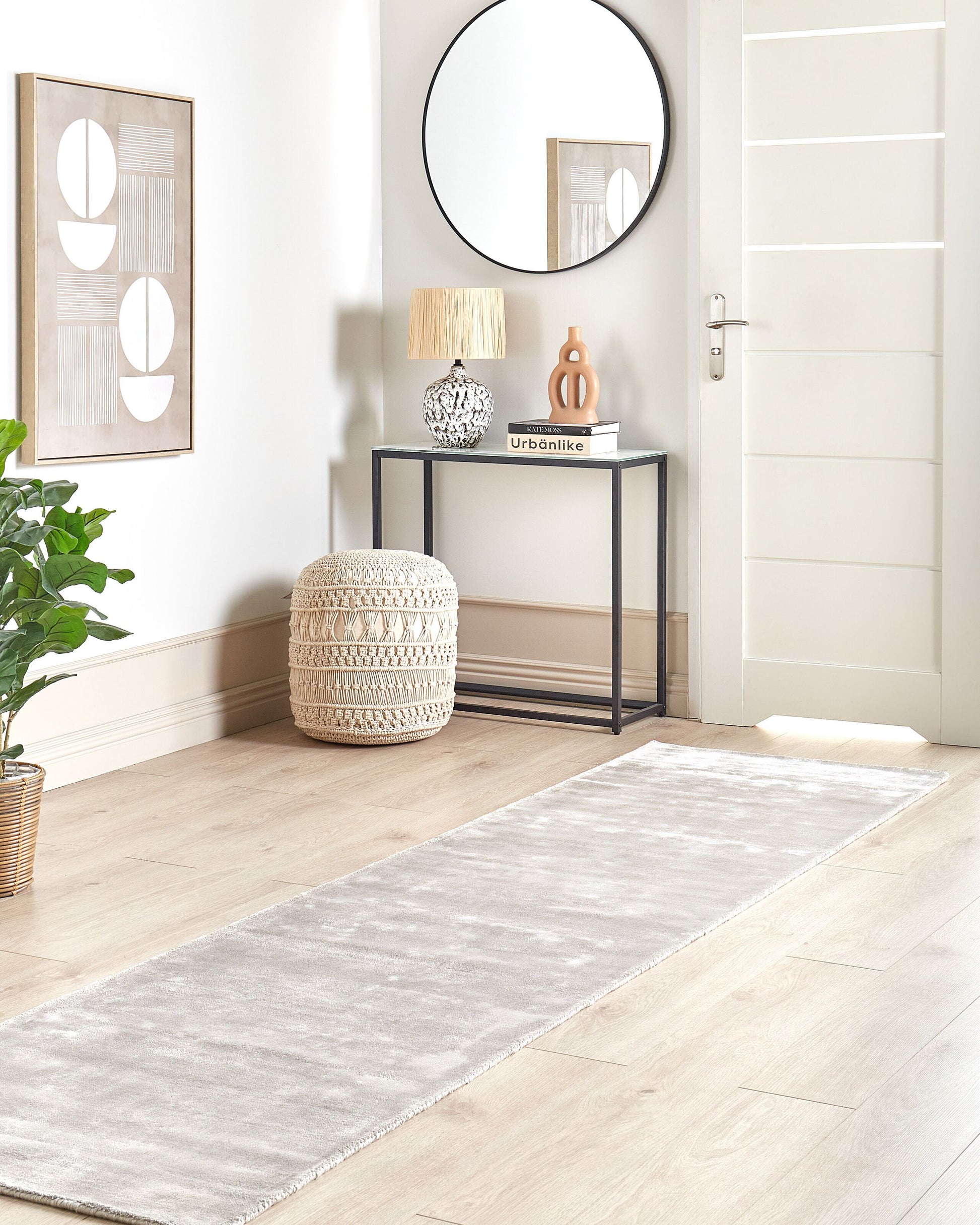 Die geschnittenen Garne bilden eine dichte, äusserst gleichmässige und angenehm weiche Oberfläche. So erhält der Viskose-Teppich eine gemütliche Ausstrahlung und taucht ihre Füsse bei jedem Spaziergang über das samtweiche Material in ein Gefühl von Luxus und Wärme. Dank zusätzlicher Baumwoll-Unterseite wird der Boden vor Gebrauchsspuren geschont. Erfreuen Sie sich an seiner besonderen Qualität, die nur von einem handgewebten Modell wie diesem gegeben werden kann.   Material: Viskose. Material Zusammensetzung: 100% Viskose Gewicht: 8.2 Montage: Benötigt keine Montage Das Angebot beinhaltet: 1 x Teppich zusätzliche Information: Da der Teppich handgewebt ist, können kleine Farb-, Muster-, bzw. Grössendifferenzen auftreten. Diese Unterschiede stellen jedoch keinen Produktfehler dar., Der Artikel könnte Haare verlieren. Dies ist ein normaler Vorgang und stellt keinen Qualitätsmangel des Produkts dar., Der Artikel benötigt einige Zeit, bis er seinen ursprünglichen Zustand erreicht hat – daher sollte er so schnell wie möglich ausgerollt werden und innerhalb von 72 Stunden seine vollständige Grösse wieder erreichen. Für einen optimalen Effekt sollte man die Teppichkanten mit schweren Gegenständen fixieren., Bitte beachten Sie, dass Viskosefasern eine seidig glänzende Oberfläche haben, die je nach Faserrichtung und Lichtverhältnissen einen andere Farbschattierung annehmen kann. Gestalten: Rechteckig Breite: 80 Länge: 300 Art: Teppich Stil: Skandinavisch Allgemeine Farbe: Grau Schatten: Hellgrau Muster: Ohne Muster Hauptmaterial: Viskose Dichte: 2200