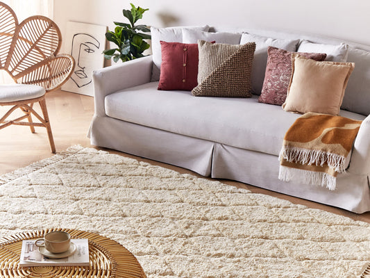 Teppich Baumwolle hellbeige 140 x 200 cm marokkanisches Muster Kurzflor SILCHAR
