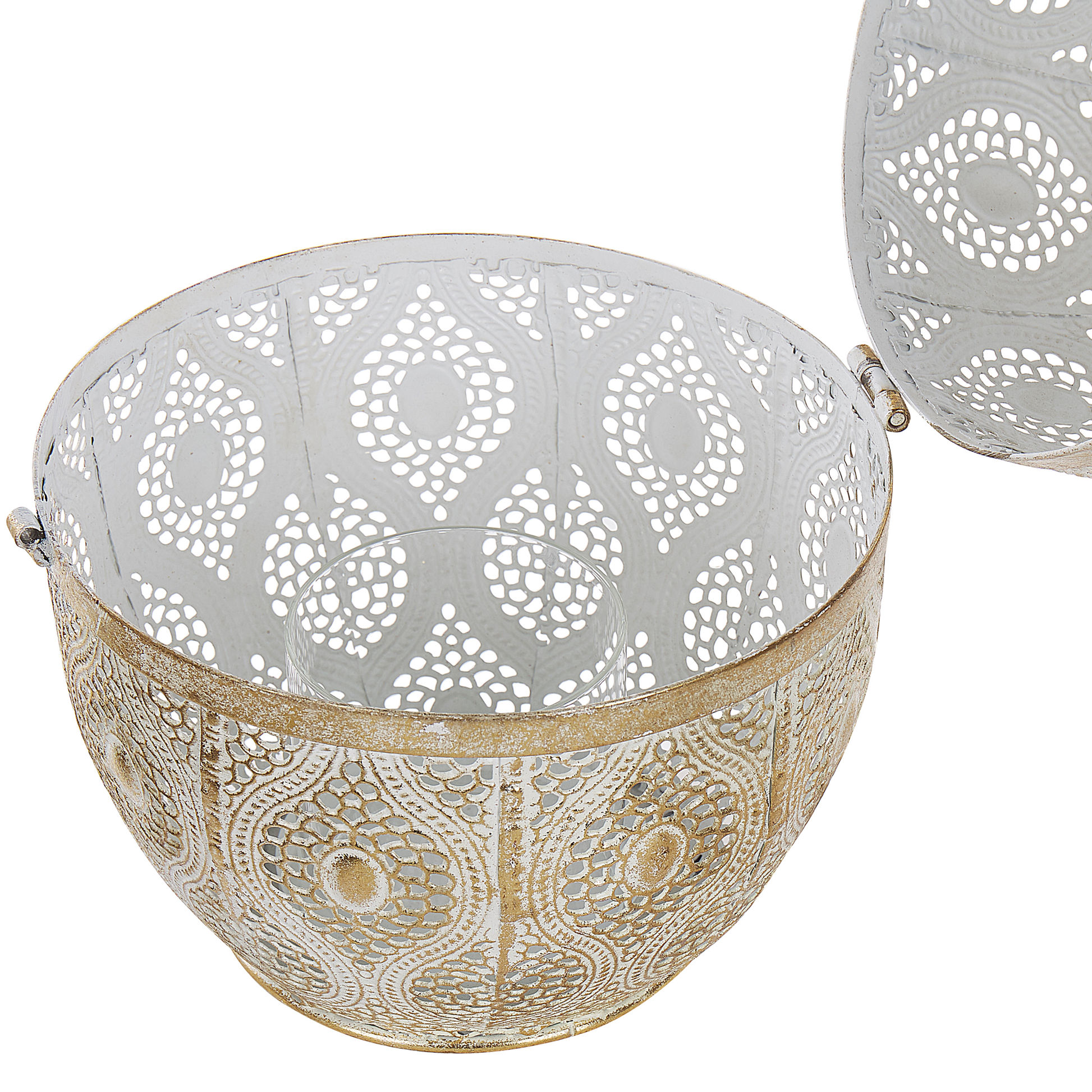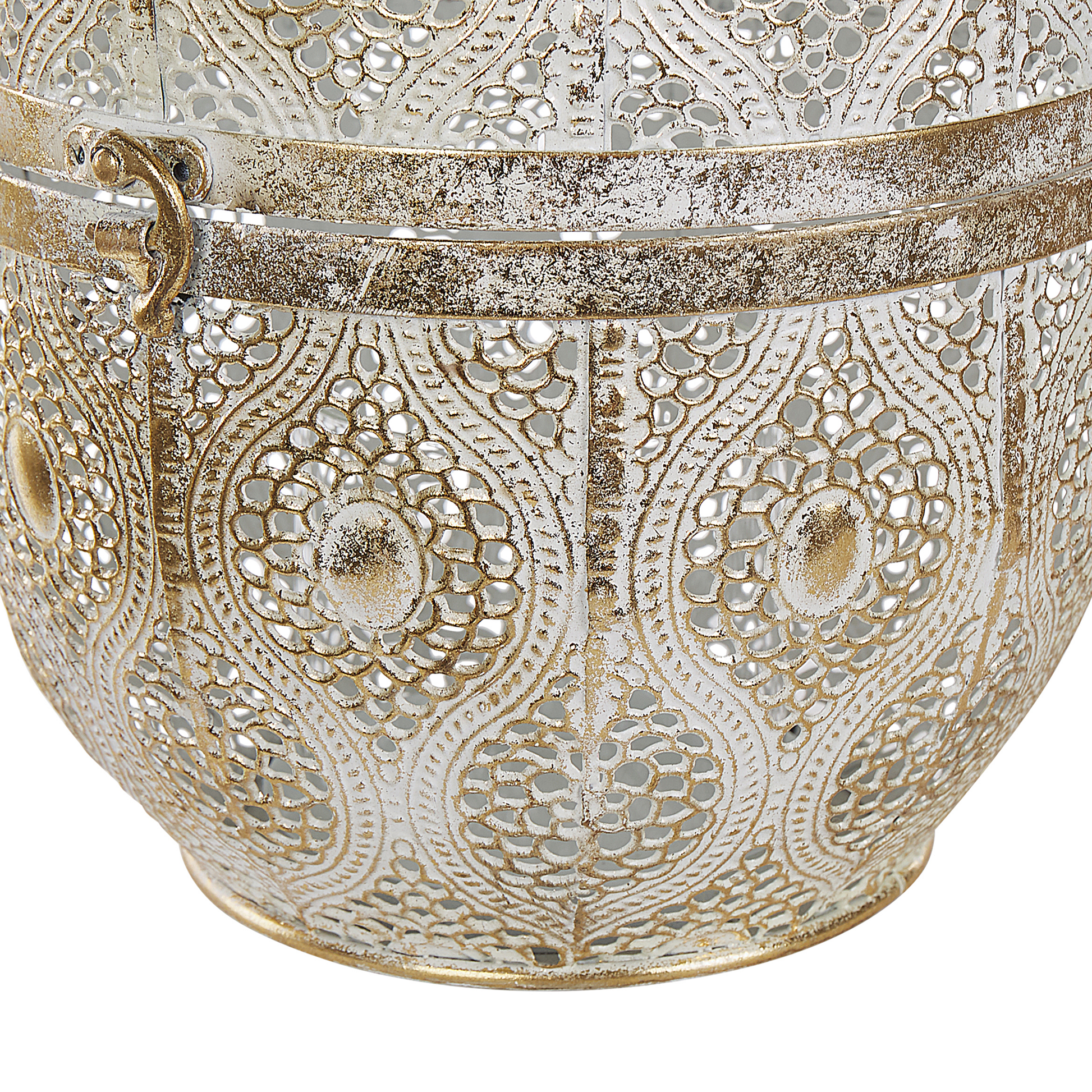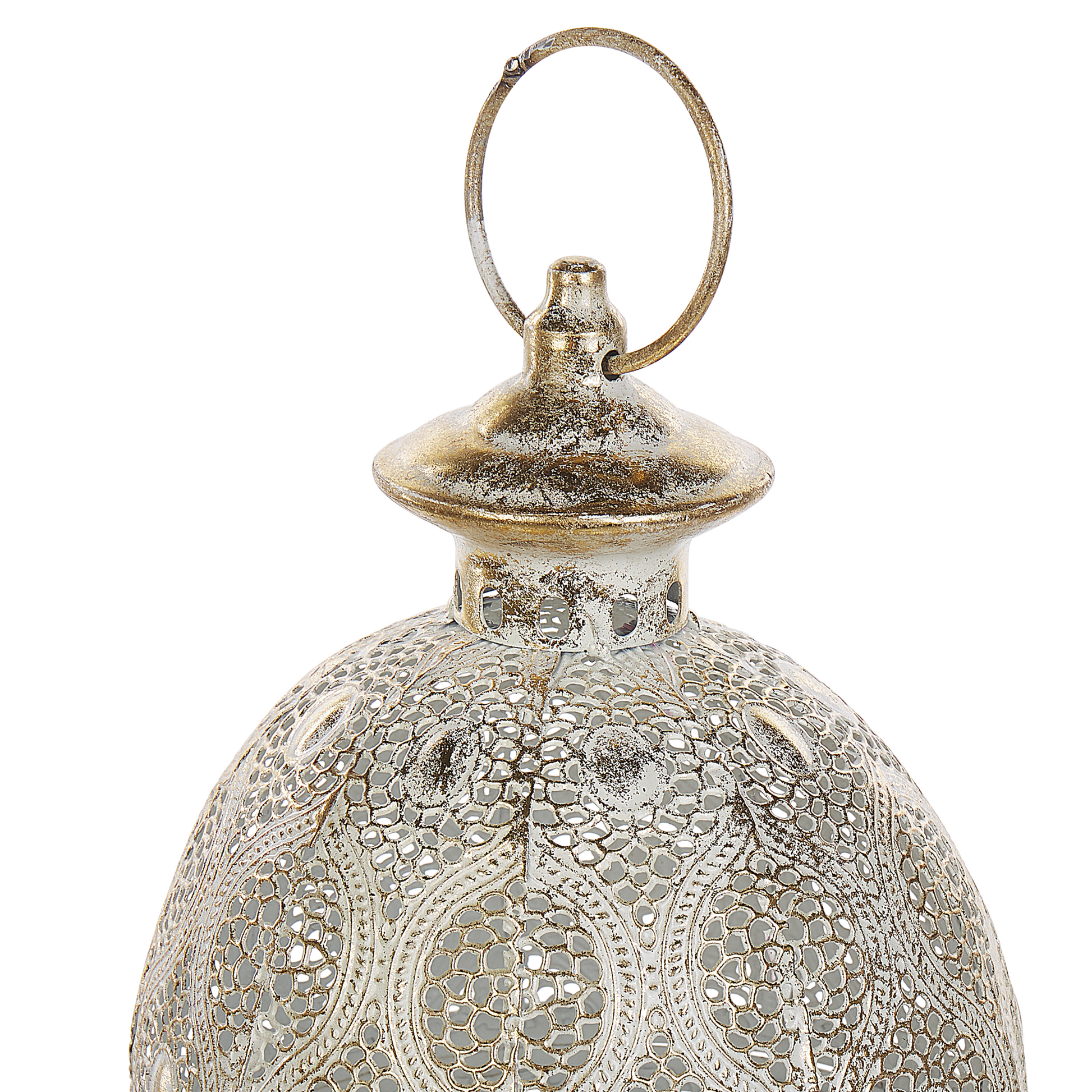 Beim Anblick dieser schmuckvollen Laterne ist der Gedanke an das kostspielige Faberge-Ei nicht weit! Dank dem dezenten Griff kann die Beleuchtung sowohl in hängender, als auch stehender Form eingesetzt werden. Die effektvolle Verbindung von hochwertigem Metall und Glas, sowie die wunderschönen, goldenen Verzierungen garantieren jedem Wohnraum ein gemütliches, dekadentes und äusserst luxuriöses Ambiente!   Material: Metall. Zusätzliches Material: Glas.  Gewicht: 1 Montage: Benötigt keine Montage Das Angebot beinhaltet: 1 x Laterne, Nicht im Lieferumfang enthalten: Kette Höhe: 34 zusätzliche Information: Der sichtbare Alterungseffekt, sowie jede Art von Verfärbung oder Abnutzung sind absichtlich und stellen keinen Qualitätsmangel des Produkts dar. Gestalten: Oval Breite: 19 Tiefe: 19 Art: Laterne Stil: Retro Allgemeine Farbe: Gold Hauptmaterial: Metall