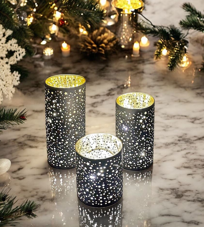 LED Windlicht schwarz aus Glas 3er Set Motiv: Sterne