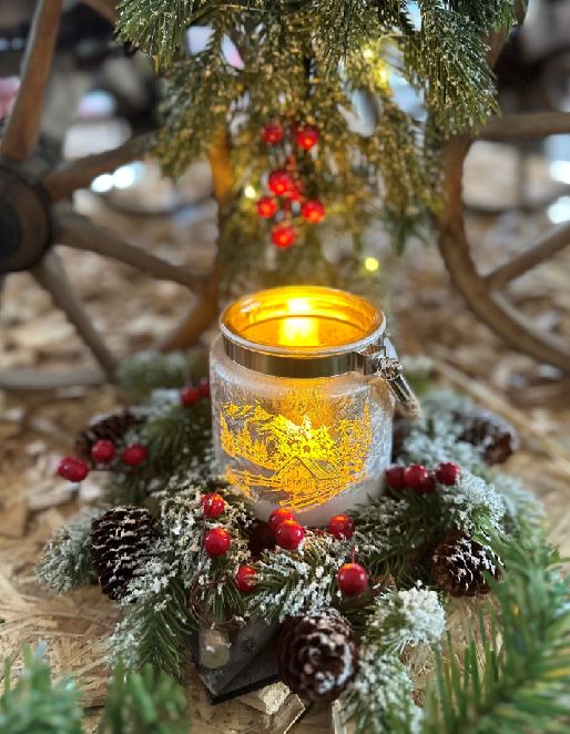 Windlicht aus Glas mit Hanfseil Henkel Bergdorfmotiv silber H10