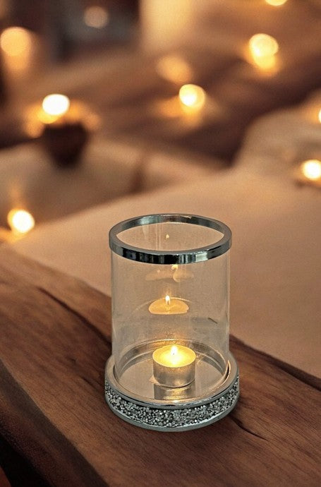 der Glaszylinder ist komplett abnehmbar D12cm x H17cm Für Teelichter, Kerzen oder Lichterketten geeignet der Sockel undder obere Abschluss sind aus silberfarbenem Metall