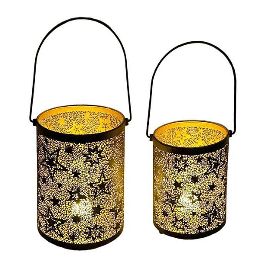 Windlicht 2er Set schwarz aus Metall mit Sternen Design und Henkel