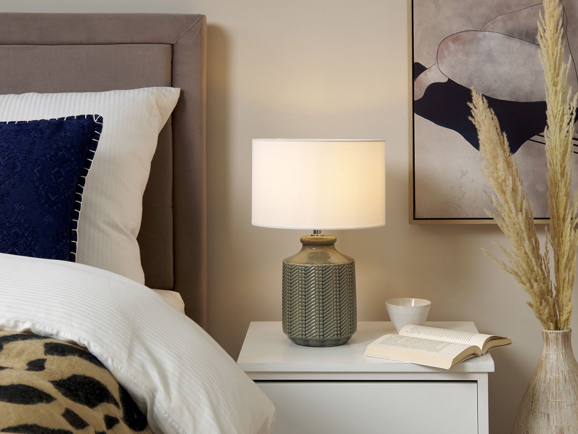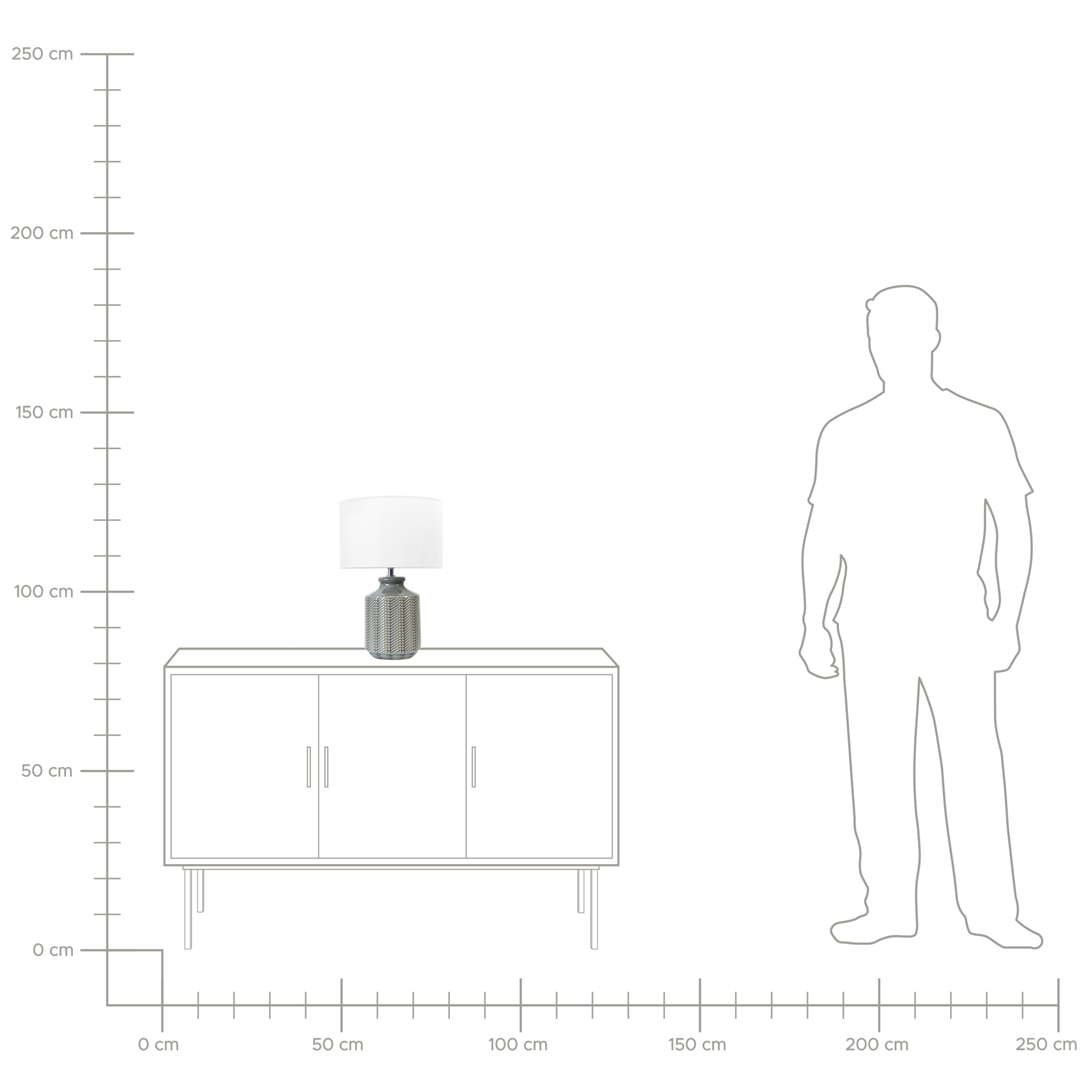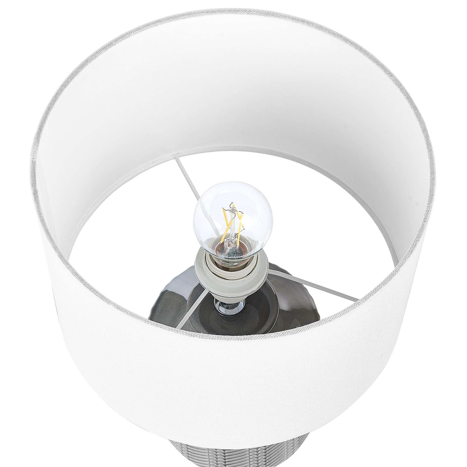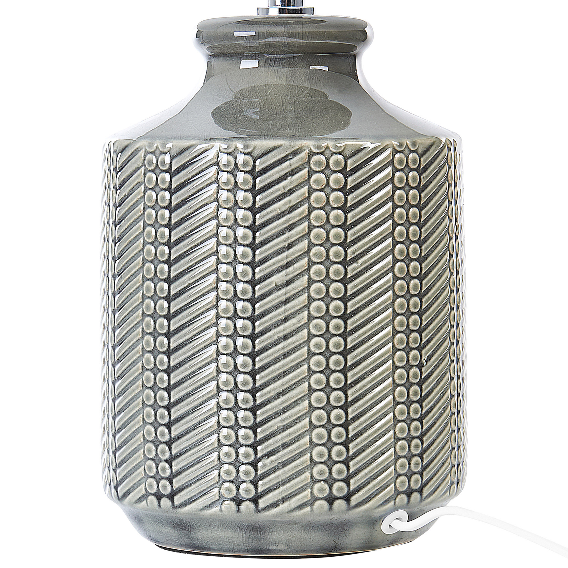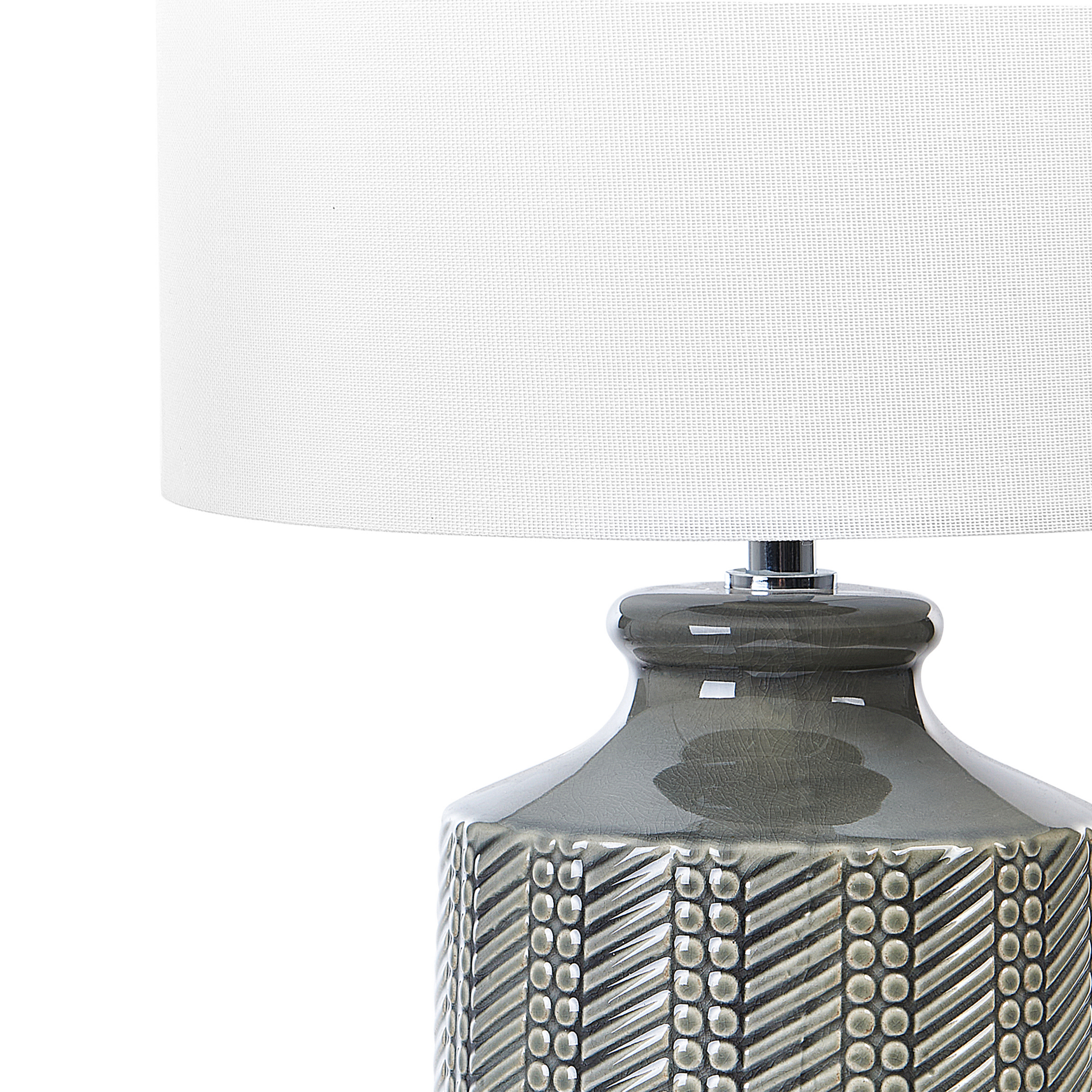 Dieser Tischleuchte gelingt es, Ihre Räume zu erhellen und gleichzeitig Ihre Inneneinrichtung aufzufrischen. Handgefertigt mit viel Liebe zum Detail, verfügt sie über einen Keramiksockel und einen Stoffschirm. Ein geometrisches Muster verleiht der Lampe einen trendigen Look und passt gut in jedes Wohnzimmer und Schlafzimmer.  Material: Keramik. Zusätzliches Material: Leinen, Baumwolle.  Material Zusammensetzung: 65% Leinen, 35% Baumwolle Gewicht: 1.6 Montage: Teilweise montiert Das Angebot beinhaltet: 1 x Tischleuchte, Nicht im Lieferumfang enthalten: Leuchtmittel Höhe: 43 zusätzliche Information: Diese Leuchte ist geeignet für Leuchtmittel der Energieklassen A bis G auf einer Skala von A (sehr effizient) bis G (weniger effizient). Geeignet für: LED Leuchtmittel, Eco-Halogen Leuchtmittel, Energiesparleuchtmittel., Die Stromkabel dürfen nur von einem qualifizierten Elektriker angepasst werden., Da jedes Produkt handgefertigt wird, kann es zu kleineren Abweichungen in der Farbe und der äusseren Struktur kommen. Diese Abweichungen stellen keinen Qualitätsmangel dar, sondern sind eine warentypische Eigenschaft. Breite: 28 Tiefe: 28 Art: Tischleuchte Stil: Modern Allgemeine Farbe: Grau Hauptmaterial: Keramik Fassung: 40 W IP Protection Code: IP 20