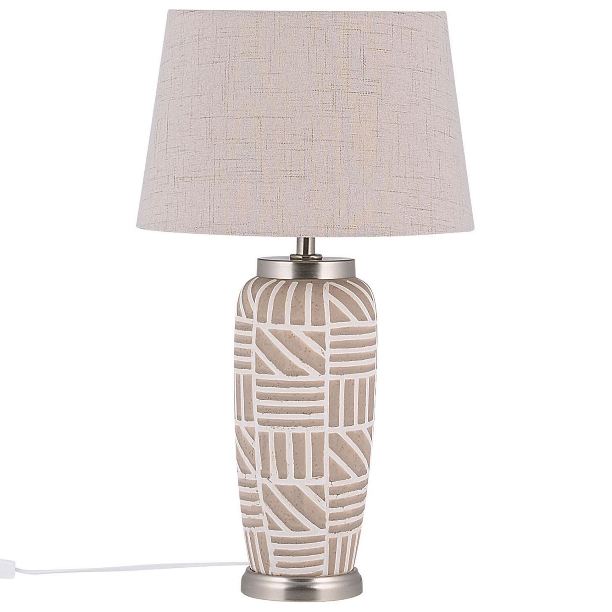 Der leichte und klassische Lampenschirm verleiht jedem Raum ein gemütliches Ambiente und bringt Ihr Wohn- oder Schlafzimmer zum Strahlen. Er kombiniert sich prächtig mit dem Lampenfuss aus hochwertiger Keramik, der durch das äusserst dekorative geometrische Muster bestehend aus Quadraten und Linien die Tischlampe zu einem wirklichen Highlight Ihrer Innenausstattung macht. Material: Keramik. Zusätzliches Material: Polyester, Baumwolle. Material Zusammensetzung: 65% Polyester, 35% Baumwolle Gewicht: 3 Montage: Teilweise montiert Das Angebot beinhaltet: 1 x Tischleuchte, Nicht im Lieferumfang enthalten: Leuchtmittel Höhe: 48 zusätzliche Information: Diese Leuchte ist geeignet für Leuchtmittel der Energieklassen A bis G auf einer Skala von A (sehr effizient) bis G (weniger effizient). Geeignet für: LED Leuchtmittel, Eco-Halogen Leuchtmittel, Energiesparleuchtmittel., Die Stromkabel dürfen nur von einem qualifizierten Elektriker angepasst werden. Breite: 28 Tiefe: 28 Art: Tischleuchte Stil: Retro Allgemeine Farbe: Beige Hauptmaterial: Keramik Fassung: Max. 40 W IP Protection Code: IP 20