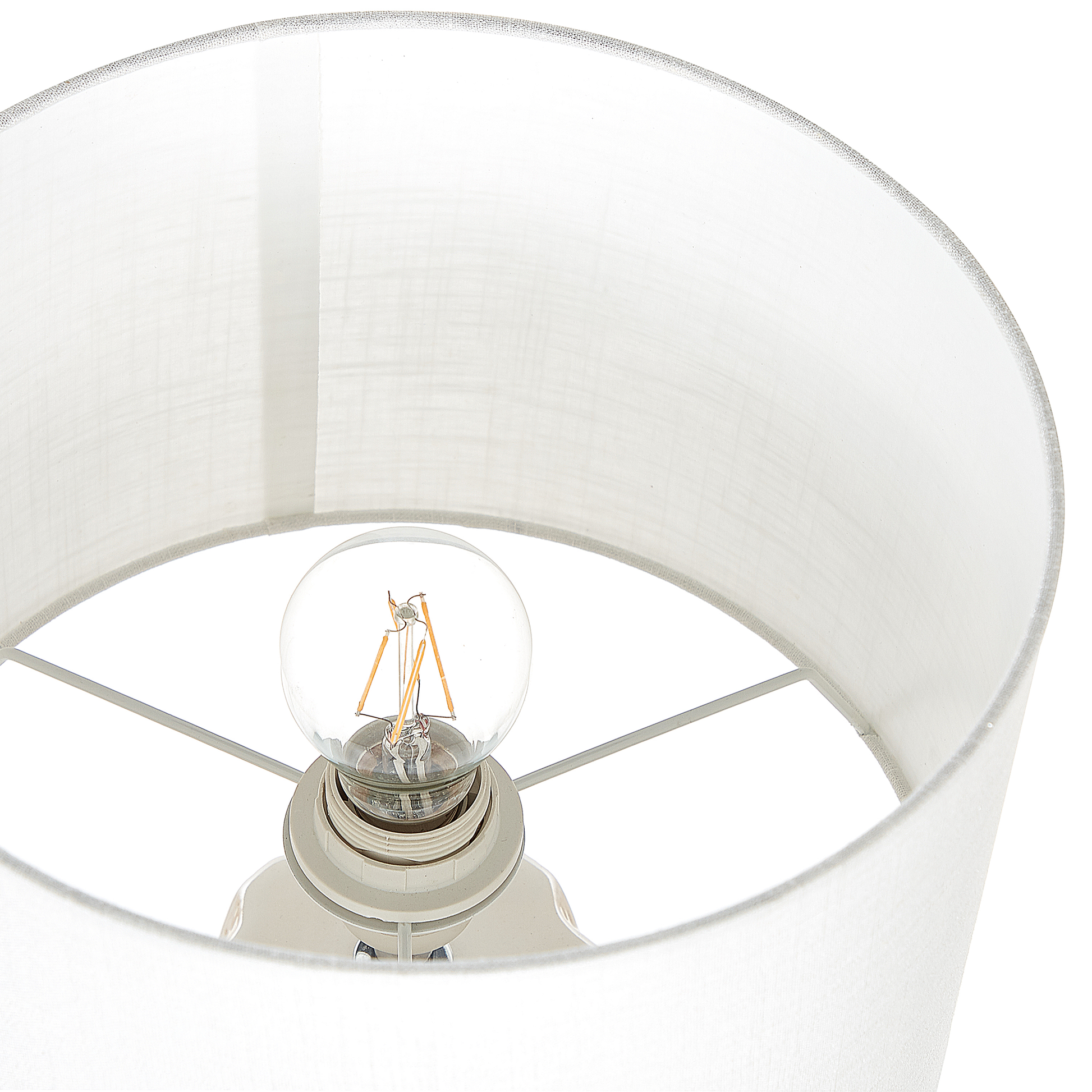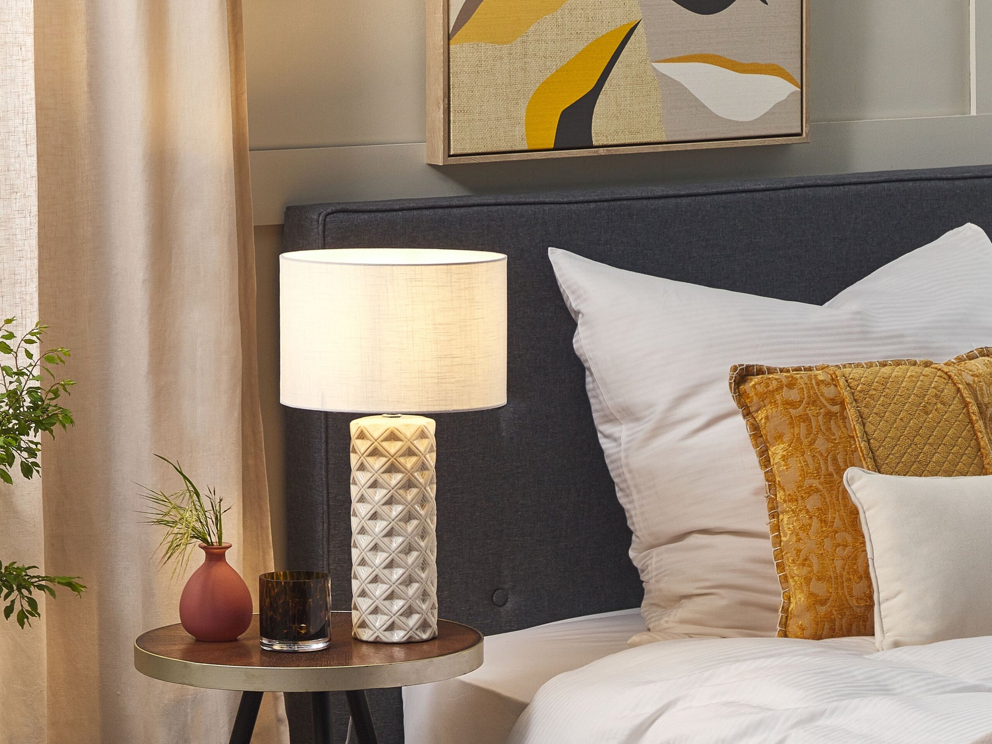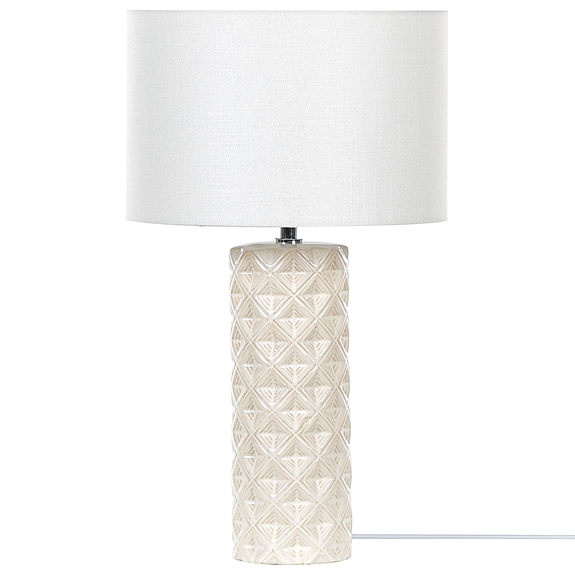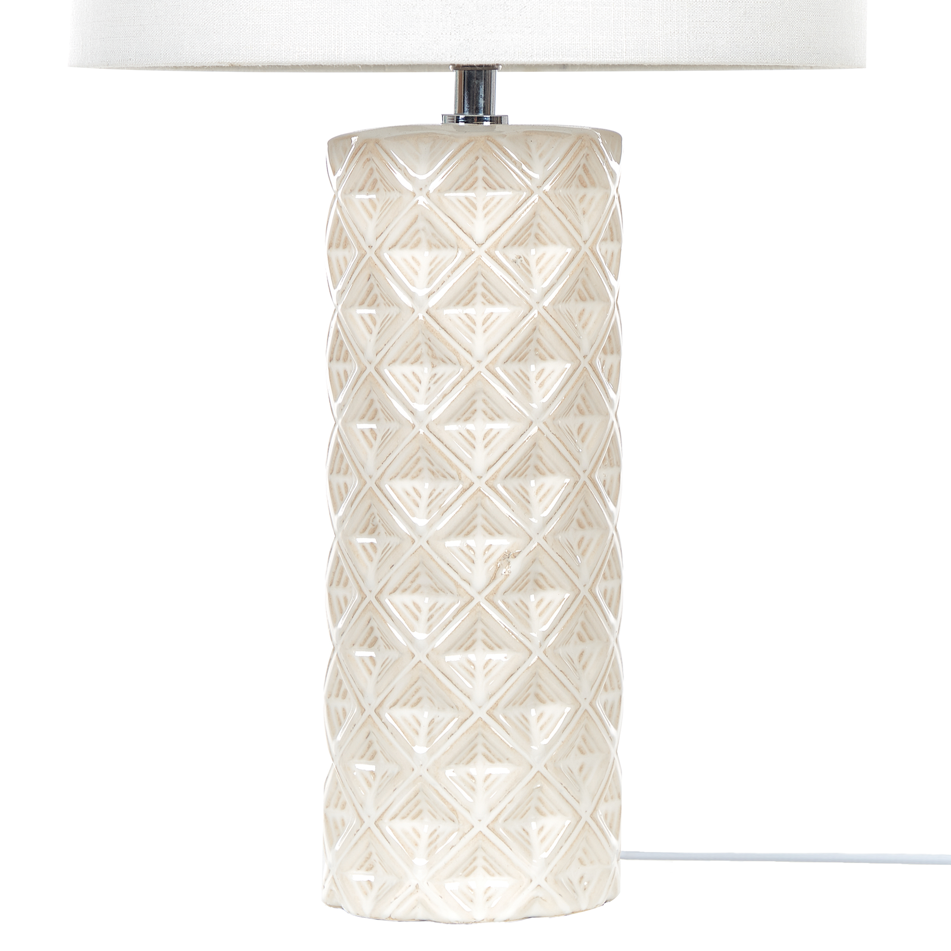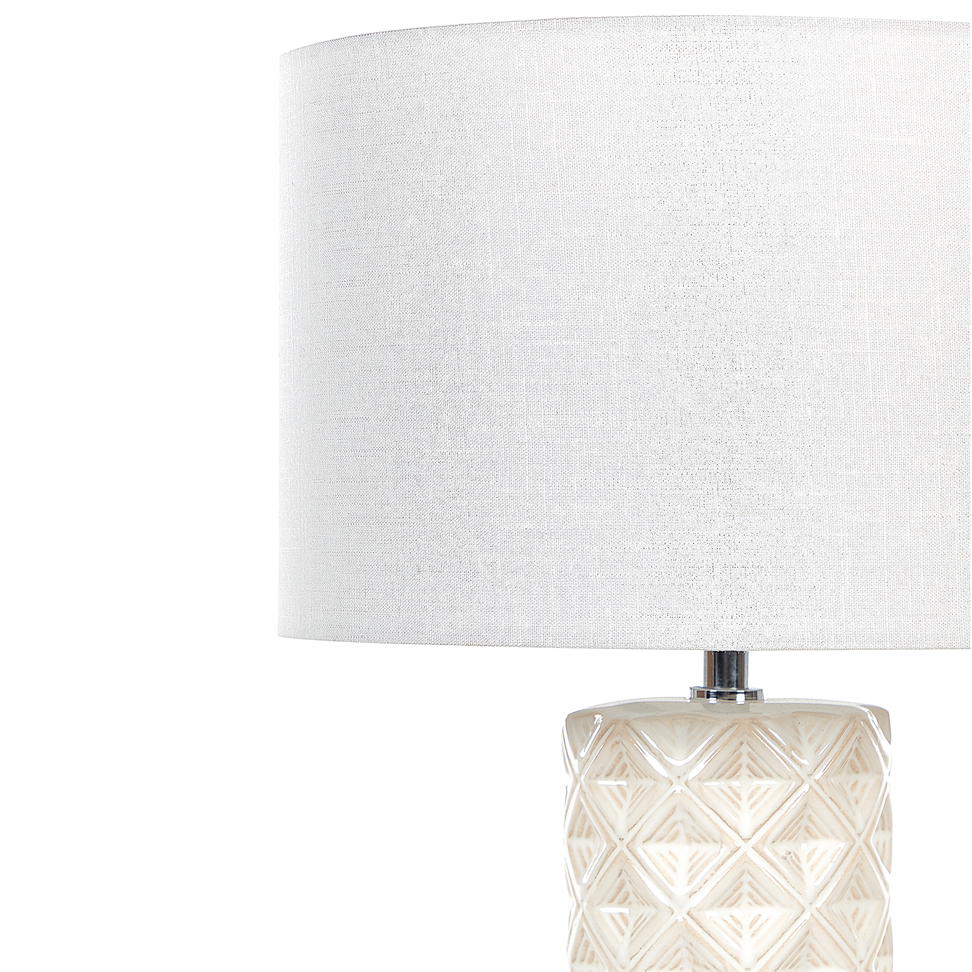 Diese elegante Tischleuchte ist eine wunderbare Möglichkeit, eine stilvolle Beleuchtung in Ihren Wohnraum zu bringen. Der glamouröse Lampenfuss aus Keramik ist mit einem modernen, geometrischen Muster versehen. Ausserdem ist die Leuchte mit einem klassischen, trommelförmigen Lampenschirm ausgestattet, der für eine gemütliche Atmosphäre in Ihrem Haus sorgt. Dieses Wohnaccessoire ist eine ideale Ergänzung für jedes Schlafzimmer, Wohnzimmer oder Home-Office.  Material: Keramik. Zusätzliches Material: Baumwolle, Jute.  Material Zusammensetzung: 65% Jute, 35% Baumwolle Gewicht: 2 Montage: Teilweise montiert Das Angebot beinhaltet: 1 x Tischleuchte, Nicht im Lieferumfang enthalten: Leuchtmittel Höhe: 49 zusätzliche Information: Diese Leuchte ist geeignet für Leuchtmittel der Energieklassen A bis G auf einer Skala von A (sehr effizient) bis G (weniger effizient). Geeignet für: LED Leuchtmittel, Eco-Halogen Leuchtmittel, Energiesparleuchtmittel., Die Stromkabel dürfen nur von einem qualifizierten Elektriker angepasst werden., Da jedes Produkt handgefertigt wird, kann es zu kleineren Abweichungen in der Farbe und der äusseren Struktur kommen. Diese Abweichungen stellen keinen Qualitätsmangel dar, sondern sind eine warentypische Eigenschaft. Breite: 28 Tiefe: 28 Art: Tischleuchte Stil: Modern Allgemeine Farbe: Beige Hauptmaterial: Keramik Fassung: 40 W IP Protection Code: IP 20