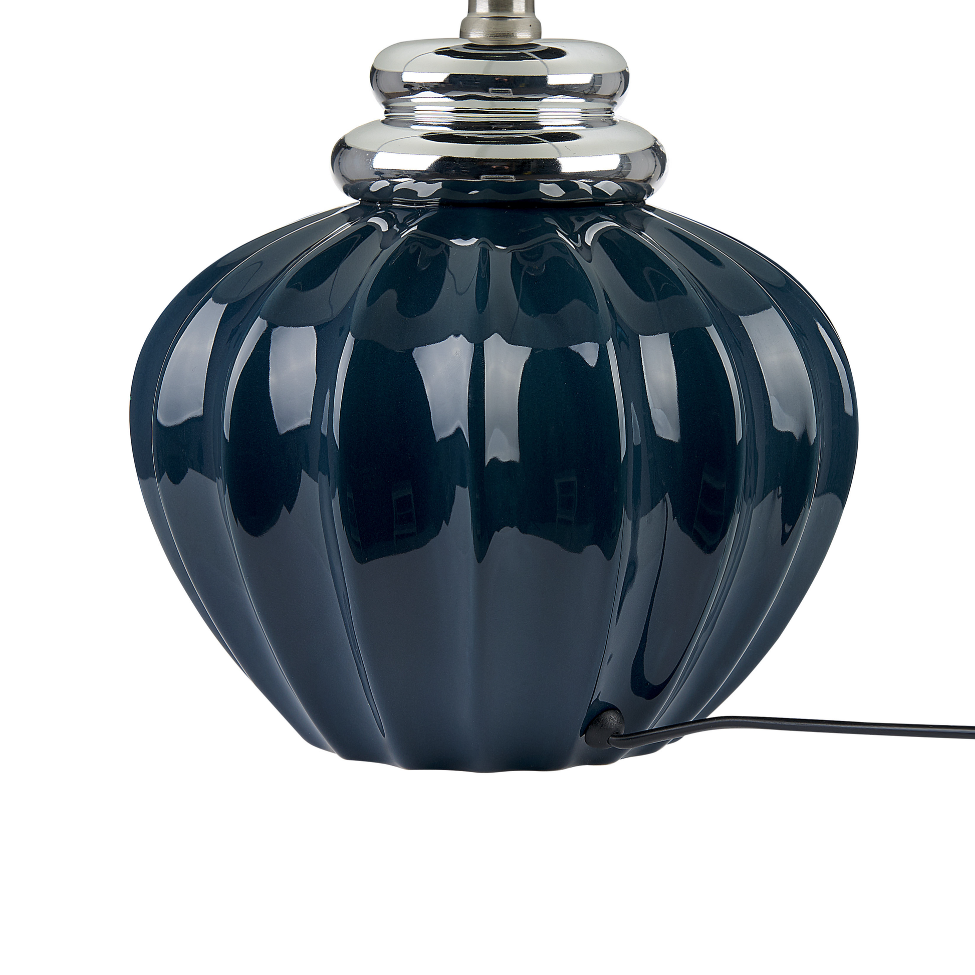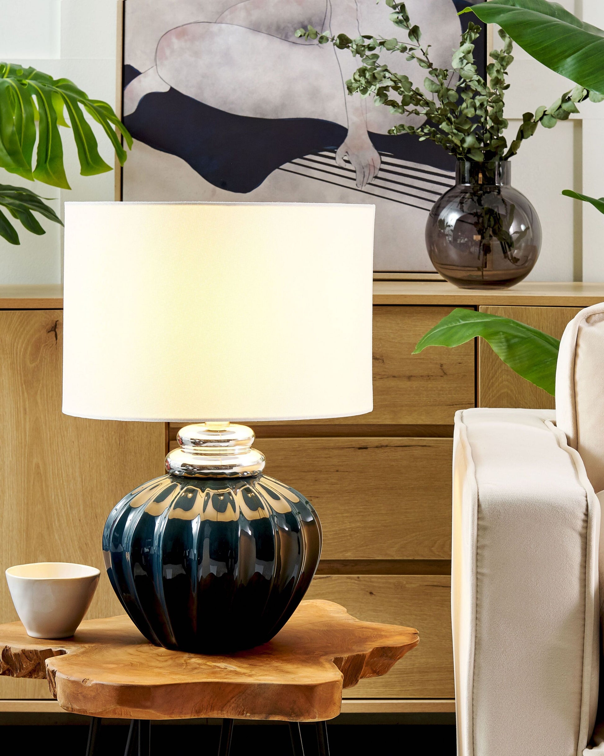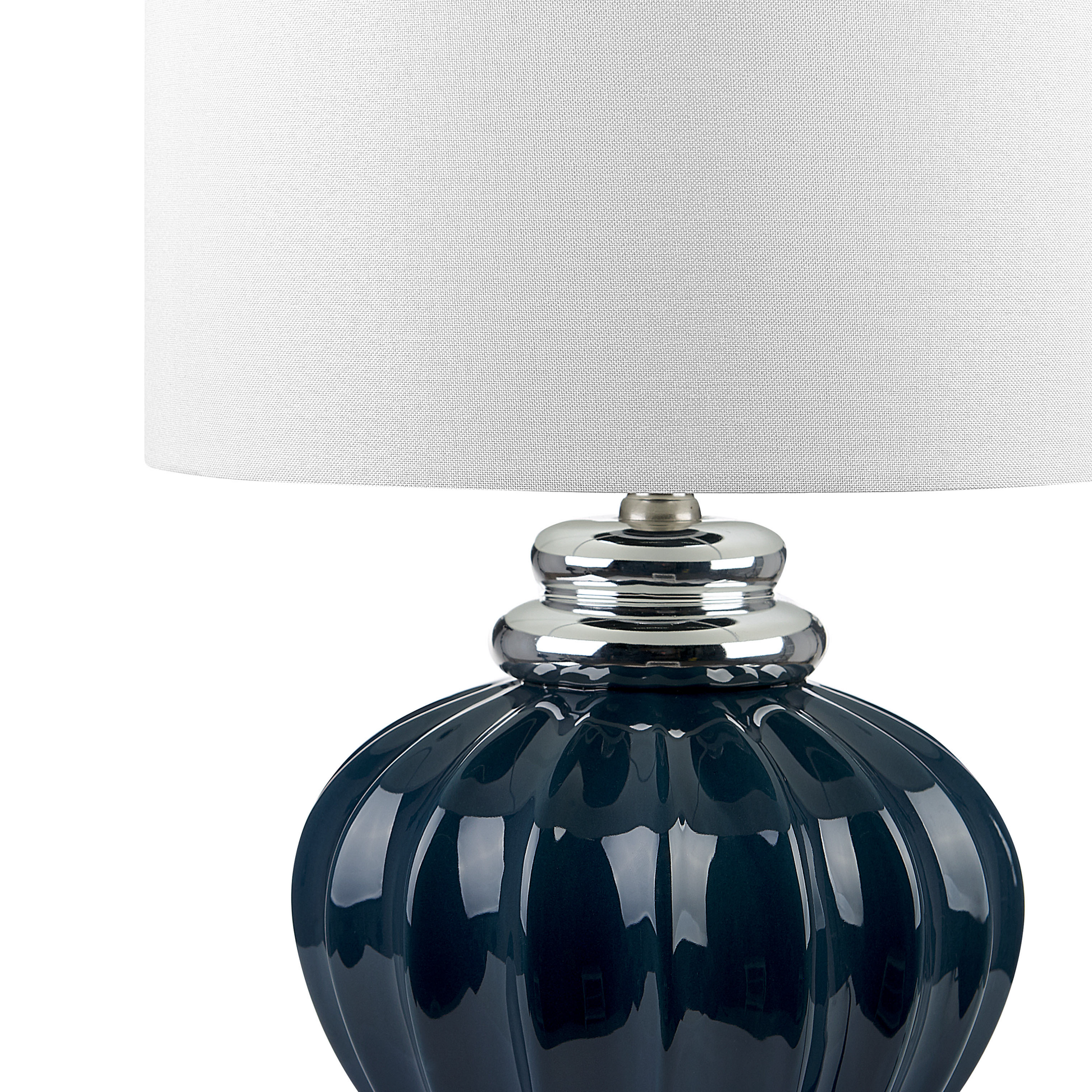 Die klassische Formgebung dieser stilvollen Tischlampe unterstreicht ihre elegante Ausstrahlung. Der geschwungene Lampenfuss aus Keramik glänzt in extravagantem Dunkelblau und silberfarbene Details am oberen Rand sorgen für einen reizvollen Kontrast. Der runde, leicht konisch geformte Lampenschirm aus cremefarbenem Stoff sorgt für angenehmes, warmes Licht. Das schwarze PVC Kabel ist mit einem Schalter versehen. Material: Keramik. Zusätzliches Material: Poly-Baumwolle. Material Zusammensetzung: 100% Leinen Gewicht: 3 Montage: Teilweise montiert Das Angebot beinhaltet: 1 x Tischleuchte, Nicht im Lieferumfang enthalten: Leuchtmittel Höhe: 45 zusätzliche Information: Diese Leuchte ist geeignet für Leuchtmittel der Energieklassen A bis G auf einer Skala von A (sehr effizient) bis G (weniger effizient). Geeignet für: LED Leuchtmittel, Eco-Halogen Leuchtmittel, Energiesparleuchtmittel., Die Stromkabel dürfen nur von einem qualifizierten Elektriker angepasst werden. Breite: 33 Tiefe: 33 Art: Tischleuchte Stil: Retro Allgemeine Farbe: Blau Schatten: Creme Hauptmaterial: Keramik Fassung: Max. 60 W IP Protection Code: IP 20