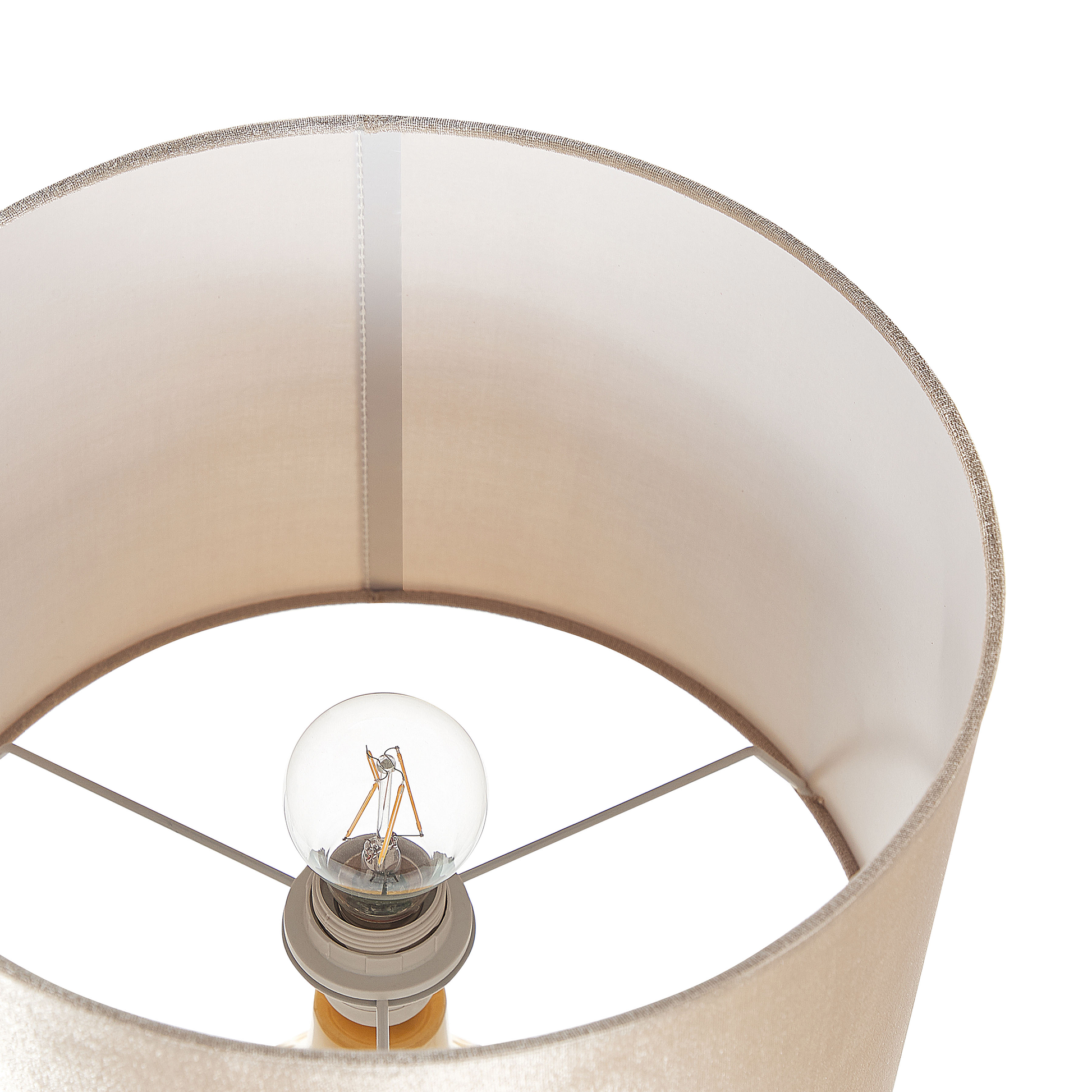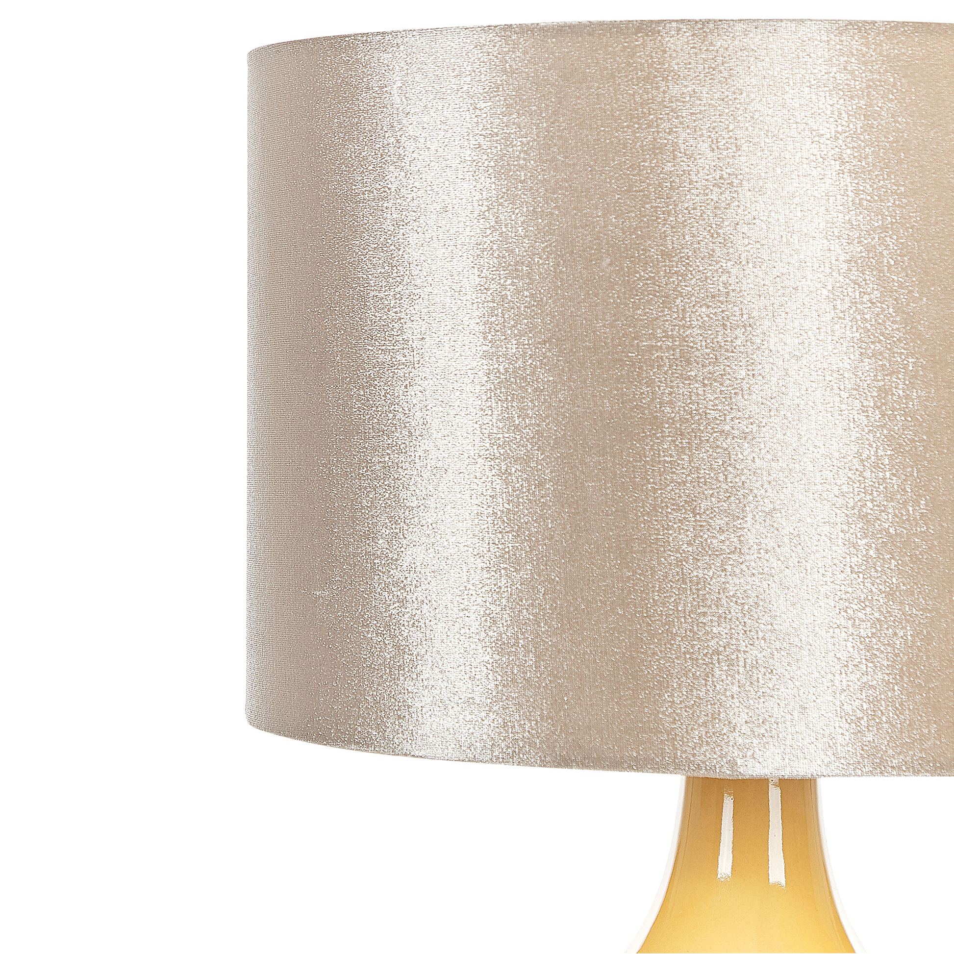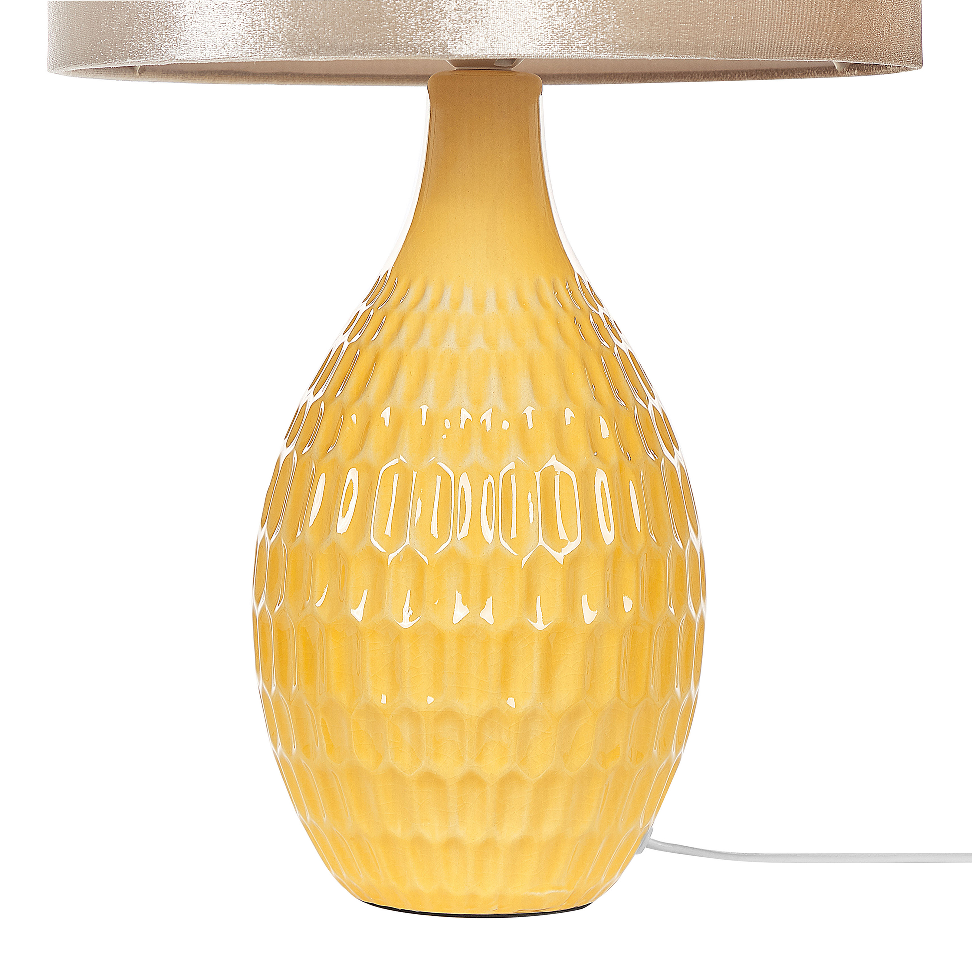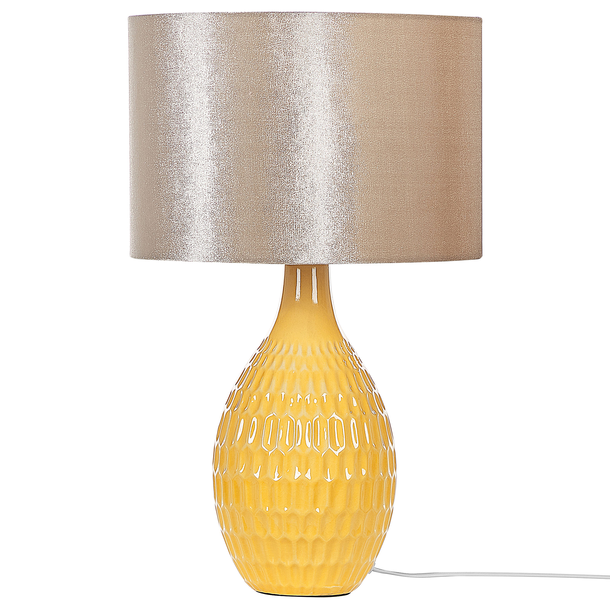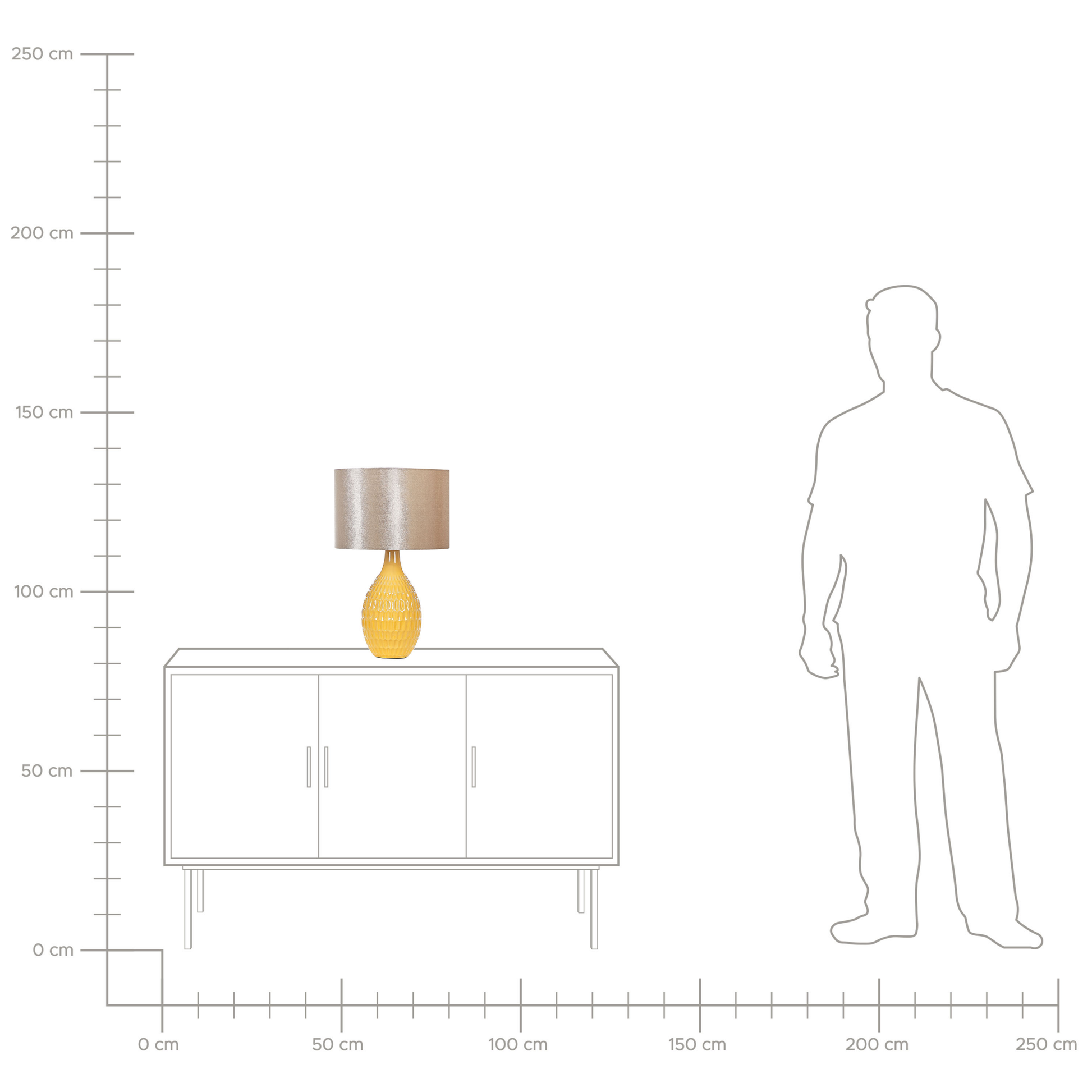 Diese Retro-Tischlampe erinnert an den Stil der siebziger Jahre und verbindet Glamour mit Eleganz. Der Keramikkörper ist farbenfroh und mit einer dekorativen Prägung versehen. Darüber befindet sich ein goldglänzender Lampenschirm, der das Licht streut, aber auch ein interessantes Element darstellt. Sie eignet sich wunderbar für das Wohnzimmer neben dem Sofa oder für das Schlafzimmer neben dem Bett.  Material: Keramik. Zusätzliches Material: Samtstoff.  Material Zusammensetzung: 100% Polyester Gewicht: 2 Montage: Benötigt keine Montage Das Angebot beinhaltet: 1 x Tischleuchte, Nicht im Lieferumfang enthalten: Leuchtmittel Höhe: 52 zusätzliche Information: Diese Leuchte ist geeignet für Leuchtmittel der Energieklassen A bis G auf einer Skala von A (sehr effizient) bis G (weniger effizient). Geeignet für: LED Leuchtmittel, Eco-Halogen Leuchtmittel, Energiesparleuchtmittel., Die Stromkabel dürfen nur von einem qualifizierten Elektriker angepasst werden. Breite: 32 Tiefe: 32 Art: Tischleuchte Stil: Glamourös Allgemeine Farbe: Gelb Hauptmaterial: Keramik Fassung: 40 W IP Protection Code: IP 20