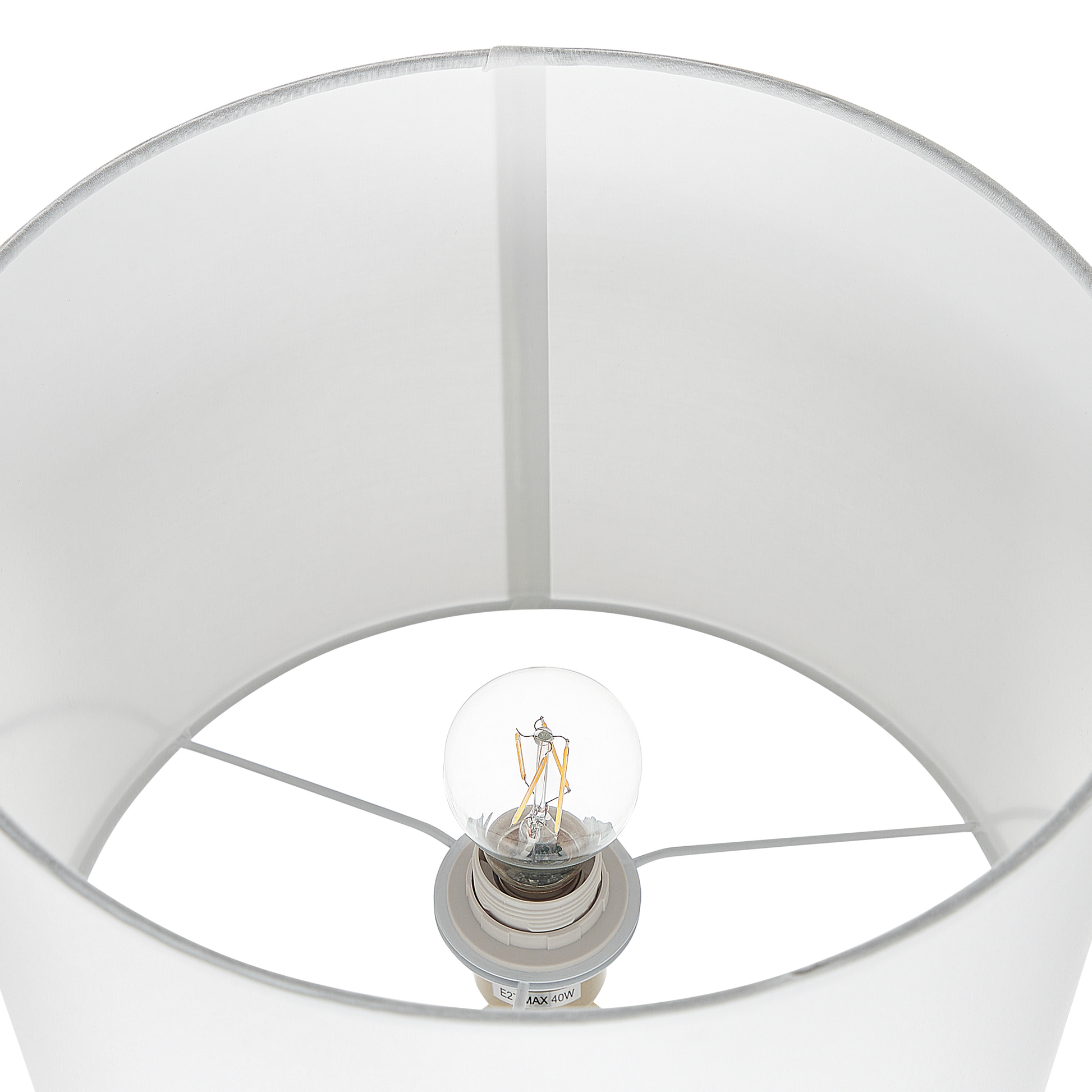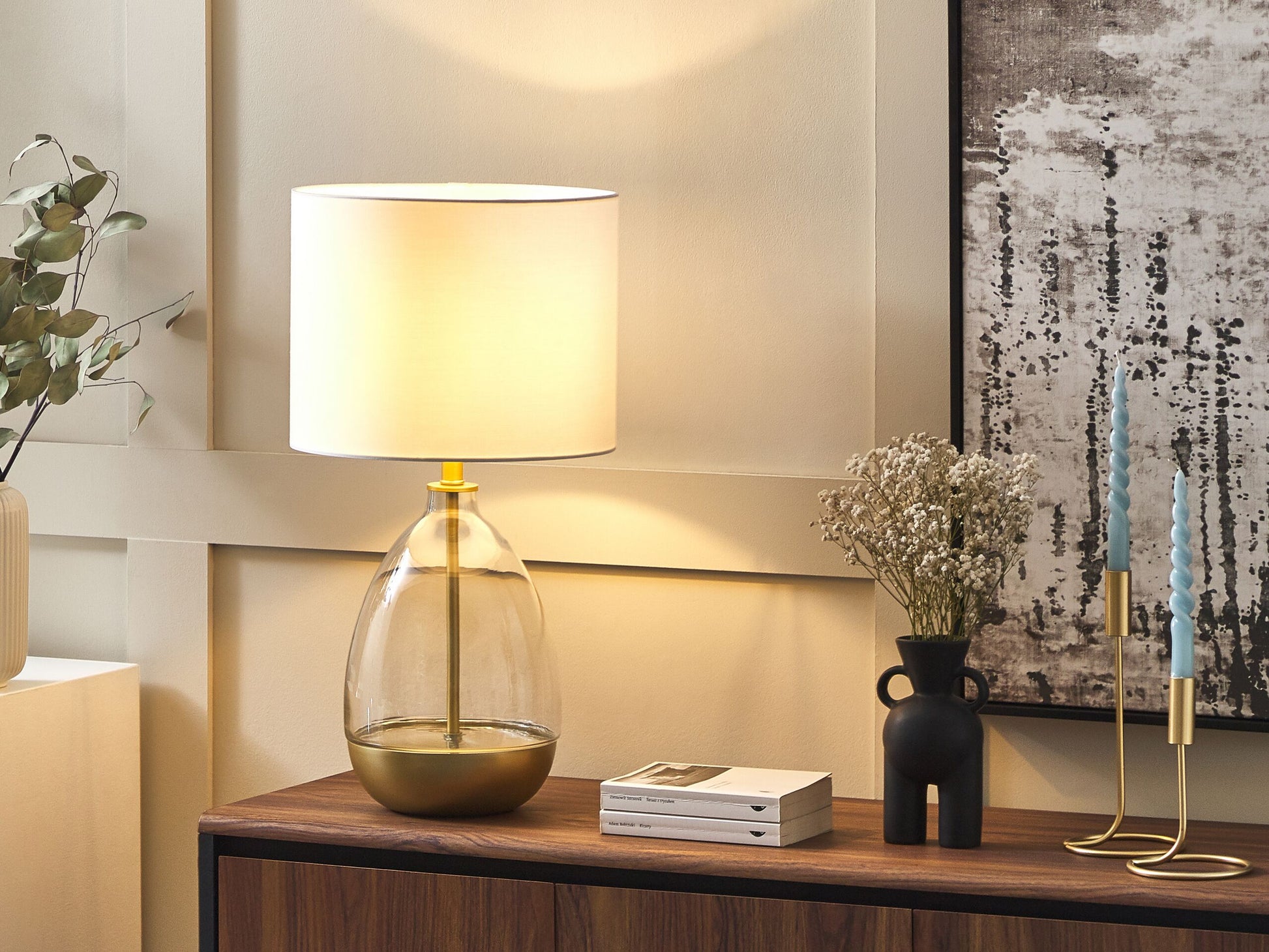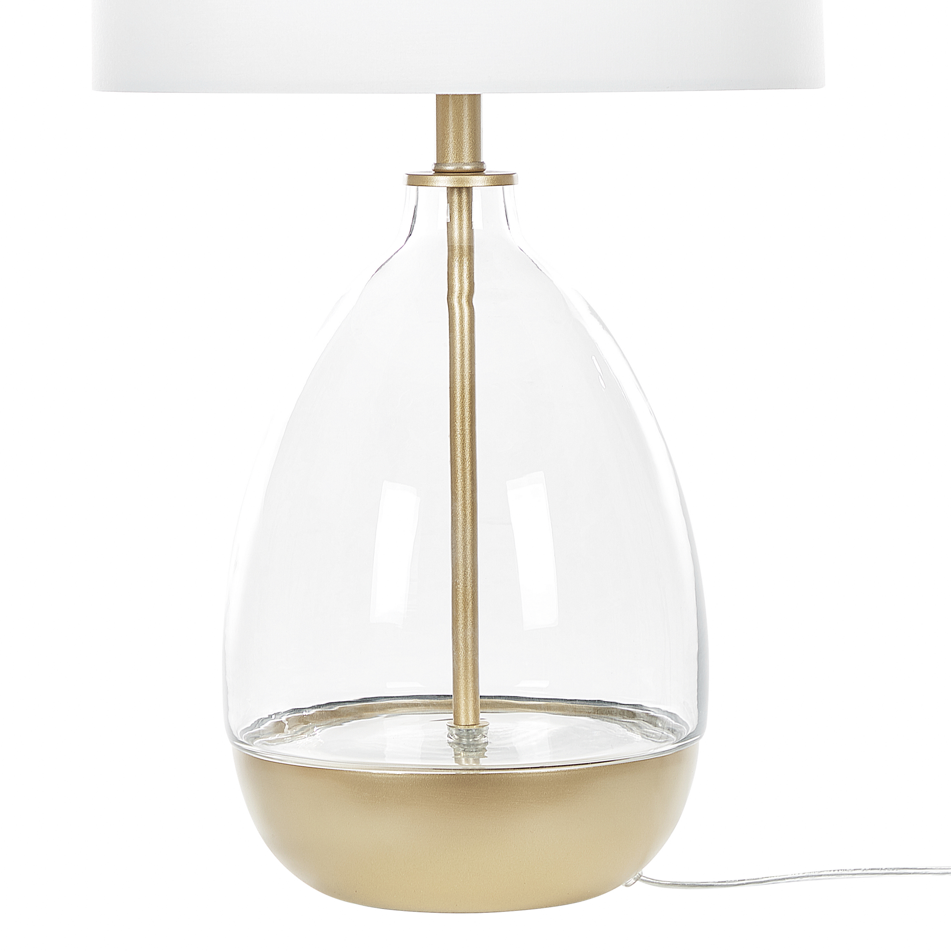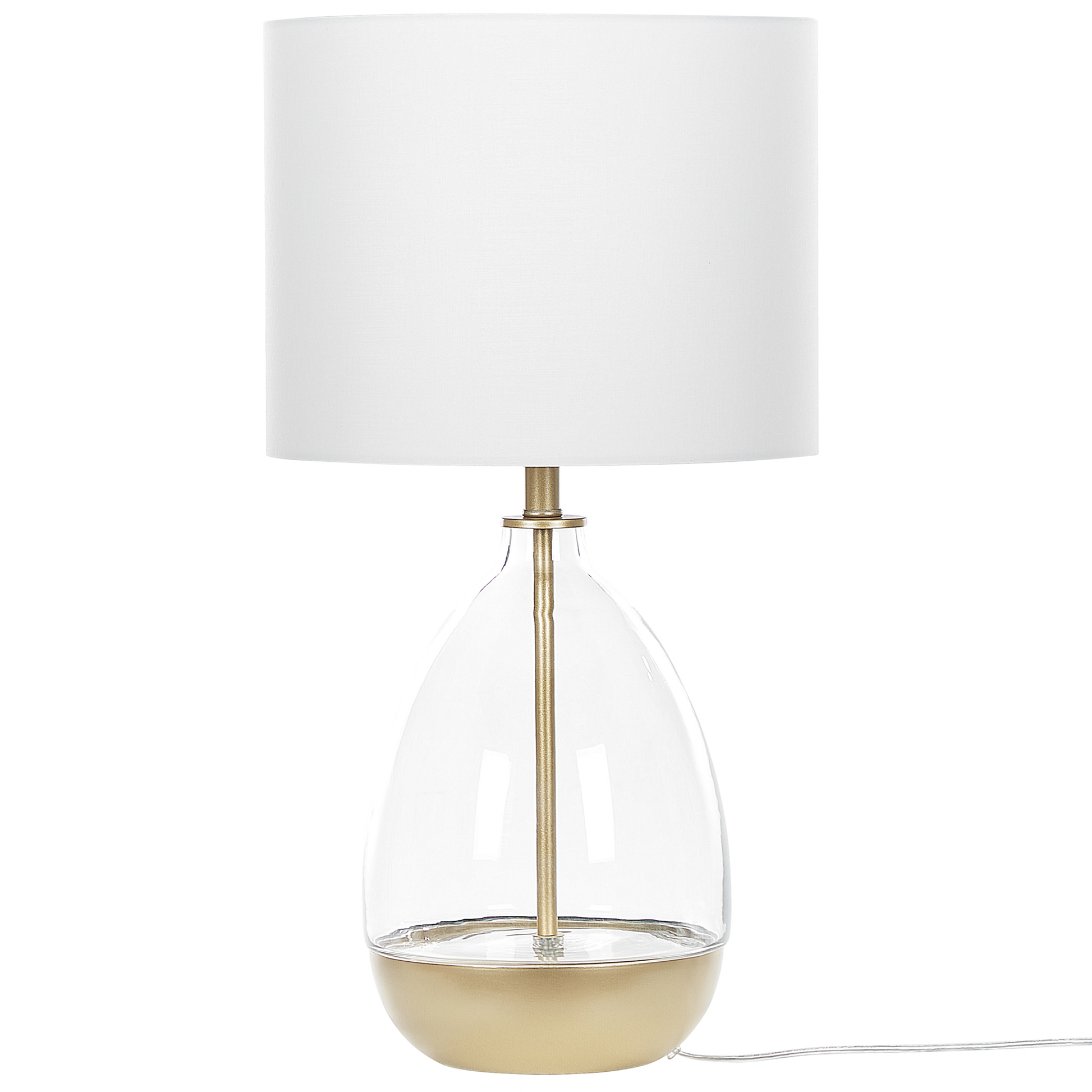 Mit dieser modischen Tischlampe bekommt Ihr Wohn- oder Schlafzimmer ein auffälliges Accessoire. Das besondere Detail dieser Lampe ist der Standfuss, welcher durch die Kombination von goldfarbenem Stahl und Glas an eine filigrane Vase erinnert. Dazu ergänzt der runde Lampenschirm mit weissem Stoff das ausgefallene Design und bringt weiches, indirektes Licht in den Raum.  Material: Glas. Zusätzliches Material: Stahl, Polyester, Baumwolle.  Material Zusammensetzung: 50 % Baumwolle, 50 % Polyester Gewicht: 2 Montage: Teilweise montiert Das Angebot beinhaltet: 1 x Tischleuchte, Nicht im Lieferumfang enthalten: Leuchtmittel Höhe: 63 zusätzliche Information: Diese Leuchte ist geeignet für Leuchtmittel der Energieklassen A bis G auf einer Skala von A (sehr effizient) bis G (weniger effizient). Geeignet für: LED Leuchtmittel, Eco-Halogen Leuchtmittel, Energiesparleuchtmittel., Die Stromkabel dürfen nur von einem qualifizierten Elektriker angepasst werden. Breite: 33 Tiefe: 33 Art: Tischleuchte Stil: Modern Allgemeine Farbe: Weiss Hauptmaterial: Glas Fassung: 40 W IP Protection Code: IP 20