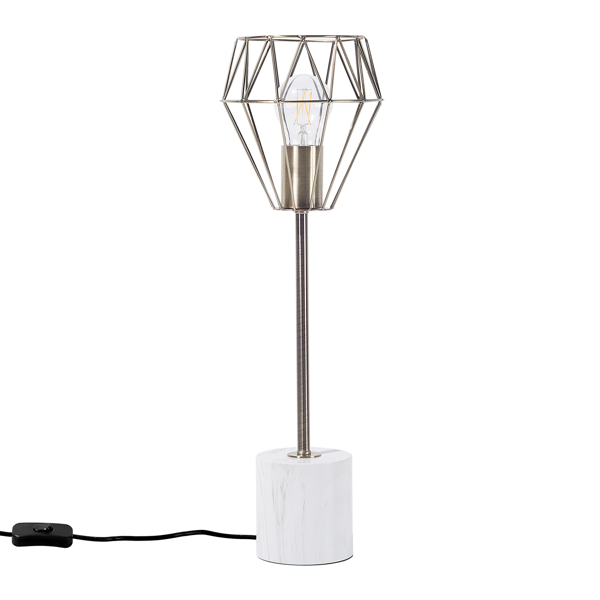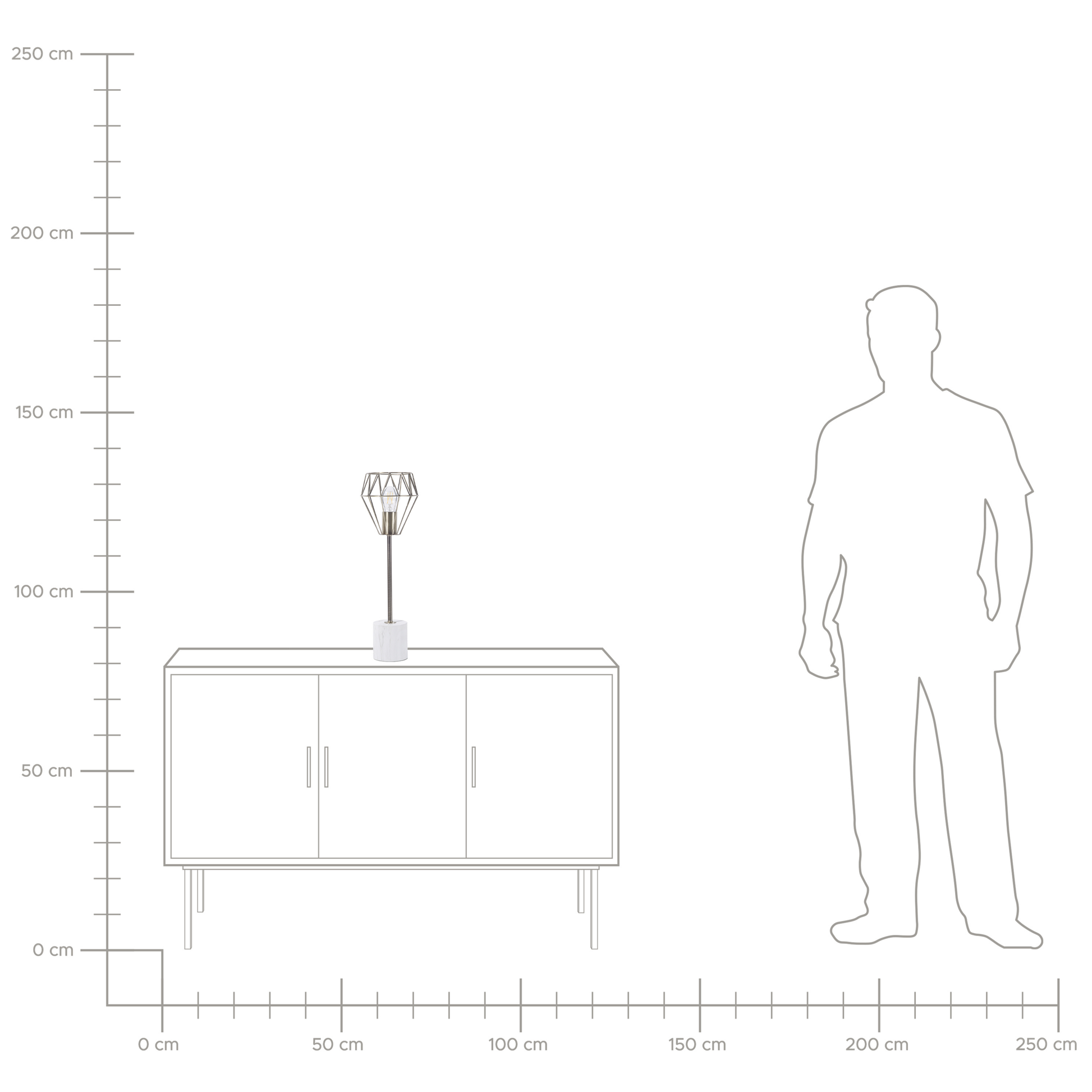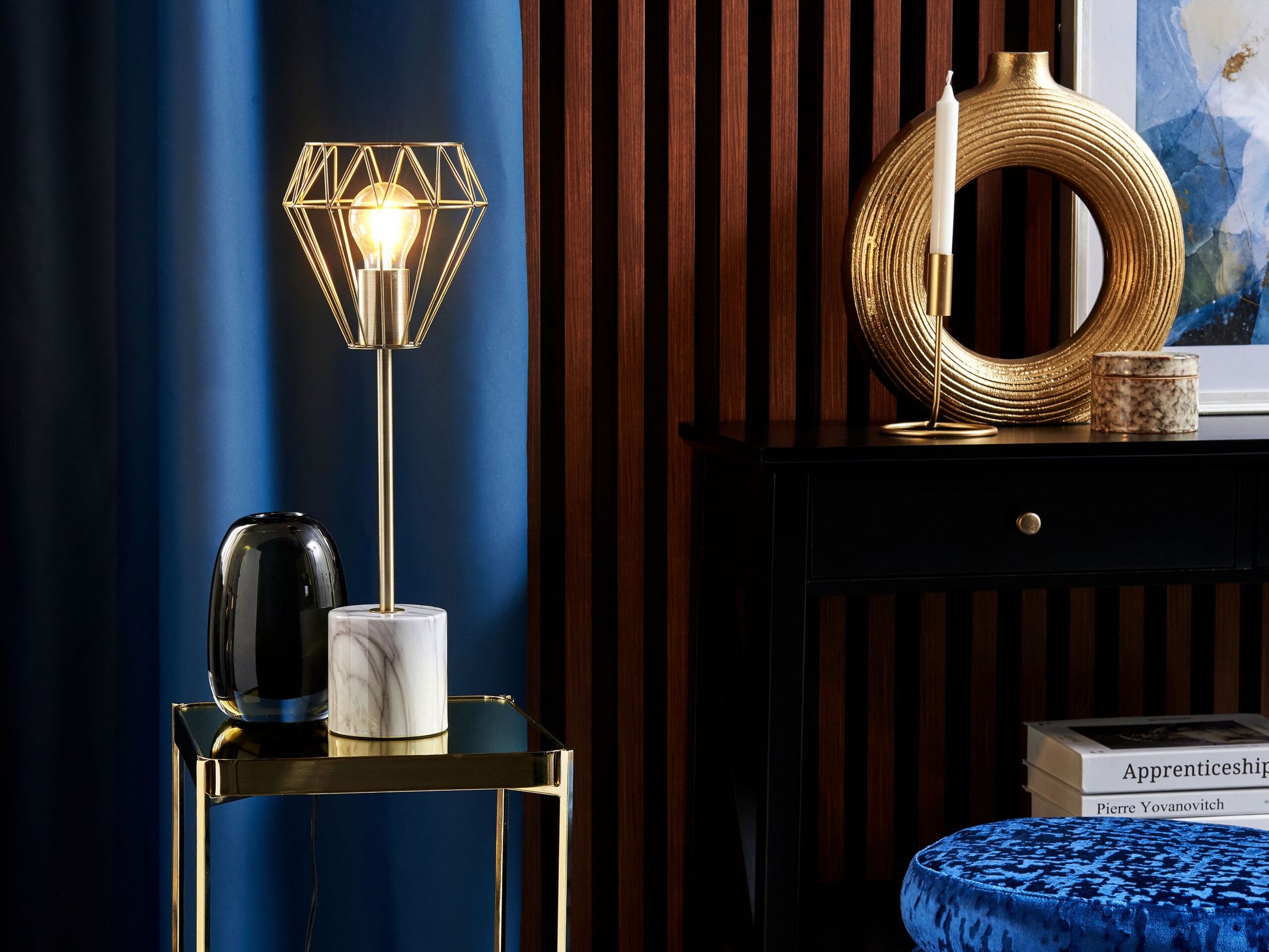 Modernes Design auf höchstem Niveau. Schlanke Formen in goldfarbenem Metall betonen die elegante Ausstrahlung dieser Tischlampe. Der diamantförmige Lampenschirm besteht aus einem Gitter aus filigranen Metallstreben und lenkt den Blick dank seiner offenen Gestaltung ganz gezielt auf das Leuchtmittel. Die offene Struktur zaubert spannende Licht- und Schatteneffekte auf Ihre Wände und ein runder Lampenfuss aus Marmor sorgt für Stabilität.  Material: Metall. Zusätzliches Material: PVC.  Gewicht: 1 Montage: Teilweise montiert Das Angebot beinhaltet: 1 x Tischleuchte, Nicht im Lieferumfang enthalten: Leuchtmittel Höhe: 49 zusätzliche Information: Diese Leuchte ist geeignet für Leuchtmittel der Energieklassen A bis G auf einer Skala von A (sehr effizient) bis G (weniger effizient). Geeignet für: LED Leuchtmittel, Eco-Halogen Leuchtmittel, Energiesparleuchtmittel., Die Stromkabel dürfen nur von einem qualifizierten Elektriker angepasst werden. Breite: 13 Tiefe: 13 Art: Tischleuchte Stil: Industriell Allgemeine Farbe: Messing Hauptmaterial: Metall Fassung: Max. 60 W IP Protection Code: IP 20