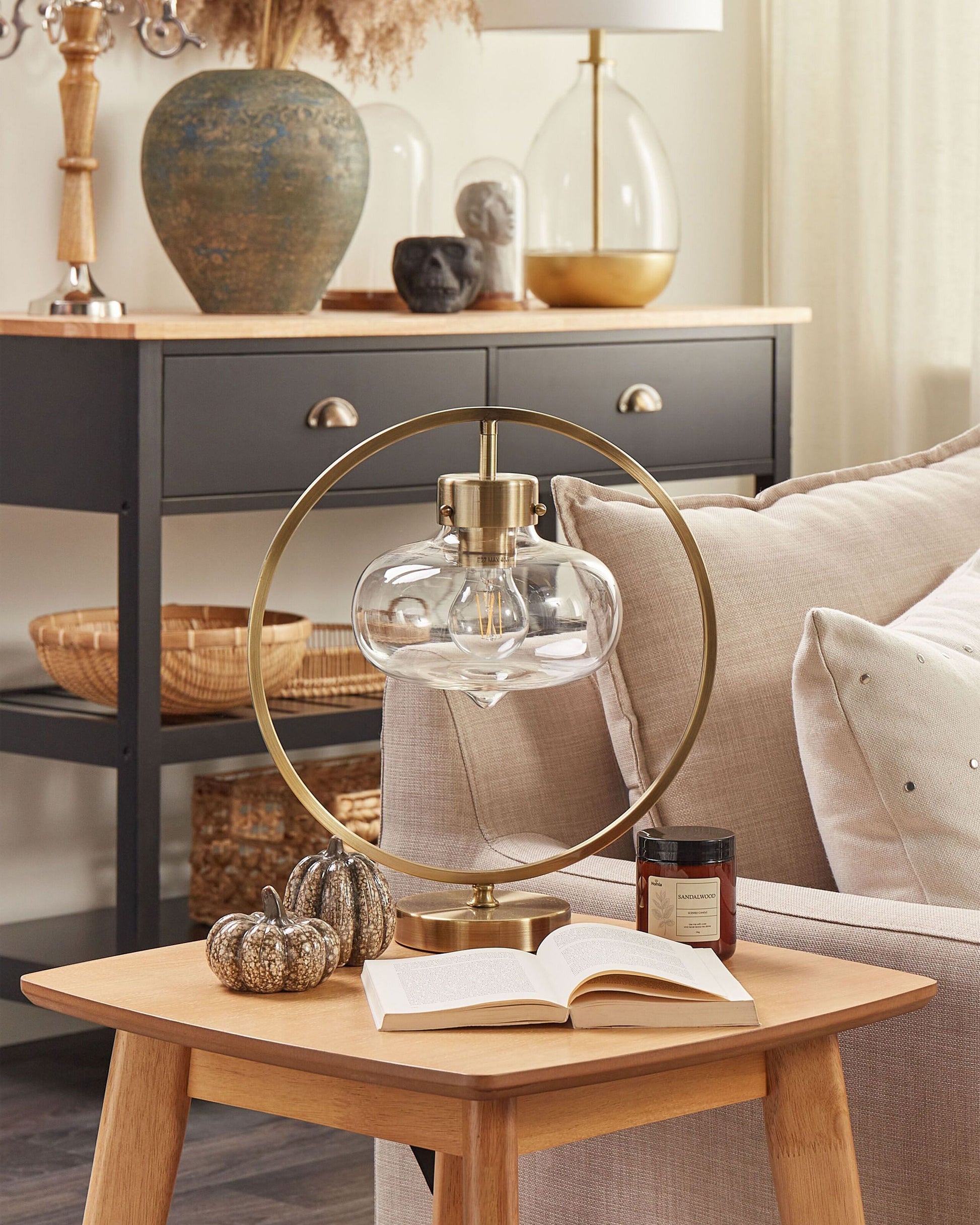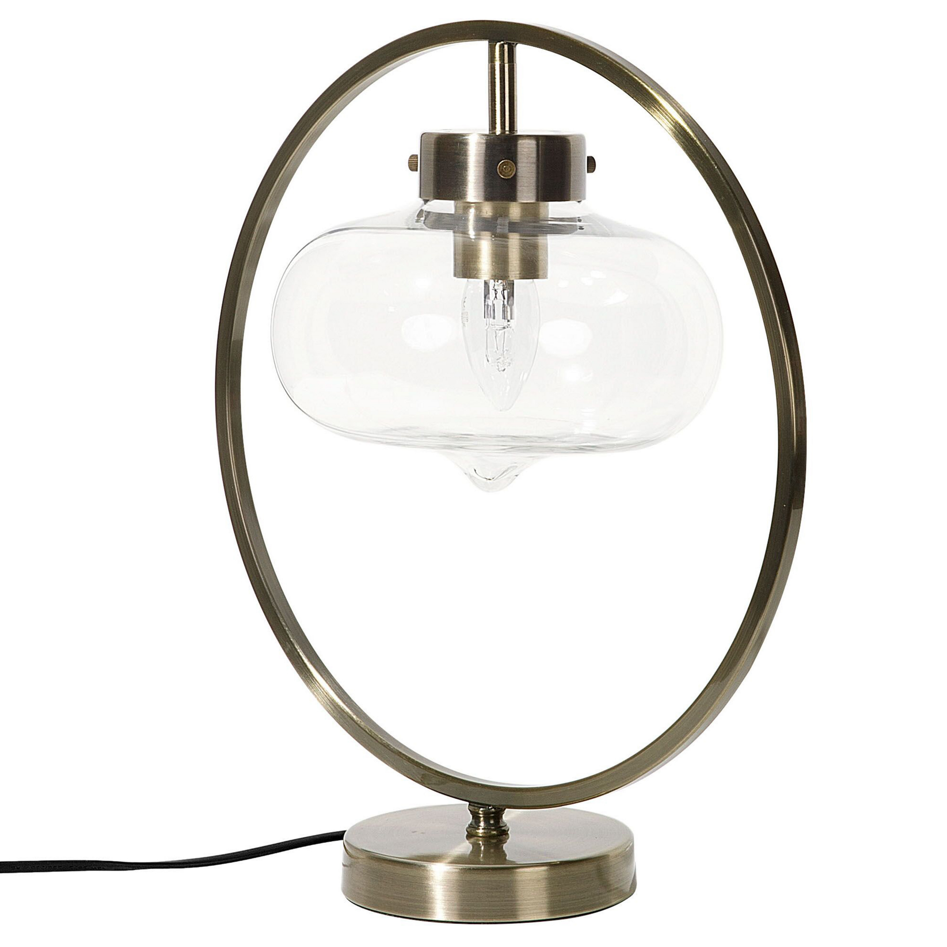 Beschreibung: Das zeitlose und exklusive Design der stilvollen Tischlampe unterstreicht ihre elegante Ausstrahlung. Der geschwungene Lampenschirm aus klarem Glas hängt in einem rund gebogenen, filigranen Rahmen aus Metall in Goldoptik. Bitte beachten Sie die Masse des Lampenschirms bei der Auswahl eines passenden Leuchtmittels. Dank langem Kabel in Schwarz kann die Leuchte auch auf hohen Möbeln positioniert werden. Material: Eisen. Zusätzliches Material: Glas. Gewicht: 1.5 Montage: Teilweise montiert Das Angebot beinhaltet: 1 x Tischleuchte, Nicht im Lieferumfang enthalten: Leuchtmittel Höhe: 40 zusätzliche Information: Diese Leuchte ist geeignet für Leuchtmittel der Energieklassen A bis G auf einer Skala von A (sehr effizient) bis G (weniger effizient). Geeignet für: LED Leuchtmittel, Eco-Halogen Leuchtmittel, Energiesparleuchtmittel., Die Stromkabel dürfen nur von einem qualifizierten Elektriker angepasst werden. Breite: 35 Tiefe: 35 Art: Tischleuchte Stil: Industriell Allgemeine Farbe: Gold Hauptmaterial: Eisen Fassung: Max. 40 W IP Protection Code: IP 20