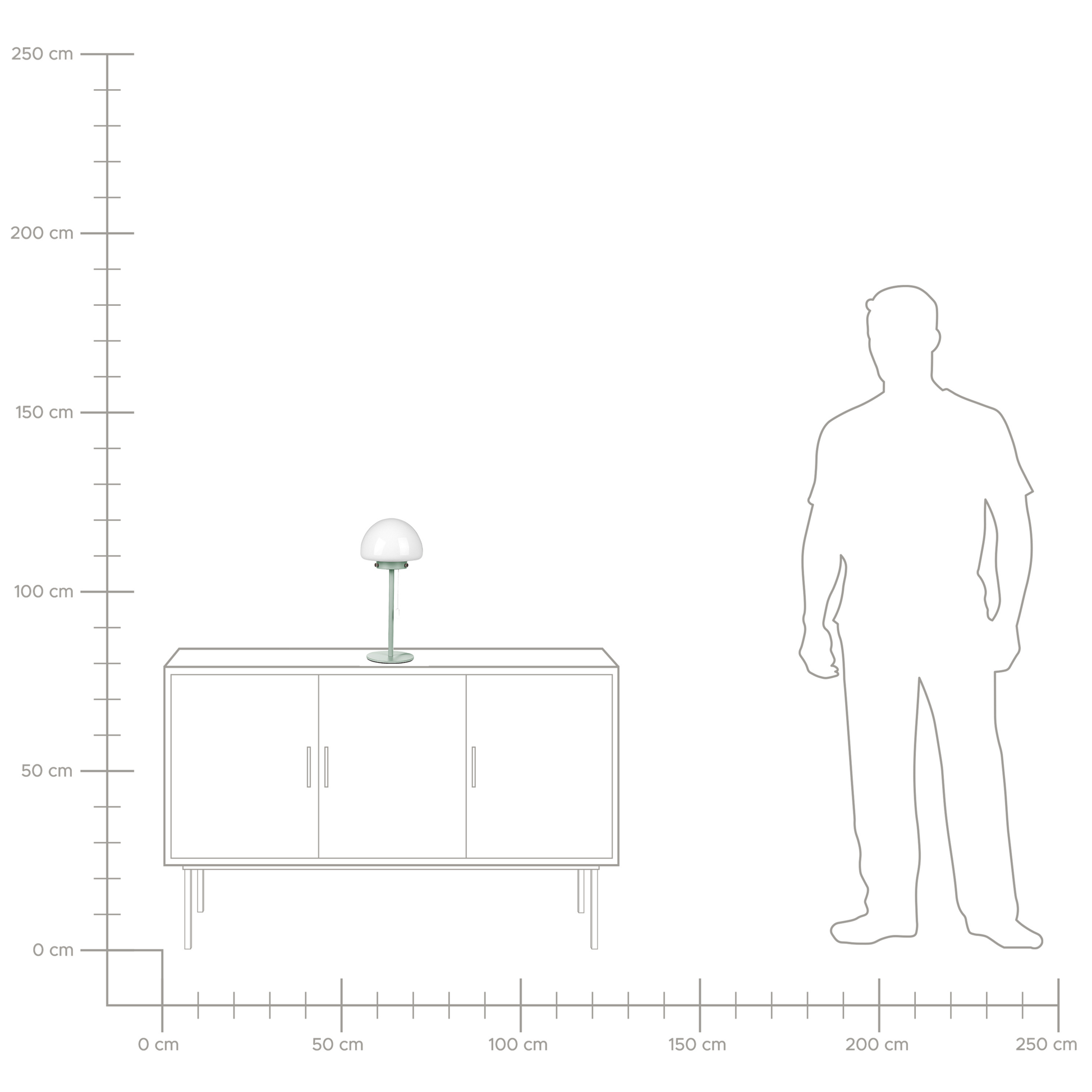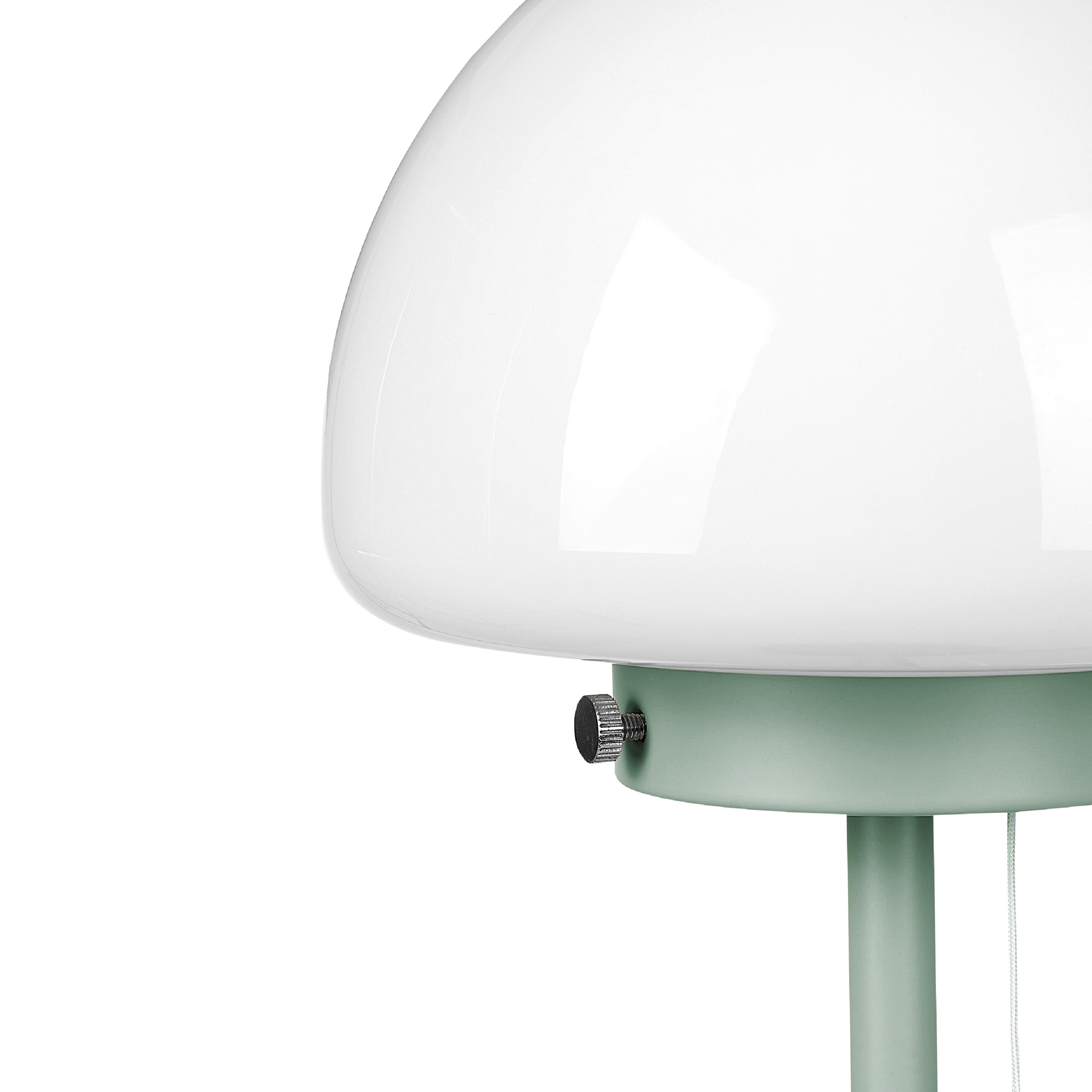 Verleihen Sie Ihrer Einrichtung mit dieser wunderschönen Tischleuchte einen ganz besonderen Touch. Das Stück verfügt über einen halbkugelförmigen Glasschirm in weisser Farbe, der in Kombination mit einem hellgrünen Sockel definitiv einen Blickfang darstellt und in jedes Schlafzimmer und Wohnzimmer passt, von Retro bis zu modern. Die Leuchte lässt sich dank des Zugschalters leicht ein- und ausschalten.   Material: Glas. Zusätzliches Material: Eisen.  Gewicht: 1 Montage: Teilweise montiert Das Angebot beinhaltet: 1 x Tischleuchte, Nicht im Lieferumfang enthalten: Leuchtmittel Höhe: 39 zusätzliche Information: Diese Leuchte ist geeignet für Leuchtmittel der Energieklassen A bis G auf einer Skala von A (sehr effizient) bis G (weniger effizient). Geeignet für: LED Leuchtmittel, Eco-Halogen Leuchtmittel, Energiesparleuchtmittel., Die Stromkabel dürfen nur von einem qualifizierten Elektriker angepasst werden. Breite: 17 Tiefe: 17 Art: Tischleuchte Stil: Skandinavisch Allgemeine Farbe: Grün Hauptmaterial: Glas Fassung: 25 W IP Protection Code: IP 20