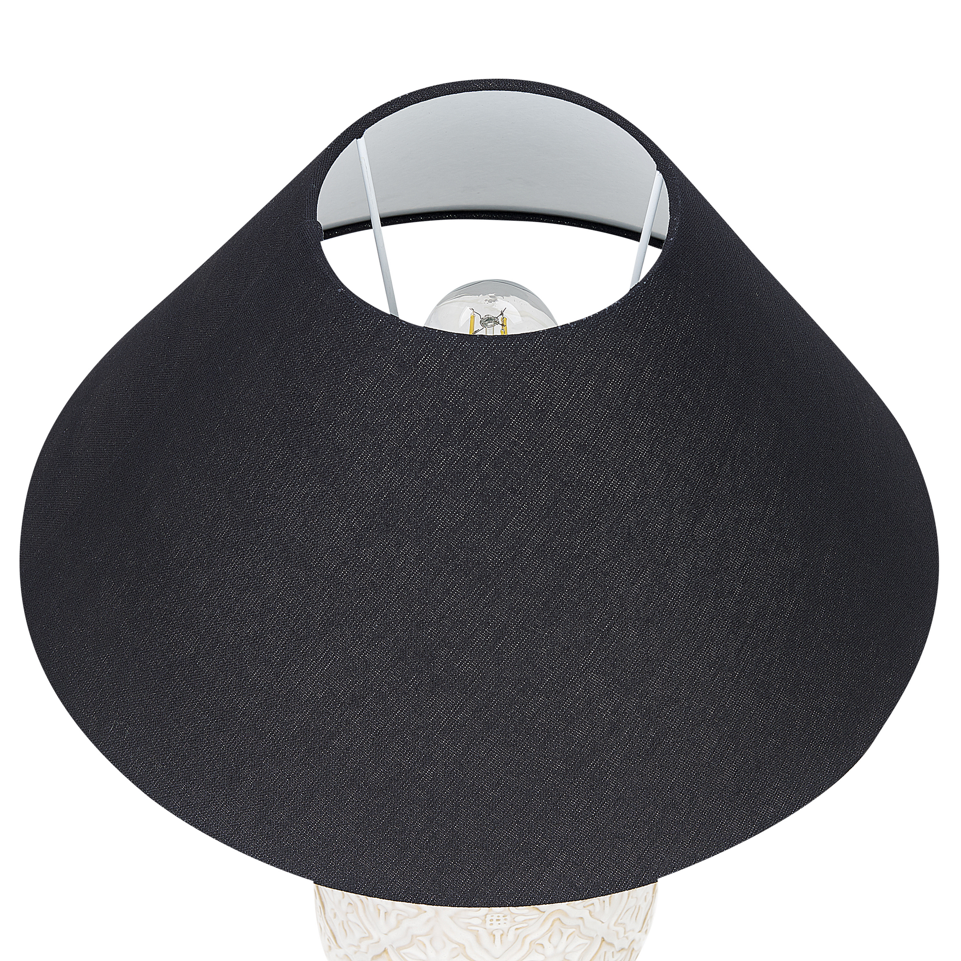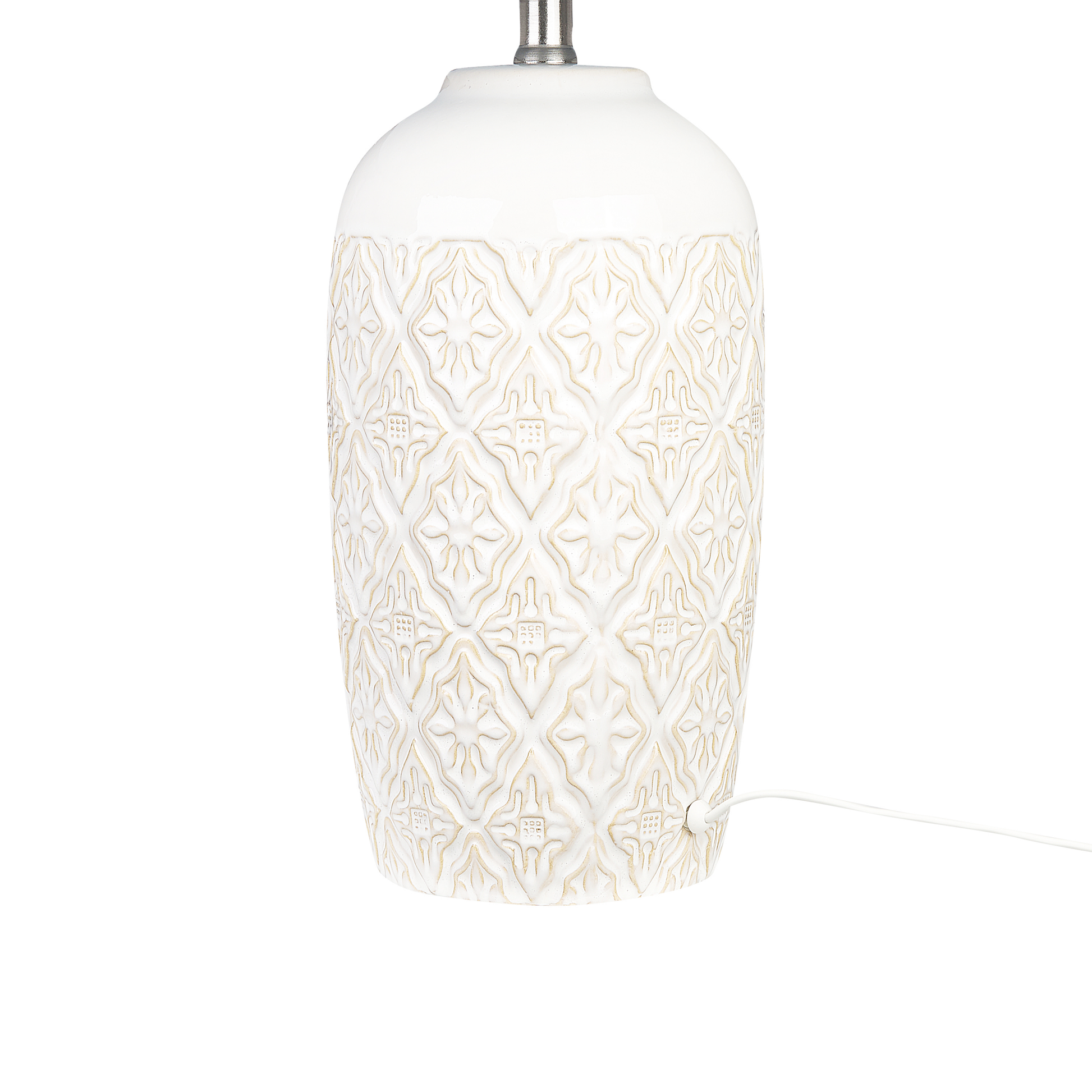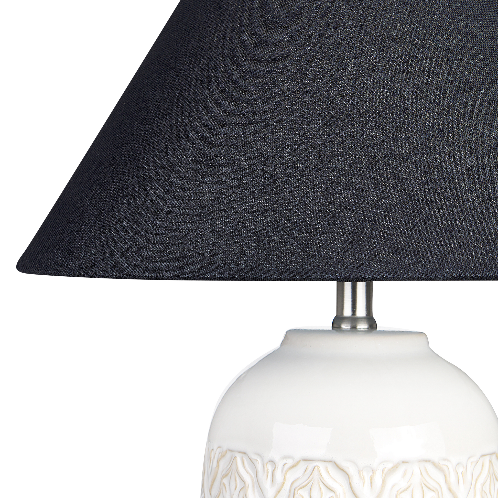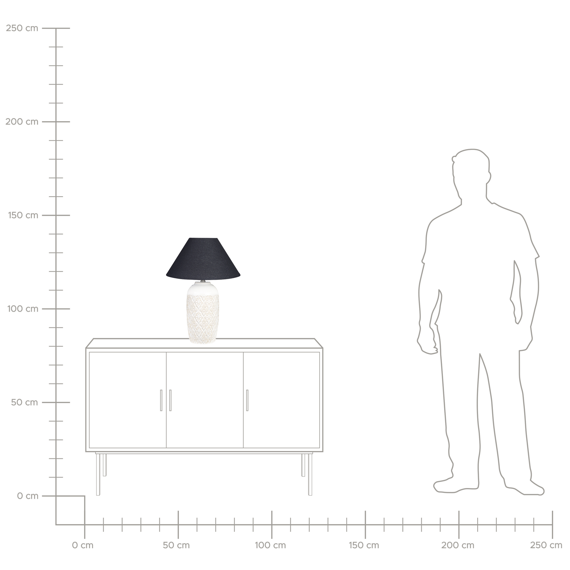 Mit dieser funktionalen, aber auch sehr dekorativen Lampe können Sie die Einrichtung Ihres Wohnzimmers oder Schlafzimmers abrunden. Die Keramikbasis ist sehr stabil, und die auf der Oberfläche sichtbaren Muster verleihen dem Stück einen einzigartigen Stil. Der Lampenschirm ist aus Leinen gefertigt und sorgt für ein angenehmes Licht, das die abendliche Lektüre noch angenehmer macht. Material: Keramik. Zusätzliches Material: Leinen. Material Zusammensetzung: 100% Leinen Gewicht: 2.8 Montage: Teilweise montiert Das Angebot beinhaltet: 1 x Tischleuchte, Nicht im Lieferumfang enthalten: Leuchtmittel Höhe: 56 zusätzliche Information: Diese Leuchte ist geeignet für Leuchtmittel der Energieklassen A bis G auf einer Skala von A (sehr effizient) bis G (weniger effizient). Geeignet für: LED Leuchtmittel, Eco-Halogen Leuchtmittel, Energiesparleuchtmittel., Die Stromkabel dürfen nur von einem qualifizierten Elektriker angepasst werden. Breite: 40 Tiefe: 40 Art: Tischleuchte Stil: Klassisch Allgemeine Farbe: Beige Schatten: Creme Hauptmaterial: Keramik Fassung: Max. 60 W IP Protection Code: IP 20