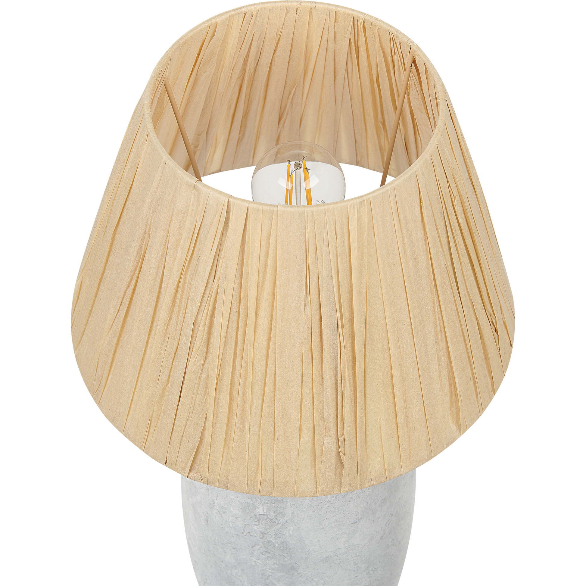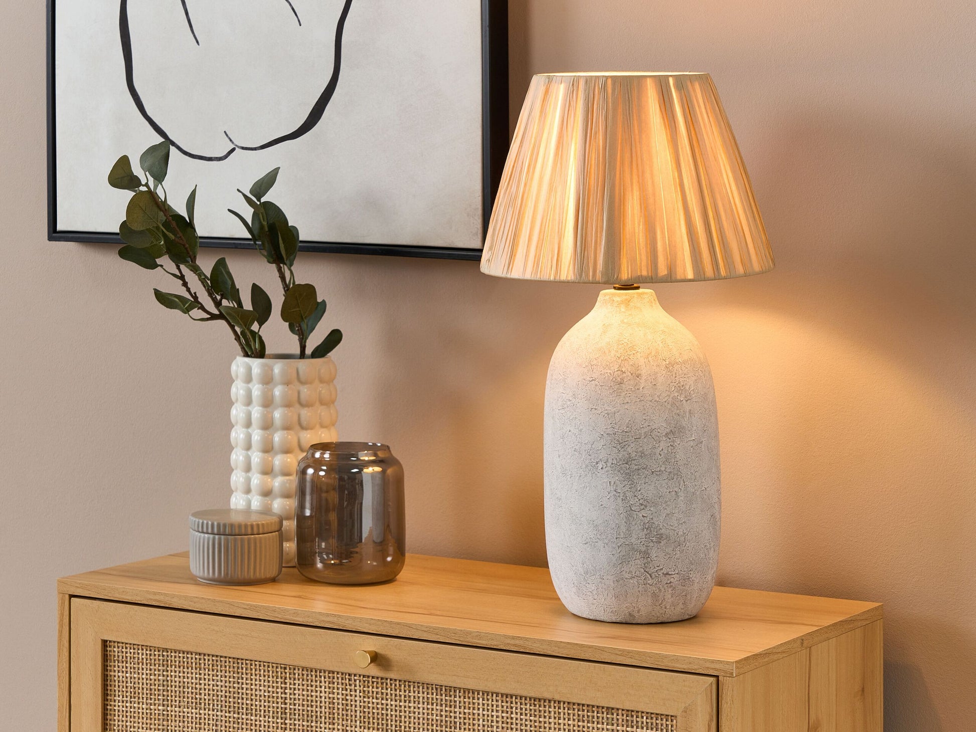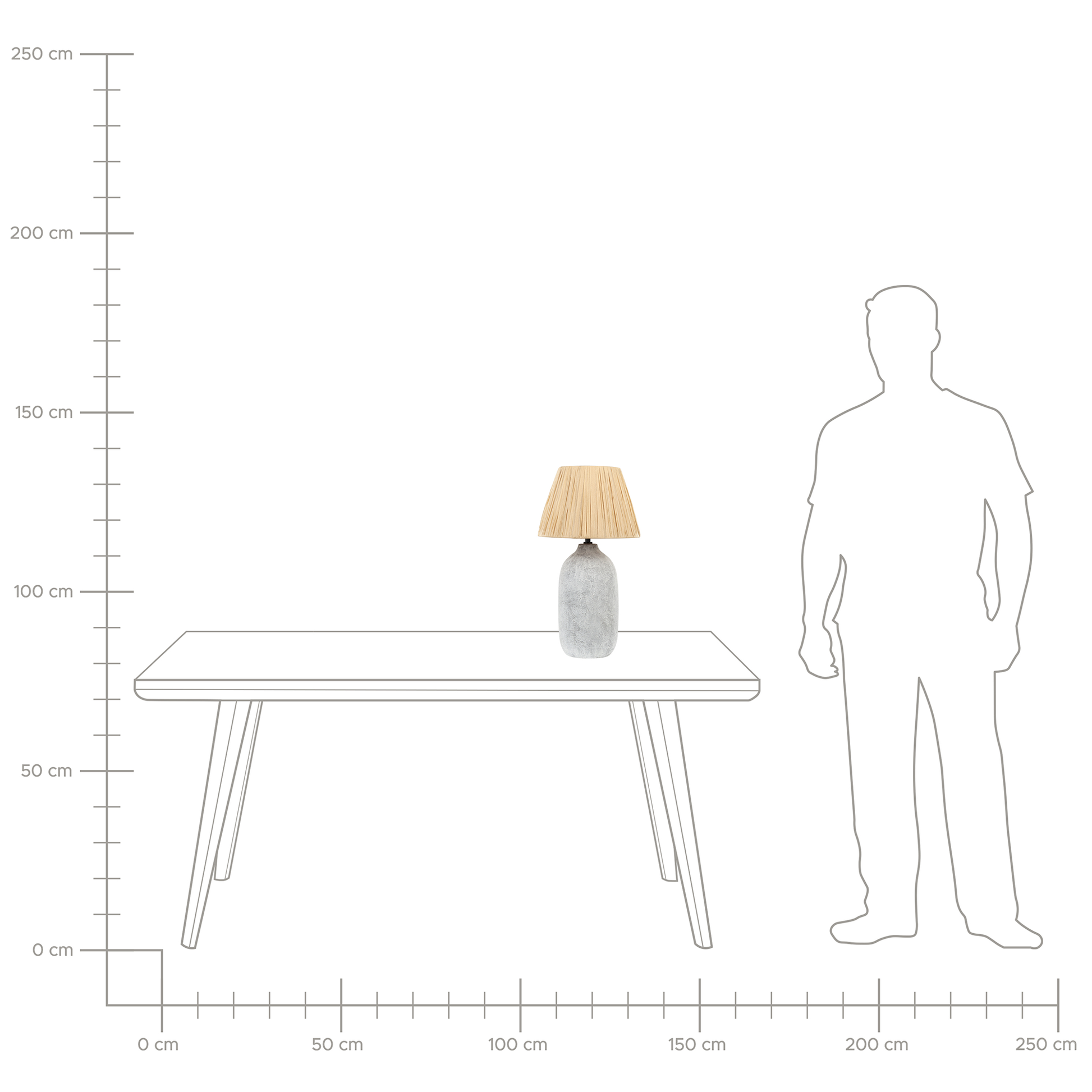 Beschreibung: Werten Sie Ihren Wohnraum mit dieser Leuchte auf, die urbanen Charme mit einem Boho-Look verbindet. Der stabile Lampenfuss bezaubert mit seiner Vasenform und besteht aus hochwertiger Keramik, die mit einer raffinierten Betonoptik vervollkommnet wird. Um die natürliche Schönheit der Nachttischleuchte zu unterstreichen, ist der kegelförmige Schirm mit Papier und das lange Kabel mit Nutzhanf in einem Naturfarbton umflochten. Dabei verbreitet der Lampenschirm einen sanften Lichtschein, der in allen Schlaf-, Wohn- und Esszimmern für einen zauberhaften Akzent sorgt. Material: Keramik. Zusätzliches Material: Papier, Eisen. Gewicht: 2 Montage: Benötigt keine Montage Das Angebot beinhaltet: 1 x Tischleuchte, Nicht im Lieferumfang enthalten: Leuchtmittel Höhe: 56 zusätzliche Information: Diese Leuchte ist geeignet für Leuchtmittel der Energieklassen A bis G auf einer Skala von A (sehr effizient) bis G (weniger effizient). Geeignet für: LED Leuchtmittel, Eco-Halogen Leuchtmittel, Energiesparleuchtmittel., Die Stromkabel dürfen nur von einem qualifizierten Elektriker angepasst werden., Hinweis! Beschädigungsgefahr! Bitte verwenden Sie keine Messer oder andere spitze oder scharfe Gegenstände, um die Verpackung zu öffnen, da das Produkt sonst beschädigt werden könnte. Breite: 30 Tiefe: 30 Art: Tischleuchte Stil: Boho Allgemeine Farbe: Grau Hauptmaterial: Keramik Fassung: 40 W IP Protection Code: IP 20