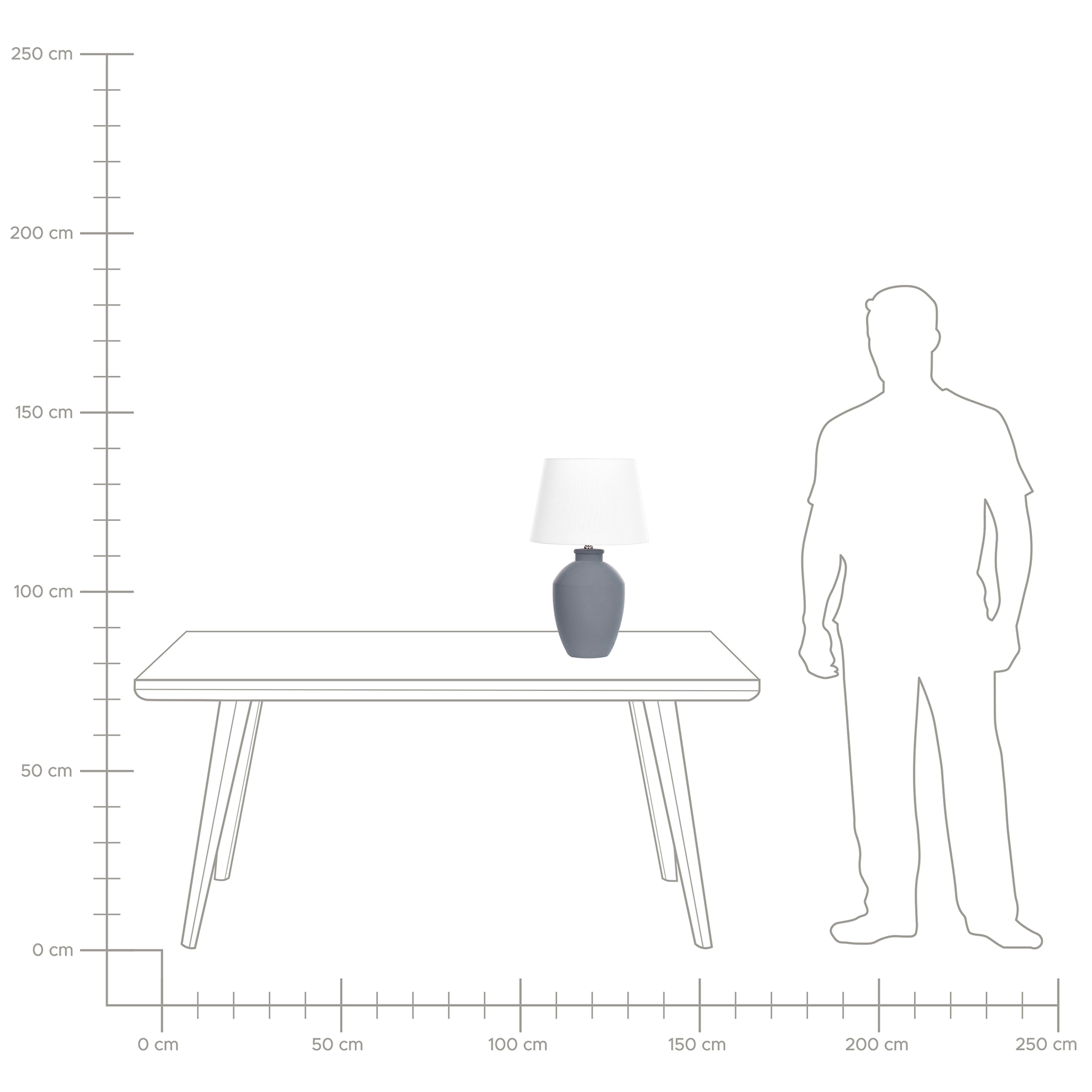 Werten Sie Ihre Einrichtung mit dieser praktischen Nachtlampe mit formschönem Sockel in einem ruhigen Grauton auf. Ihr schlichtes, aber elegantes Design bringt den zauberhaften Reiz von Erdtönen und die Schönheit von Mutter Natur in Ihre Wohnbereiche. Der Lampenfuss besteht aus langlebiger, pflegeleichter Keramik, ist in einer eleganten Vasenform gehalten und wird mit einem Schirm in einer edlen Empireform kombiniert. Der Stoffschirm aus hochwertigen Leinen passt wunderbar zum Keramikfuss und gibt ein warmes und einladendes Licht ab – die perfekte Ergänzung, um ein gemütliches Ambiente in jedem Wohnzimmer zu schaffen. Dank langem, schwarzem Kabel mit Schalter kann das Modell fast überall angeschlossen werden.   Material: Keramik. Zusätzliches Material: Leinen.  Material Zusammensetzung: 100% Leinen Gewicht: 2 Montage: Teilweise montiert Das Angebot beinhaltet: 1 x Tischleuchte, Nicht im Lieferumfang enthalten: Leuchtmittel Höhe: 55 zusätzliche Information: Diese Leuchte ist geeignet für Leuchtmittel der Energieklassen A bis G auf einer Skala von A (sehr effizient) bis G (weniger effizient). Geeignet für: LED Leuchtmittel, Eco-Halogen Leuchtmittel, Energiesparleuchtmittel., Die Stromkabel dürfen nur von einem qualifizierten Elektriker angepasst werden., Bitte beachten Sie, dass der Farbton leicht von dem im Bild dargestellten abweichen kann. Diese Abweichungen stellen keine zur Reklamation berechtigten Fehler dar. Breite: 33 Tiefe: 33 Art: Tischleuchte Stil: Skandinavisch Allgemeine Farbe: Grau Hauptmaterial: Keramik Fassung: Max. 60 W IP Protection Code: IP 20