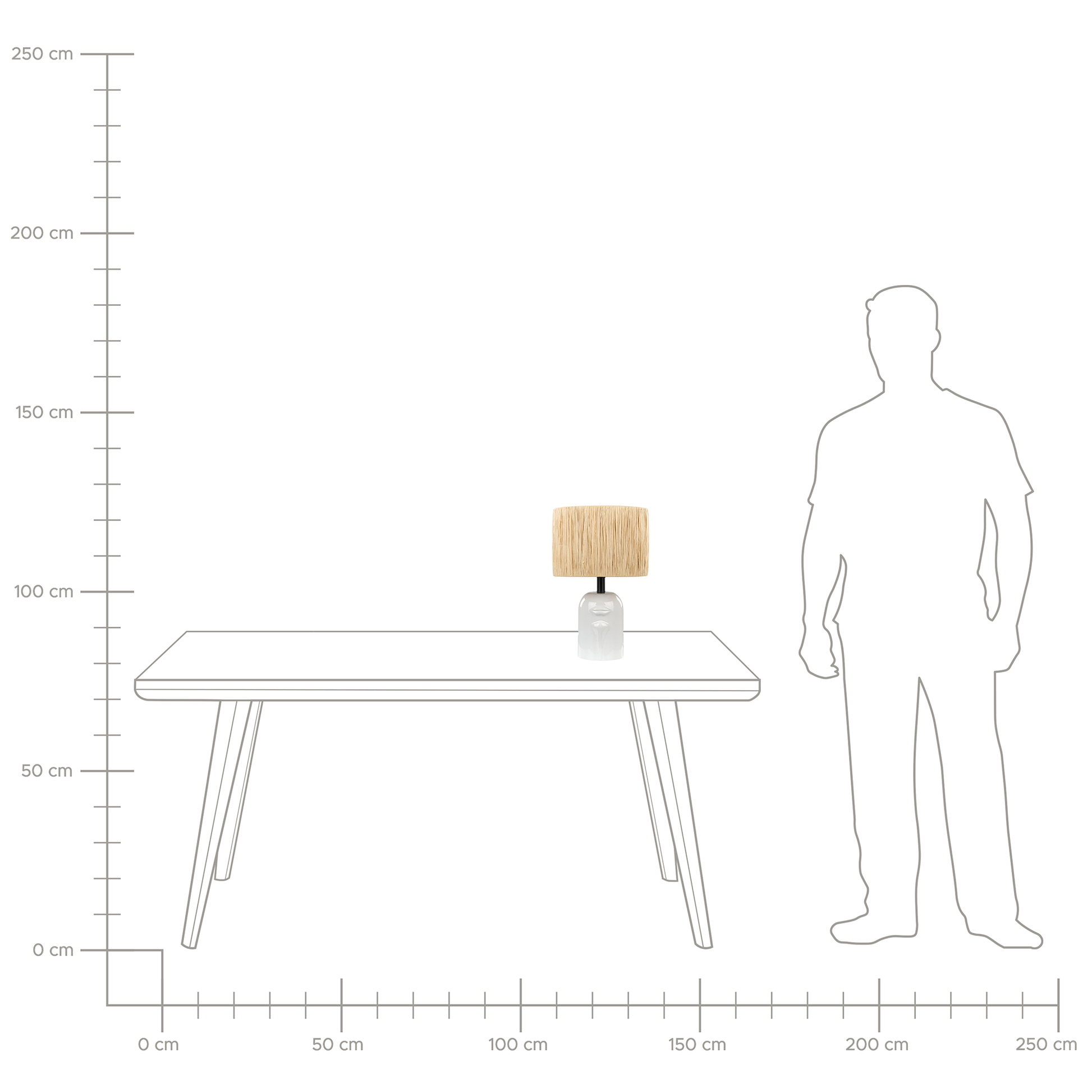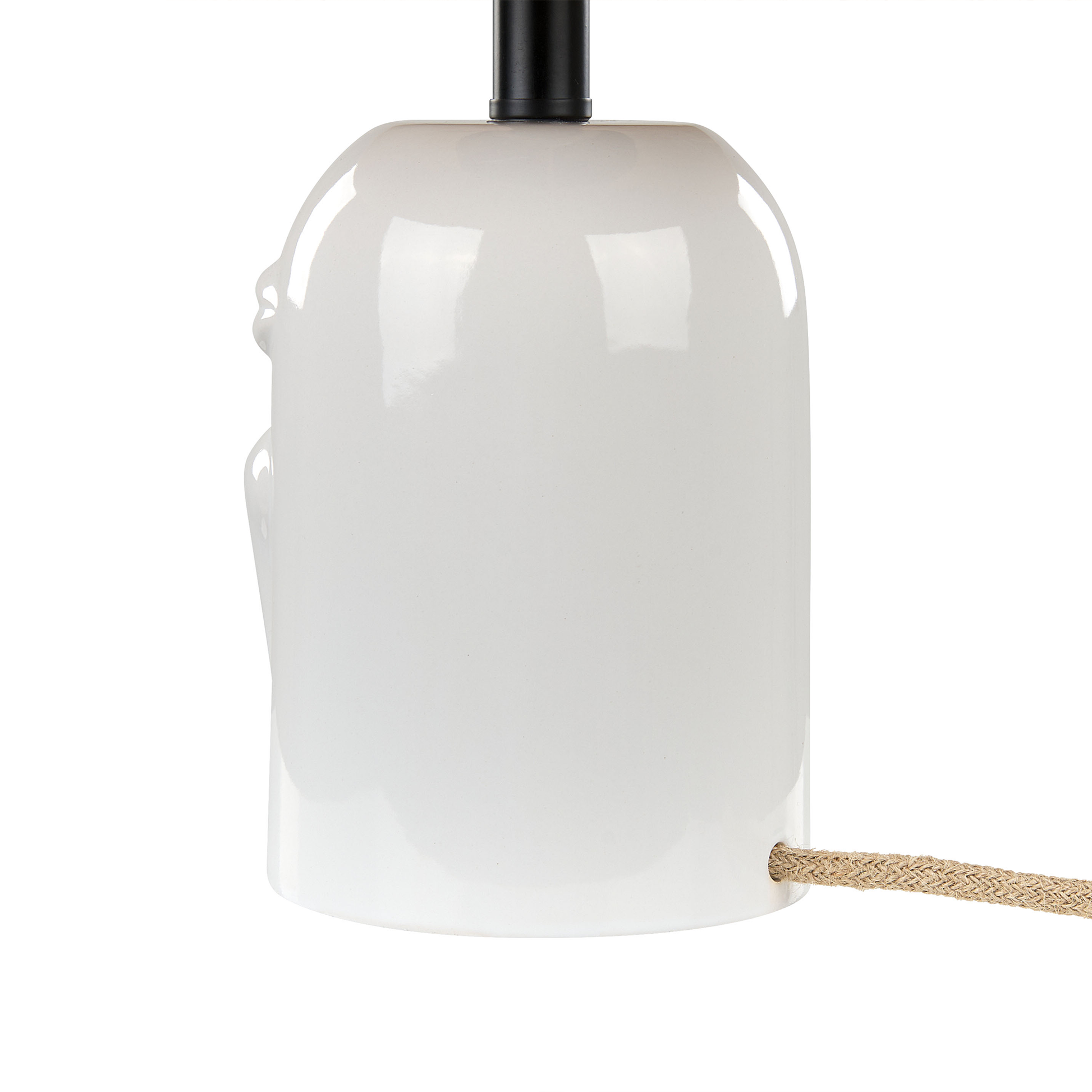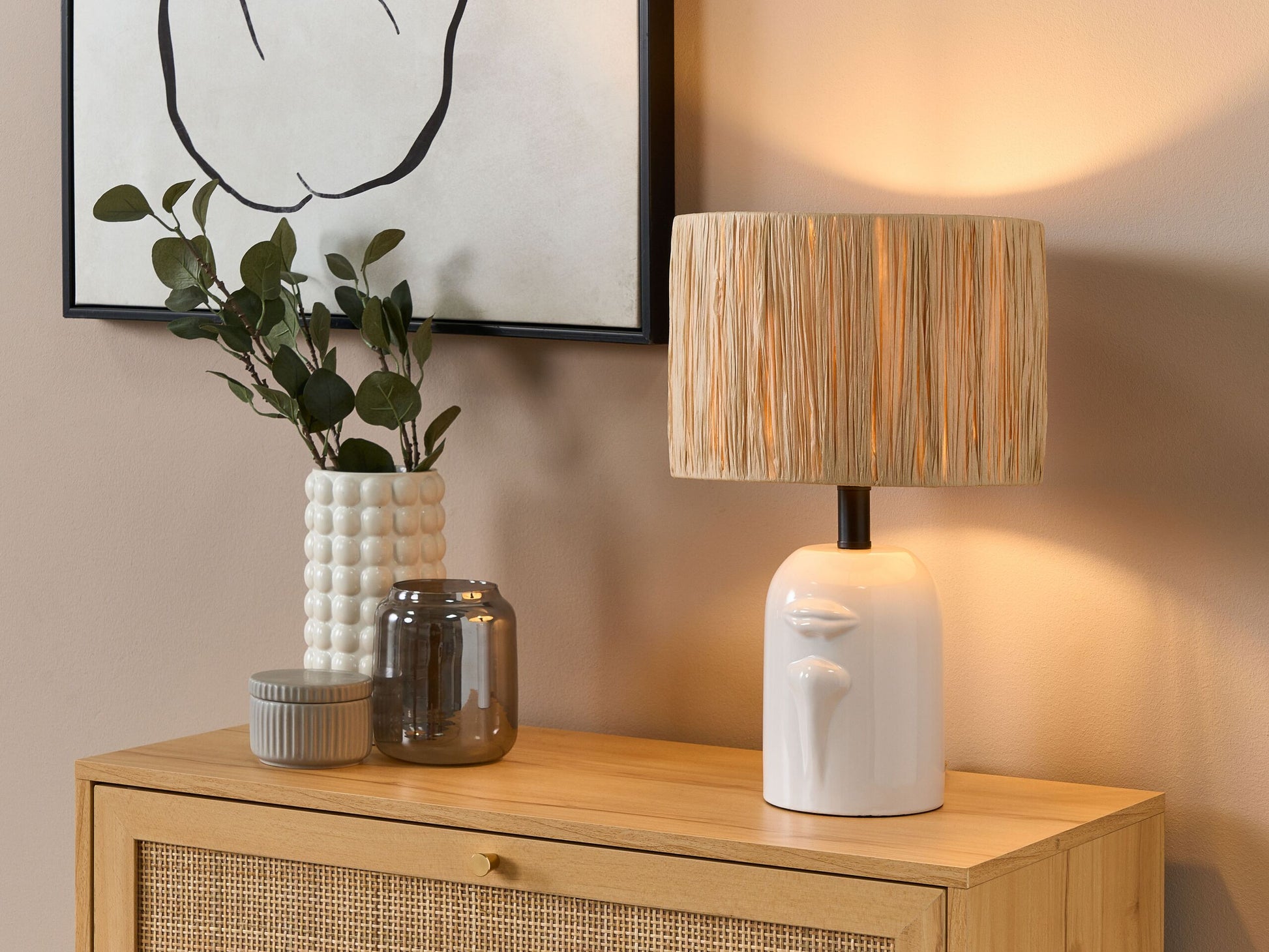 Diese formschöne Tischleuchte bringt einen gemütlichen Look in jedes Wohn-, Ess- oder Schlafzimmer. Ihr Standfuss besteht aus pflegeleichter Keramik und ist mit einem auf dem Kopf gestellten Gesichtsmotiv versehen, das den modernen Charakter der Leuchte in den Vordergrund stellt. Der trommelförmige Schirm ist mit Papier umflochten und in einem beruhigenden Naturton gehalten, der es Ihnen erlaubt einen angenehmen Lichtstrahl im Raum zu verbreiten. Um den organischen Look der Nachttischlampe zu vervollkommnen, ist das lange Kabel mit Nutzhanf umflochten. Dank des zusätzlichen Schalters am Kabel gestaltet sich das Ein- und Ausschalten des Modells sehr leicht.  Material: Keramik. Zusätzliches Material: Papier, Nutzhanf.  Gewicht: 2 Montage: Teilweise montiert Das Angebot beinhaltet: 1 x Tischleuchte, Nicht im Lieferumfang enthalten: Leuchtmittel Höhe: 46 zusätzliche Information: Die Stromkabel dürfen nur von einem qualifizierten Elektriker angepasst werden., Diese Leuchte ist geeignet für Leuchtmittel der Energieklassen A bis G auf einer Skala von A (sehr effizient) bis G (weniger effizient). Geeignet für: LED Leuchtmittel, Eco-Halogen Leuchtmittel, Energiesparleuchtmittel., Hinweis! Beschädigungsgefahr! Bitte verwenden Sie keine Messer oder andere spitze oder scharfe Gegenstände, um die Verpackung zu öffnen, da das Produkt sonst beschädigt werden könnte. Breite: 29 Tiefe: 29 Art: Tischleuchte Stil: Boho Allgemeine Farbe: Naturfarben Schatten: Cremeweiss Hauptmaterial: Keramik Fassung: 40 W IP Protection Code: IP 20
