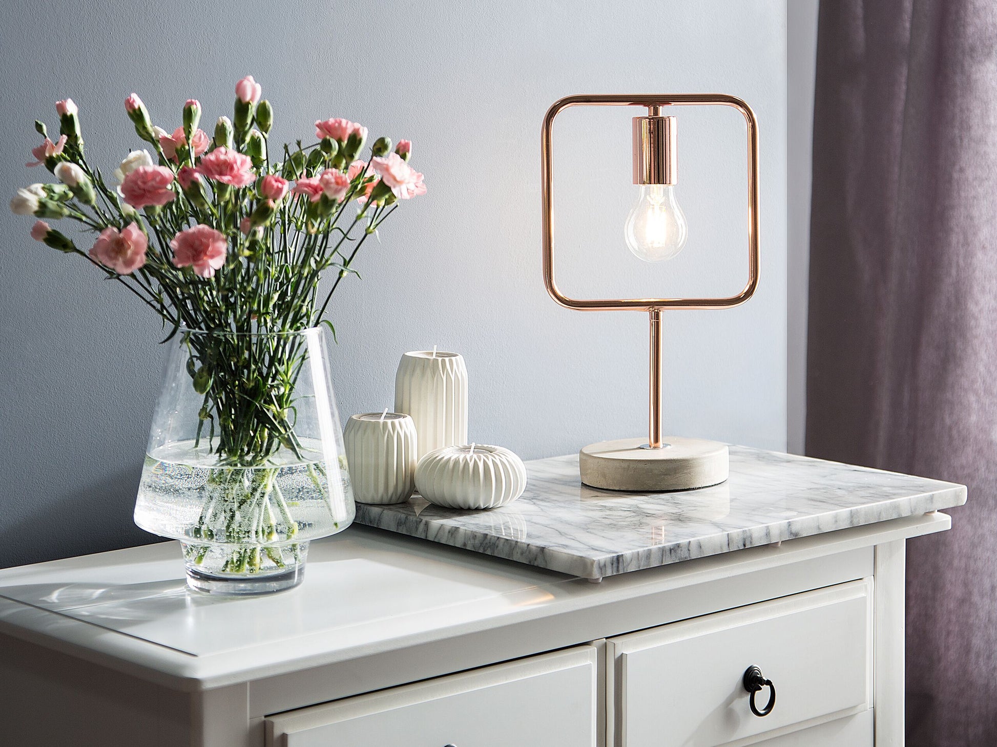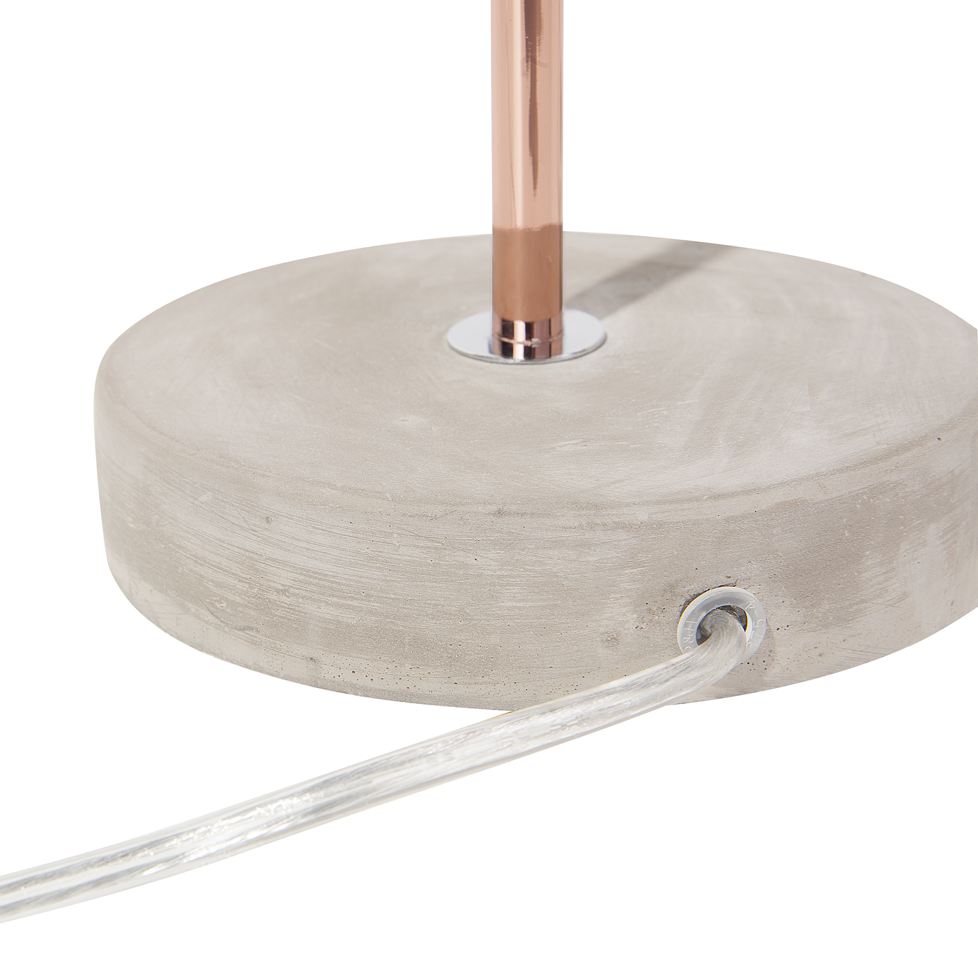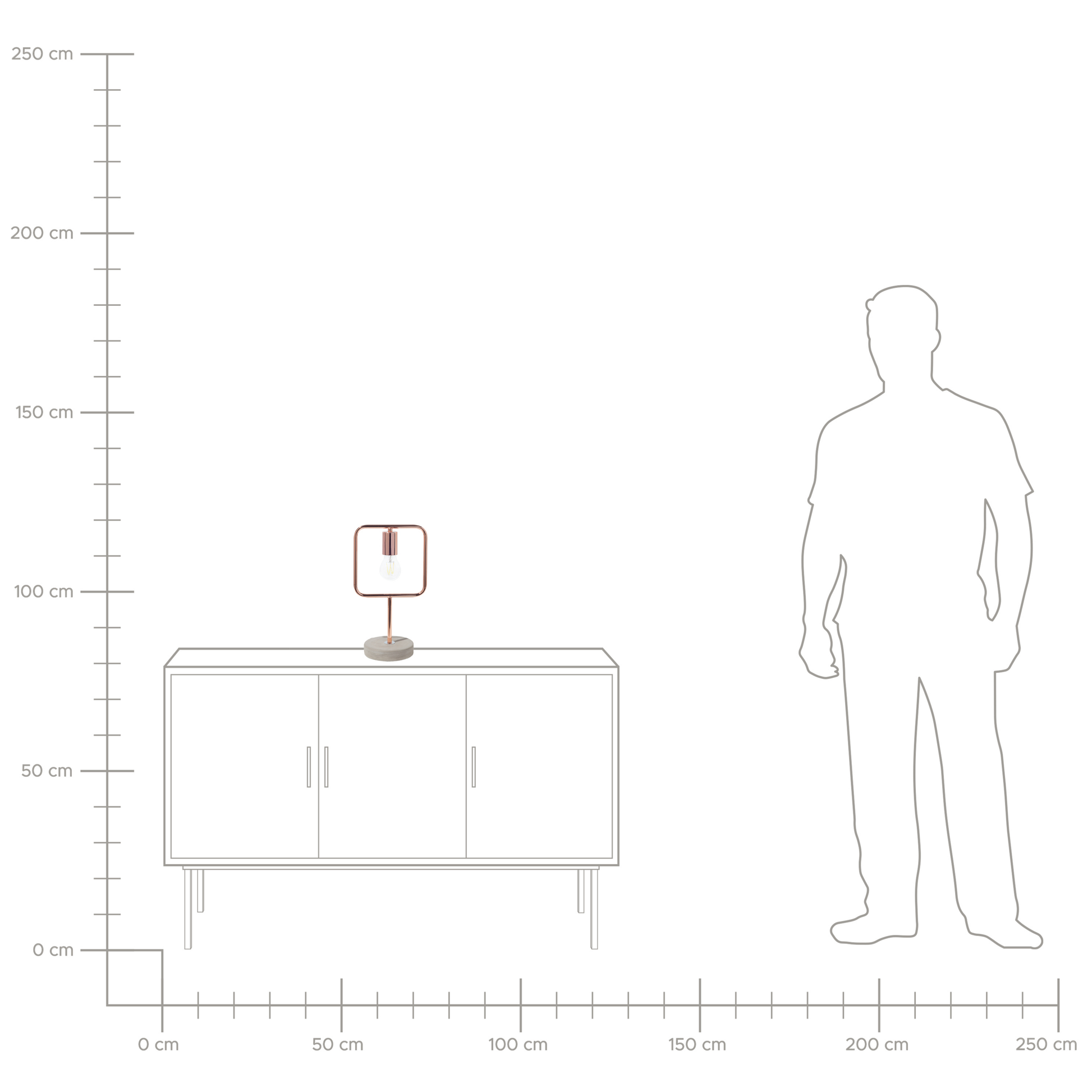 Ein raffiniertes Design macht diese moderne Tischlampe zu einem wahren Designobjekt. Wie ein kleines Schild steht die Leuchte auf einem stabilen, runden Fuss aus hellgrauem Beton. Das Leuchtmittel hängt in einem viereckigen Rahmen aus glänzendem, anlaufbeständigem Kupfer. Das minimalistische Design harmoniert perfekt mit dem kontrastierenden Materialmix. Eine vielseitige, funktionale und dekorative Lichtquelle mit industriellem Charme und moderner Ausstrahlung.   Material: Eisen. Zusätzliches Material: Kunststoff, Beton.  Gewicht: 1 Montage: Teilweise montiert Das Angebot beinhaltet: 1 x Tischleuchte, Nicht im Lieferumfang enthalten: Leuchtmittel Höhe: 37 zusätzliche Information: Diese Leuchte ist geeignet für Leuchtmittel der Energieklassen A bis G auf einer Skala von A (sehr effizient) bis G (weniger effizient). Geeignet für: LED Leuchtmittel, Eco-Halogen Leuchtmittel, Energiesparleuchtmittel., Die Stromkabel dürfen nur von einem qualifizierten Elektriker angepasst werden. Breite: 21 Tiefe: 21 Art: Tischleuchte Stil: Industriell Allgemeine Farbe: Kupfer Schatten: Hellgrau Hauptmaterial: Eisen Fassung: Max. 40 W IP Protection Code: IP 20