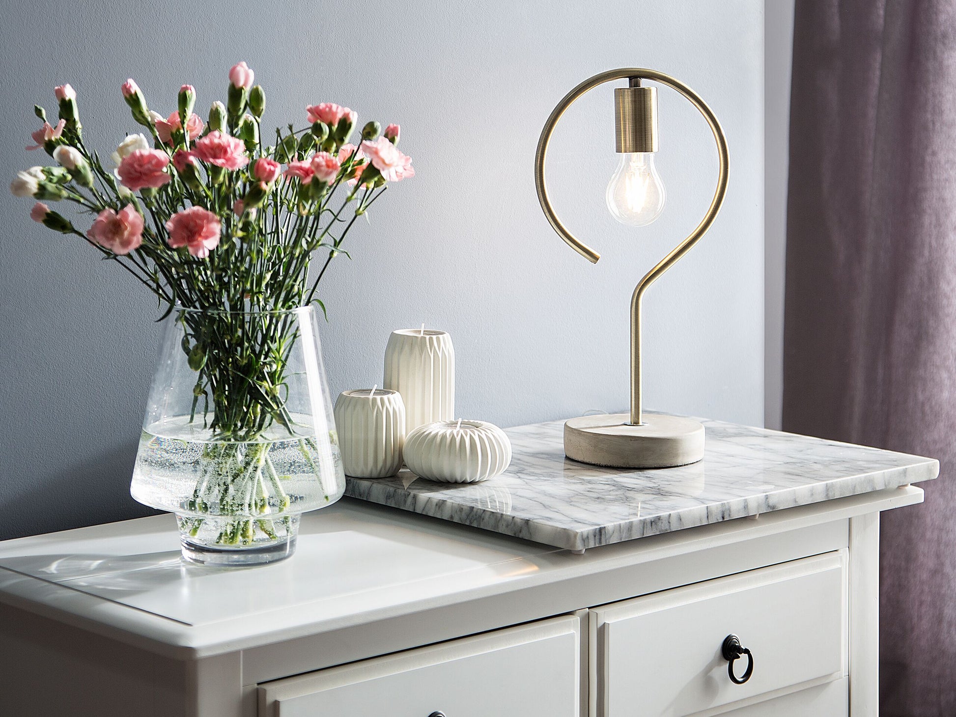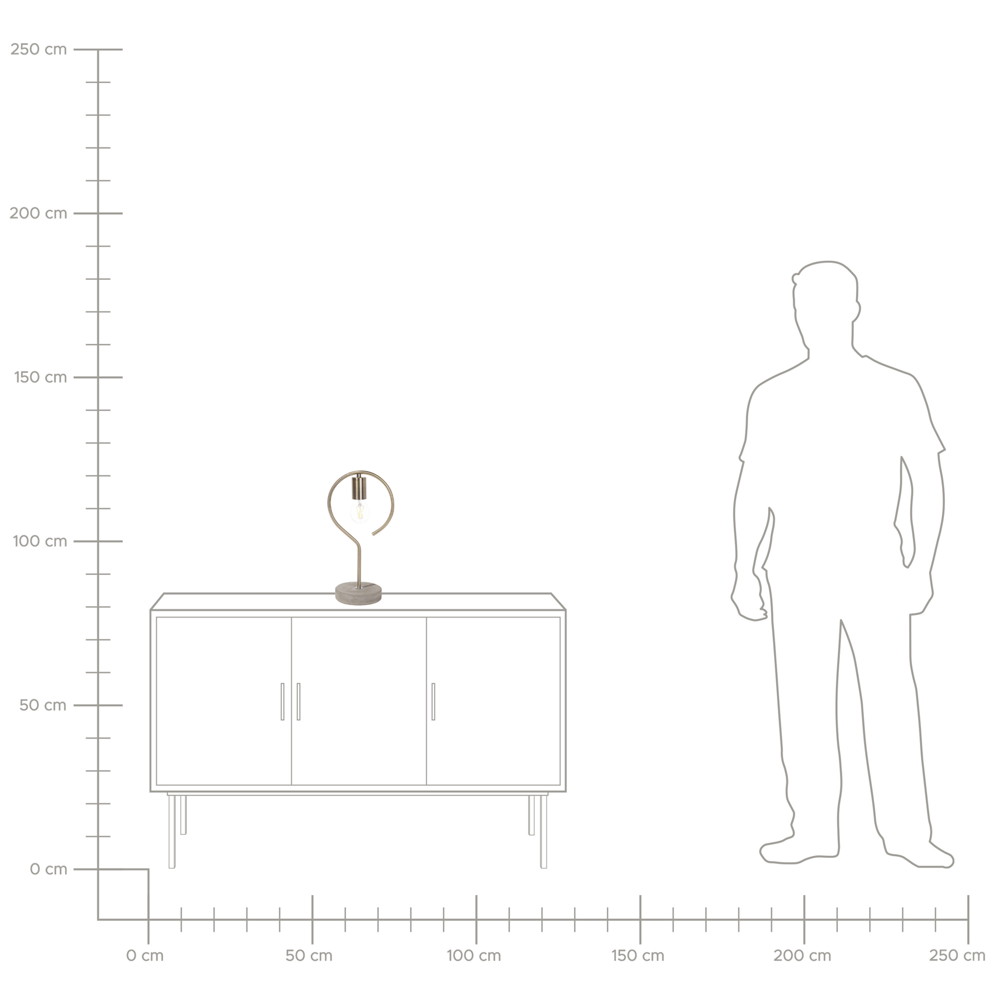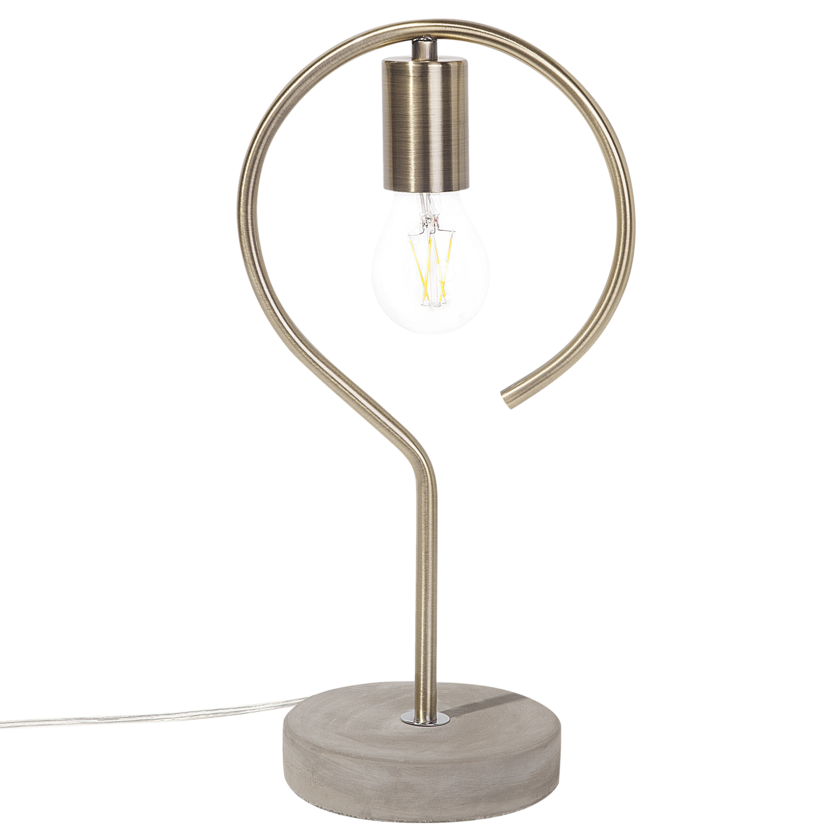 Der gebogene Rahmen dieser modernen Tischlampe beschreibt einen fast geschlossenen Kreis, welcher mit einem begradigten Stück auf einem stabilen, runden Fuss steht. Das Leuchtmittel hängt oben in der Rundung und beweist, dass minimalistisches Design eine extravagante Ausstrahlung haben kann. Der gelungene Farb- und Materialmix aus glänzendem, anlaufbeständigem Messing und hellgrauem Beton macht diese vielseitige und dekorative Lampe zum Lieblingsstück in jedem modernen, industriellen oder individuellen Einrichtungsstil.   Material: Eisen. Zusätzliches Material: Kunststoff, Beton.  Gewicht: 1 Montage: Teilweise montiert Das Angebot beinhaltet: 1 x Tischleuchte, Nicht im Lieferumfang enthalten: Leuchtmittel Höhe: 40 zusätzliche Information: Diese Leuchte ist geeignet für Leuchtmittel der Energieklassen A bis G auf einer Skala von A (sehr effizient) bis G (weniger effizient). Geeignet für: LED Leuchtmittel, Eco-Halogen Leuchtmittel, Energiesparleuchtmittel., Die Stromkabel dürfen nur von einem qualifizierten Elektriker angepasst werden. Breite: 20 Tiefe: 14 Art: Tischleuchte Stil: Glamourös Allgemeine Farbe: Messing Hauptmaterial: Eisen Fassung: Max. 40 W IP Protection Code: IP 20