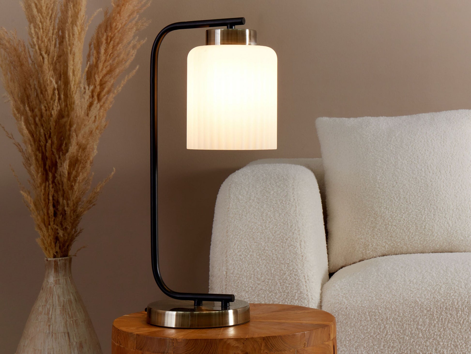 Diese Tischlampe ist eine moderne Variante des gemütlichen Industrial Styles und ein echter Eyecatcher. Gefertigt aus pulverbeschichtetem Stahl in matter Ausführung, bietet sie Langlebigkeit über Jahre hinweg und passt gut zu dem glänzenden Sockel in Messingfarbe. Der weisse Glasschirm sorgt für ein angenehmes Licht und schönes Ambiente in jedem Raum, egal ob im Wohnzimmer, Schlafzimmer oder Esszimmer.  Material: Stahl. Zusätzliches Material: Glas.  Gewicht: 1.6 Montage: Benötigt keine Montage Das Angebot beinhaltet: 1 x Tischleuchte, Nicht im Lieferumfang enthalten: Leuchtmittel Höhe: 47 zusätzliche Information: Diese Leuchte ist geeignet für Leuchtmittel der Energieklassen A bis G auf einer Skala von A (sehr effizient) bis G (weniger effizient). Geeignet für: LED Leuchtmittel, Eco-Halogen Leuchtmittel, Energiesparleuchtmittel., Die Stromkabel dürfen nur von einem qualifizierten Elektriker angepasst werden. Breite: 18 Tiefe: 18 Art: Tischleuchte Stil: Modern Allgemeine Farbe: Schwarz Hauptmaterial: Stahl Fassung: Max. 40 W IP Protection Code: IP 20