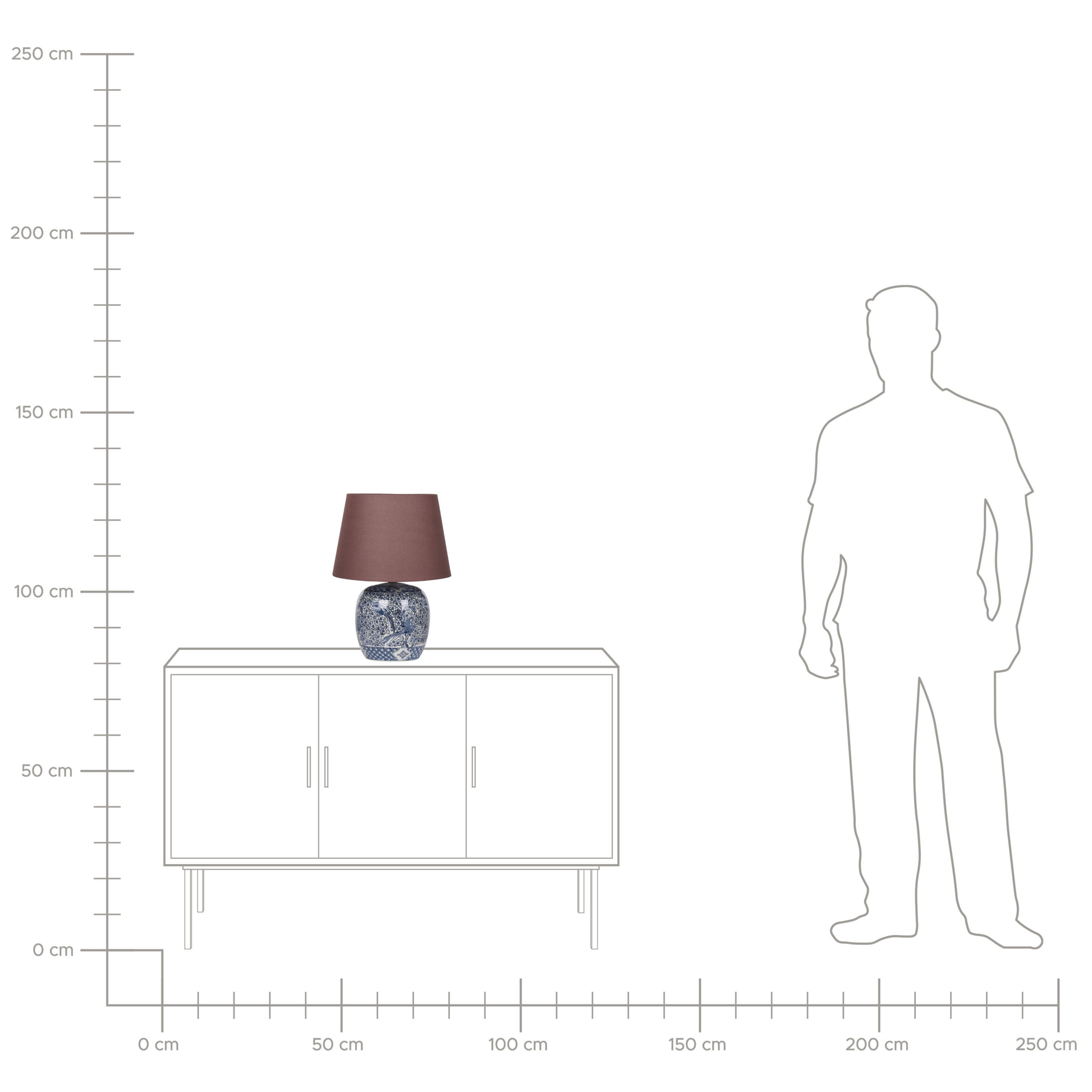 Diese Tischlampe macht sich mit ihrem sanften Lichtschein perfekt als Tages- oder Abendbeleuchtung in jedem Wohnbereich. Sie verfügt über einen Sockel aus hochwertigem Porzellan, der mit einem handgemaltem Muster versehen ist. Der konische Stoffschirm besteht aus weichen Leinenfasern und ist in einem edlen Braunton gehalten. Dank langem Kabel mit Schalter kann die Leuchte fast auf jedem Couch-, Beistell- oder Nachttisch platziert werden. Zudem punktet die Keramik-Leuchte sowohl mit einem ästhetischen Charme als auch mit pflegeleichten Materialien. Material: Porzellan. Zusätzliches Material: Leinen. Material Zusammensetzung: 100% Leinen Gewicht: 2 Montage: Benötigt keine Montage Das Angebot beinhaltet: 1 x Tischleuchte, Nicht im Lieferumfang enthalten: Leuchtmittel Höhe: 46 zusätzliche Information: Diese Leuchte ist geeignet für Leuchtmittel der Energieklassen A bis G auf einer Skala von A (sehr effizient) bis G (weniger effizient). Geeignet für: LED Leuchtmittel, Eco-Halogen Leuchtmittel, Energiesparleuchtmittel., Die Stromkabel dürfen nur von einem qualifizierten Elektriker angepasst werden. Breite: 35 Tiefe: 35 Art: Tischleuchte Stil: Klassisch Allgemeine Farbe: Braun Hauptmaterial: Porzellan Fassung: Max. 60 W IP Protection Code: IP 20
